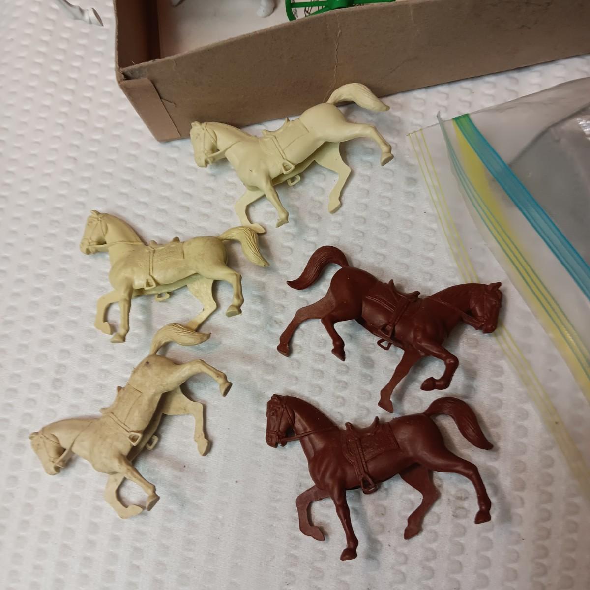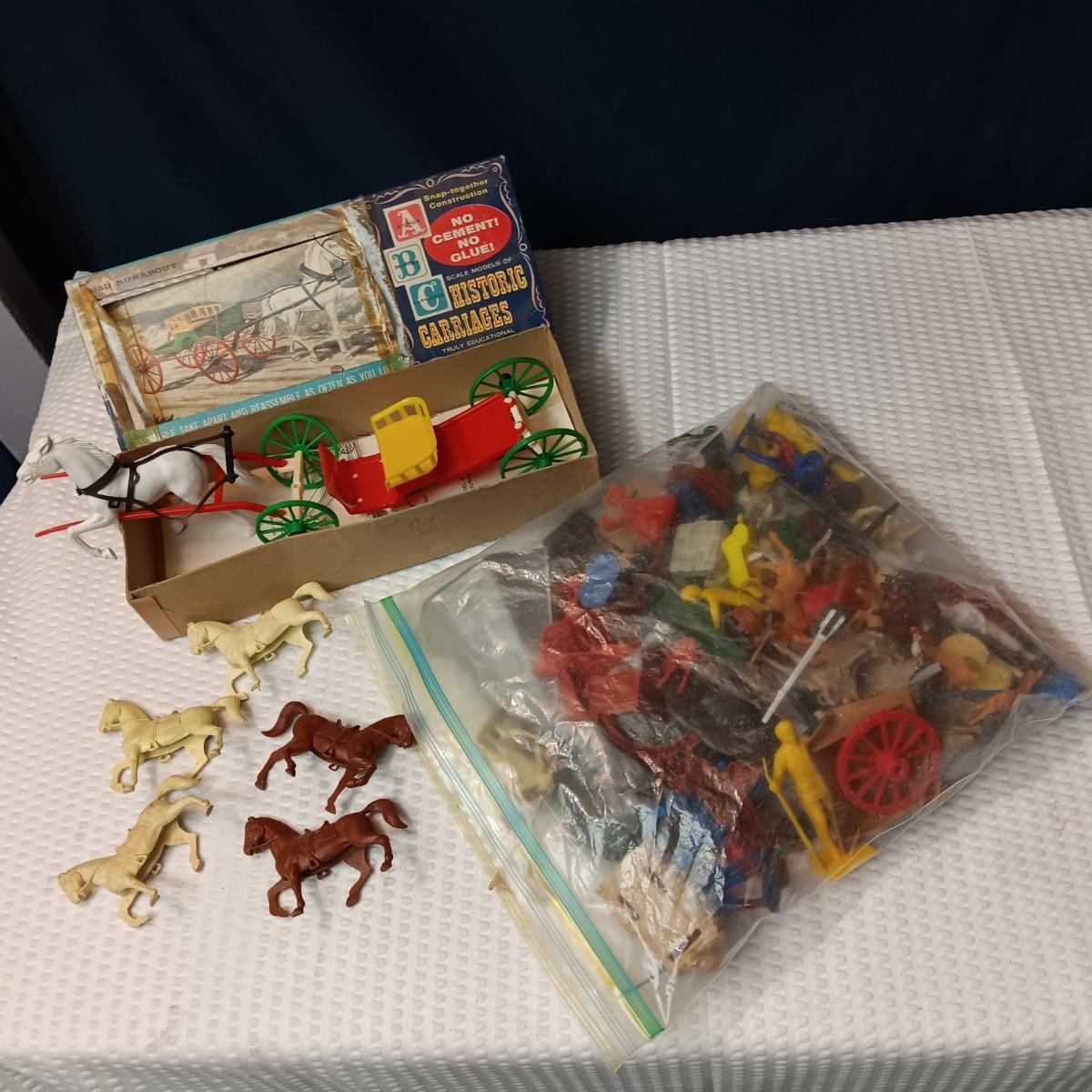 LARGE BAG FULL OF WESTERN PLAY FIGURES, HORSES AND CARRIAGE