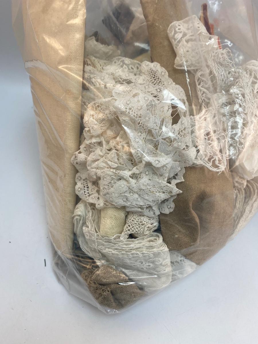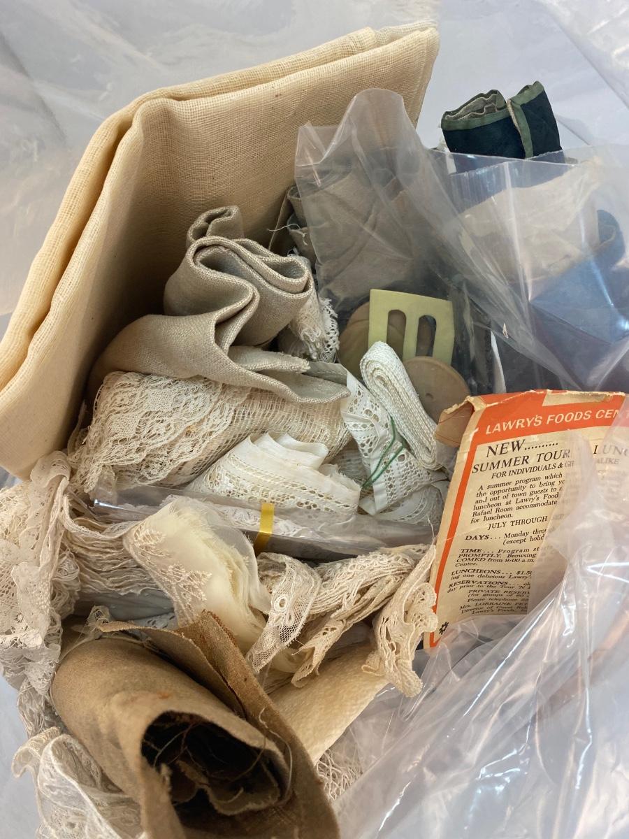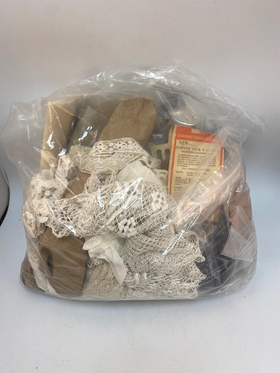 Large Bag of Mixed Vintage Lace, Sewing Notions, & Linens. See photos. Everything in vintage condition, may have discolor.