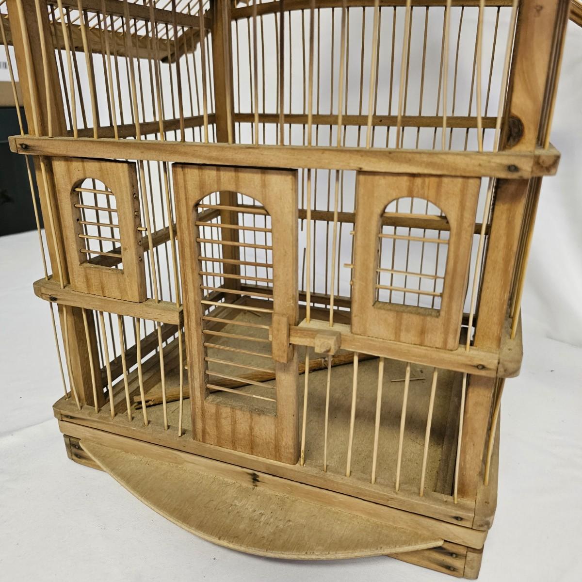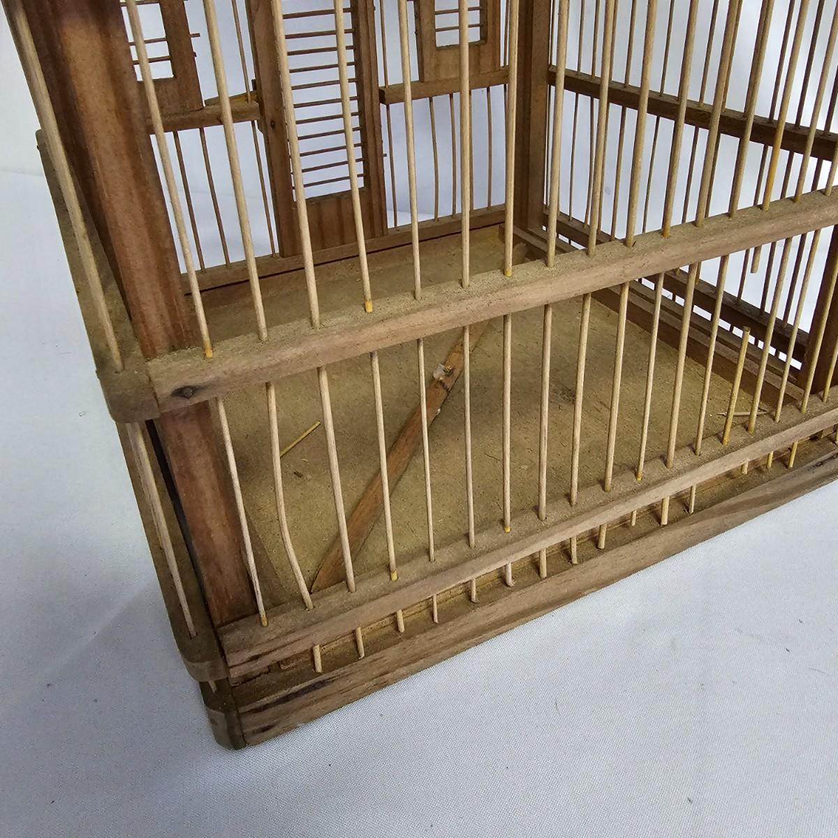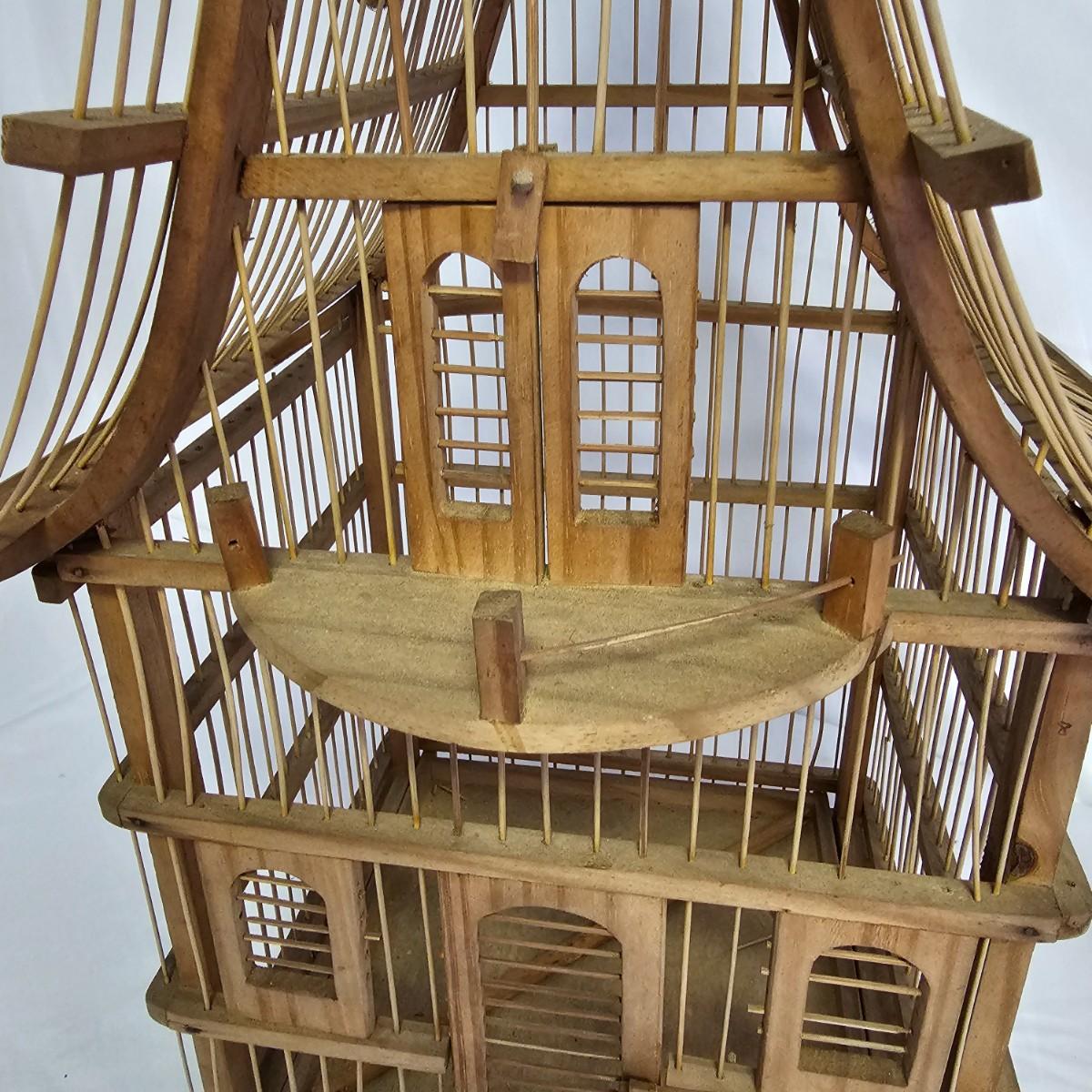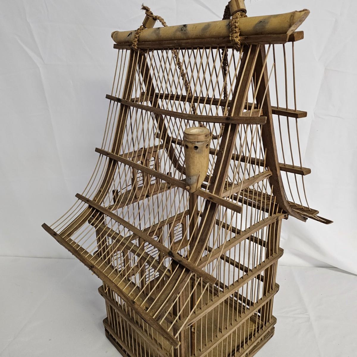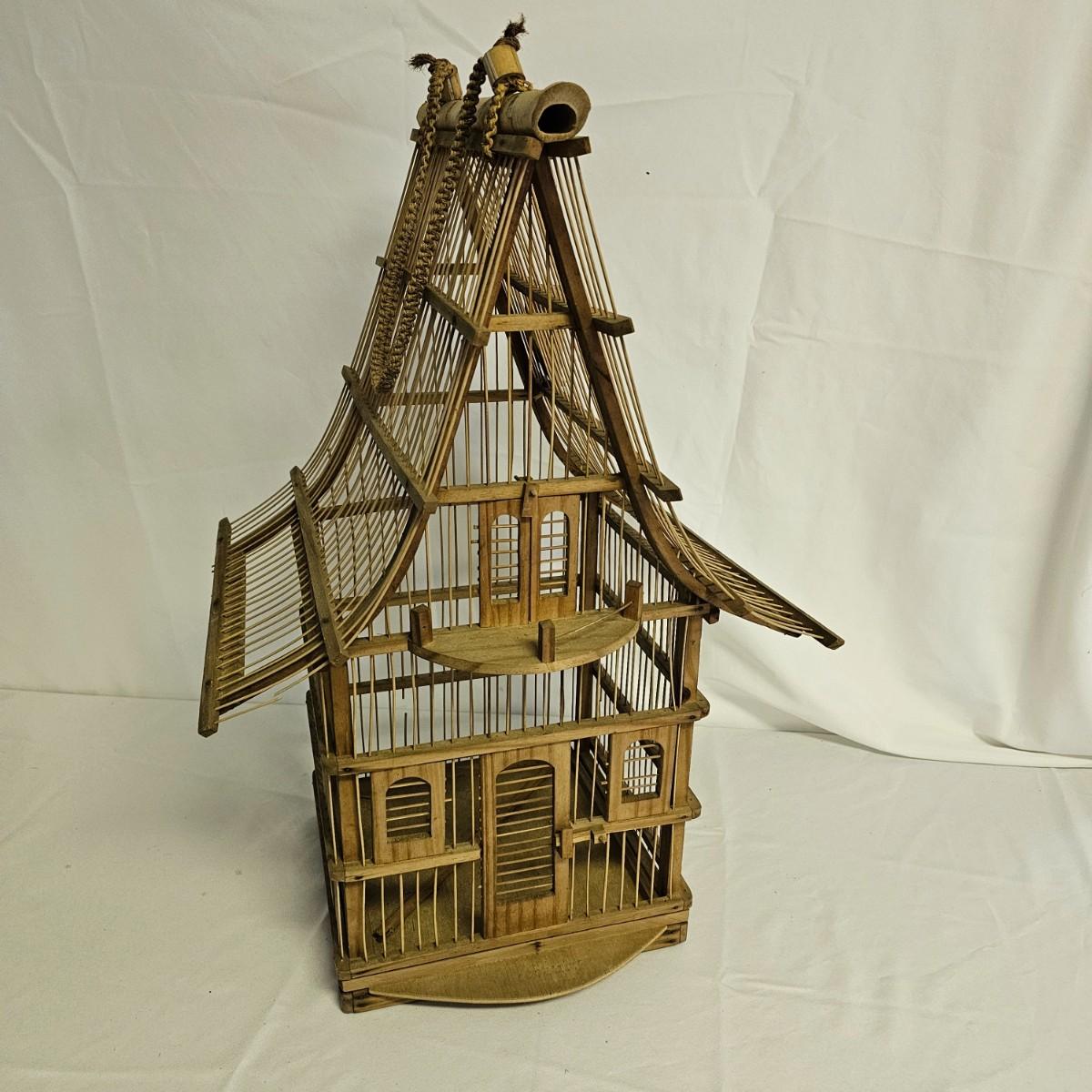 Vintage bamboo bird cage. Opening doors, slatted sides and roof. One perch included. Removable base tray for cleaning. Some small pieces missing. Cage measures 19" x 17" x 29"H, has braided hanging rope at top. See photos for details. Shipping available. Shipping can be costly. We suggest contacting our preferred local shipping provider, Postage Express, with dimensions and getting an estimate before bidding: (828) 670-5501 or postageexpress@yahoo.com.