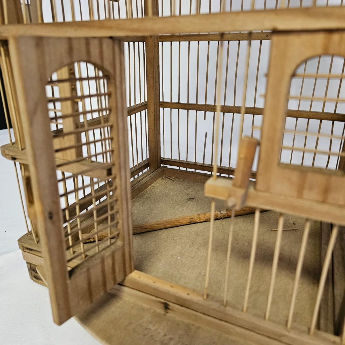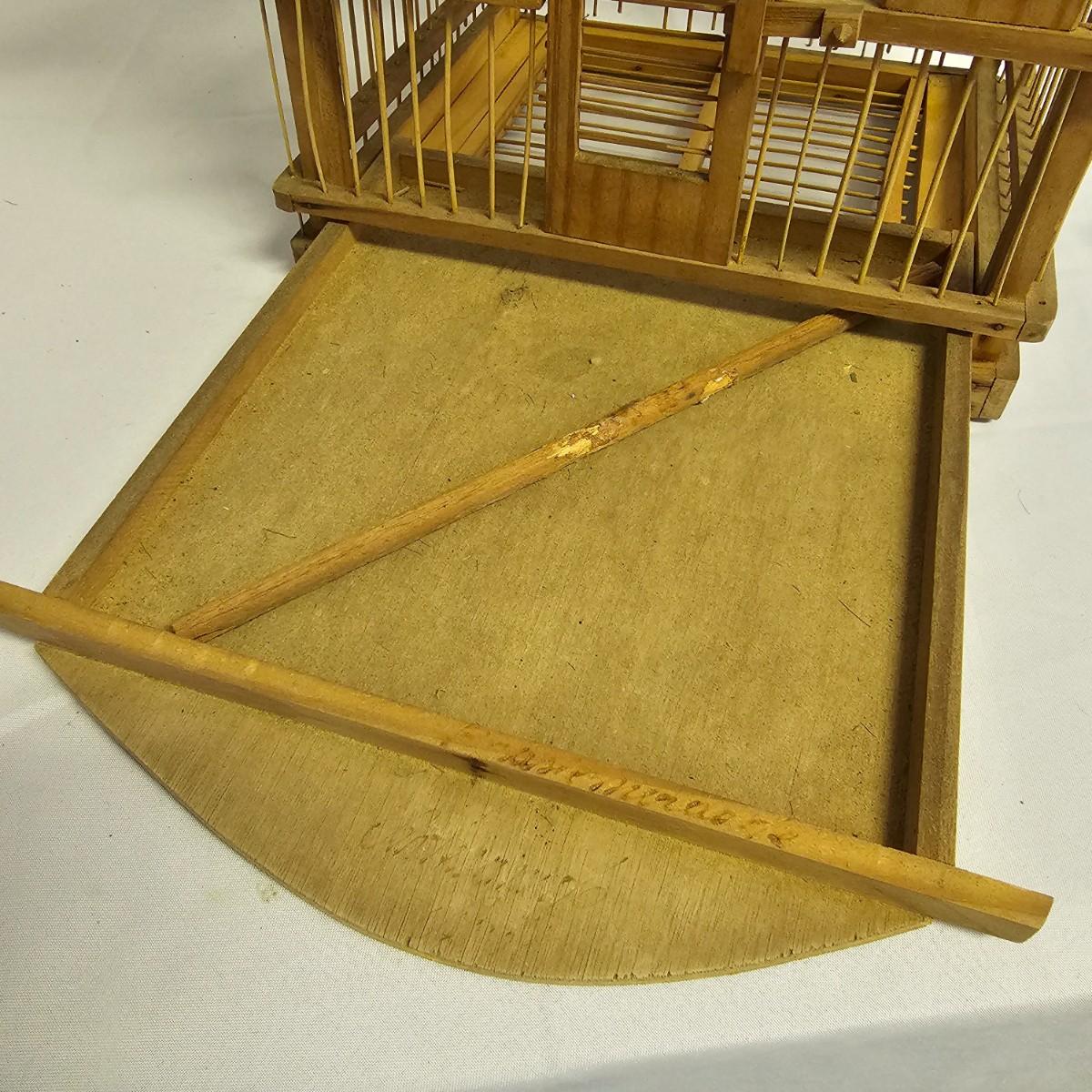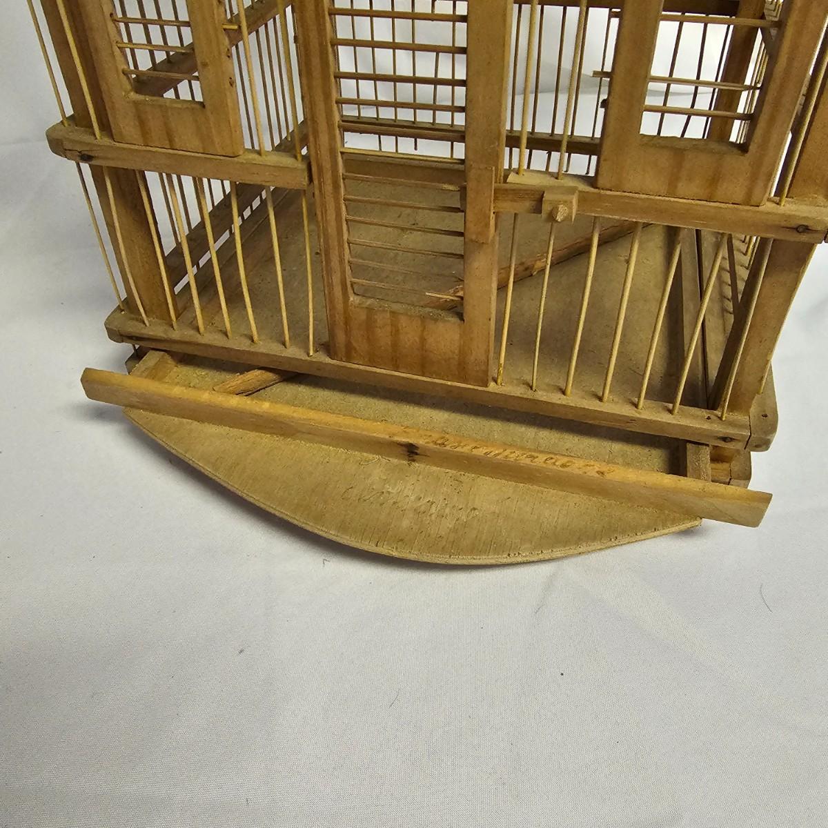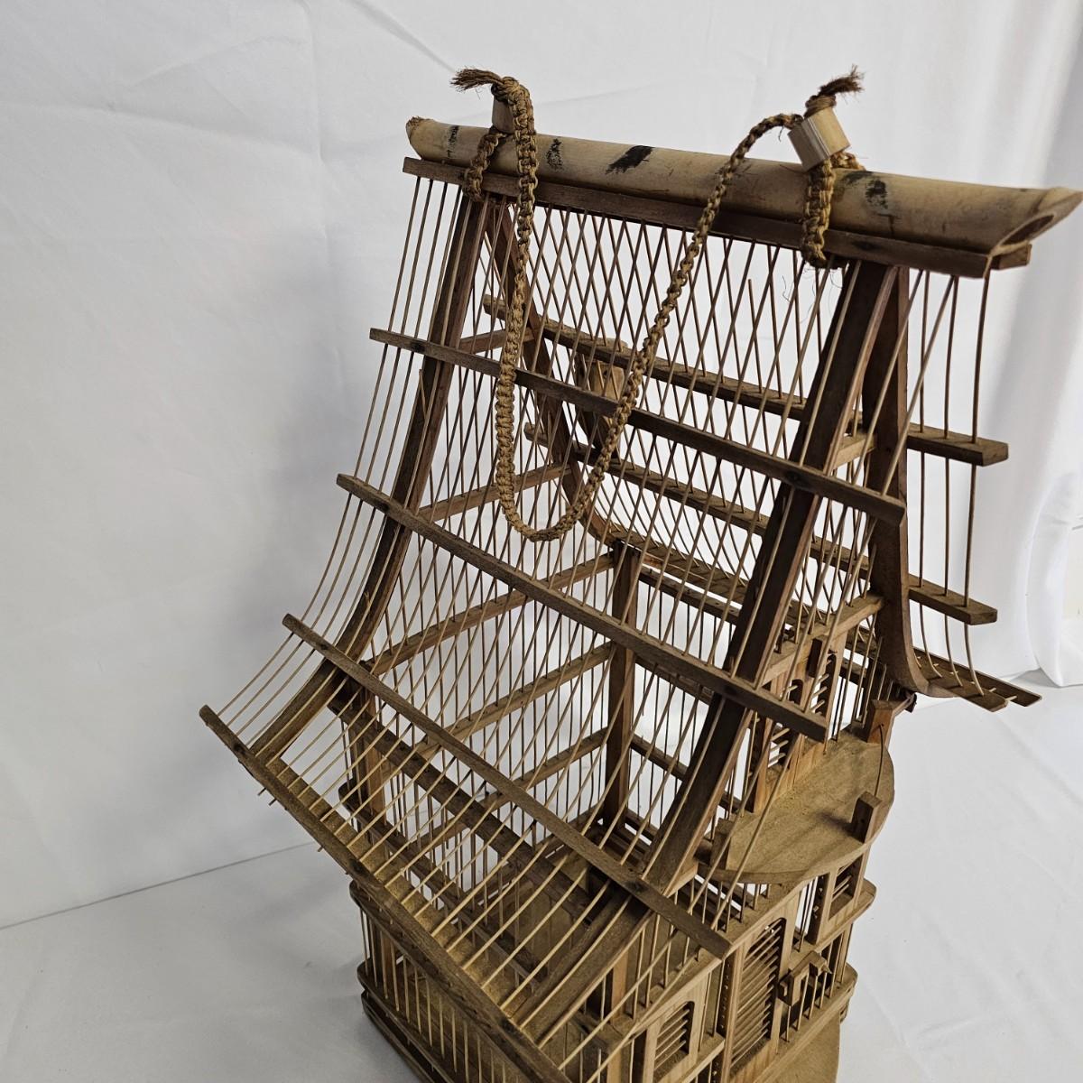 Vintage bamboo bird cage. Opening doors, slatted sides and roof. One perch included. Removable base tray for cleaning. Some small pieces missing. Cage measures 19" x 17" x 29"H, has braided hanging rope at top. See photos for details. Shipping available. Shipping can be costly. We suggest contacting our preferred local shipping provider, Postage Express, with dimensions and getting an estimate before bidding: (828) 670-5501 or postageexpress@yahoo.com.
