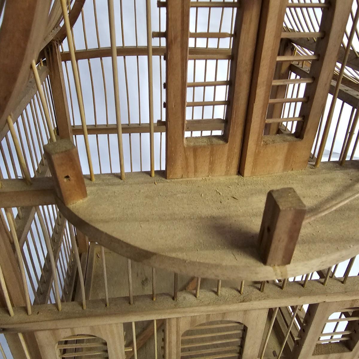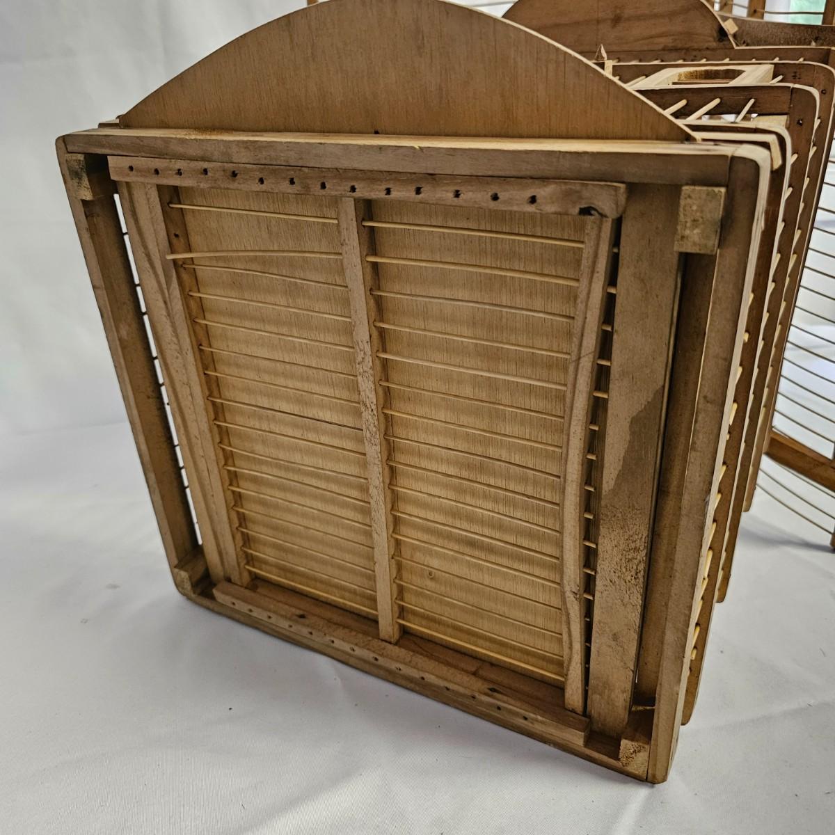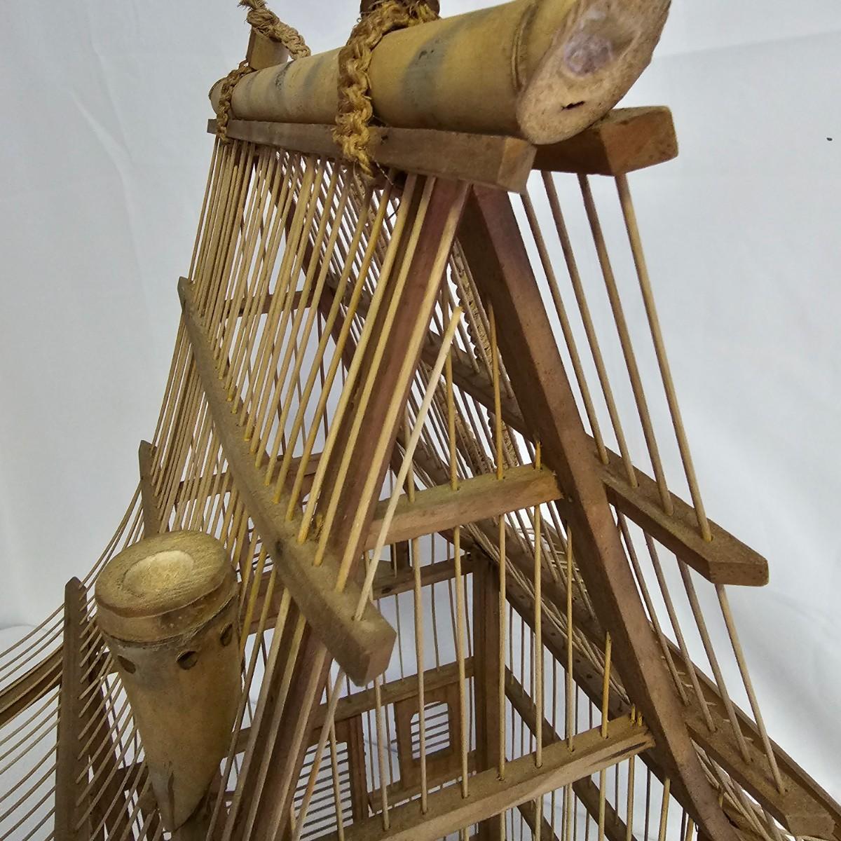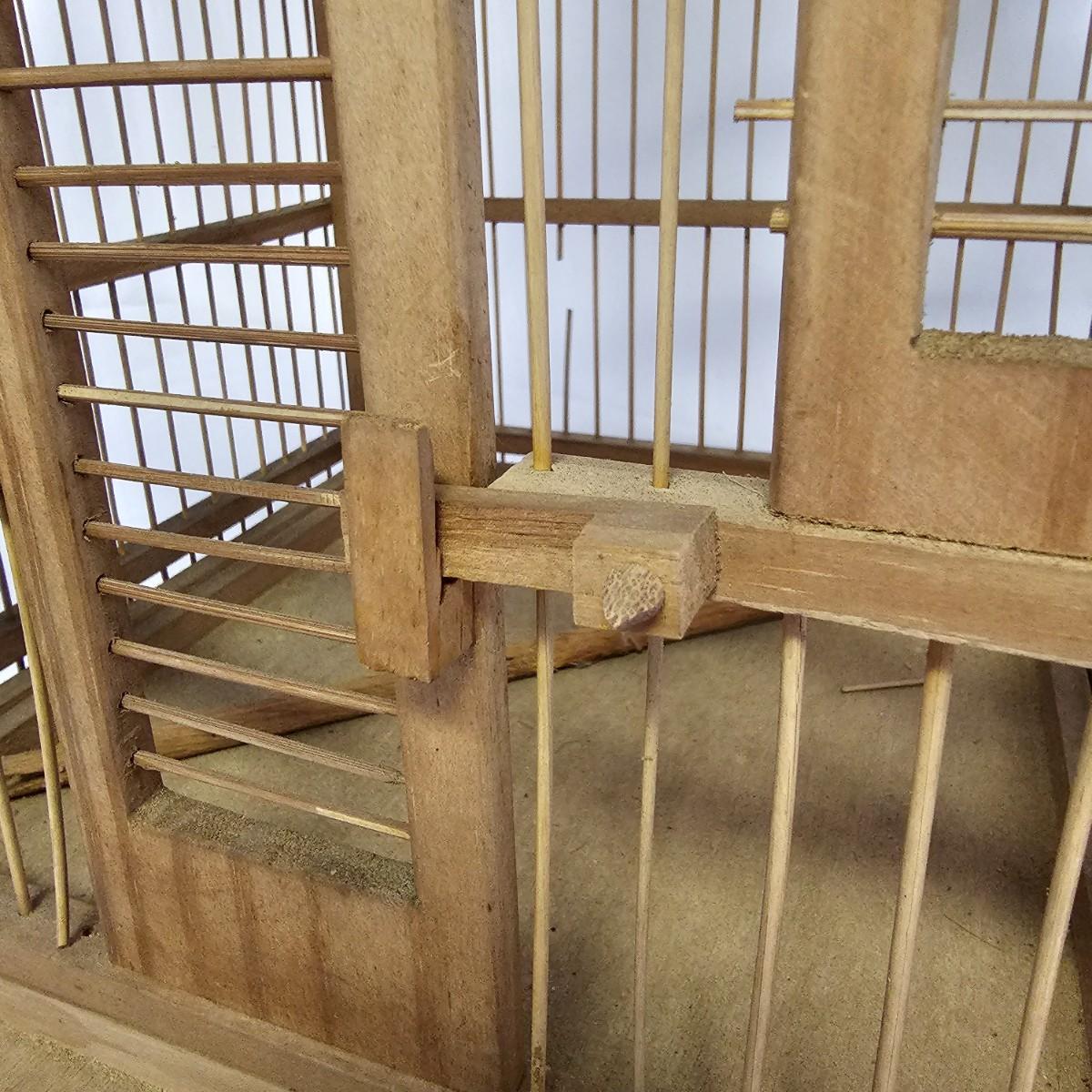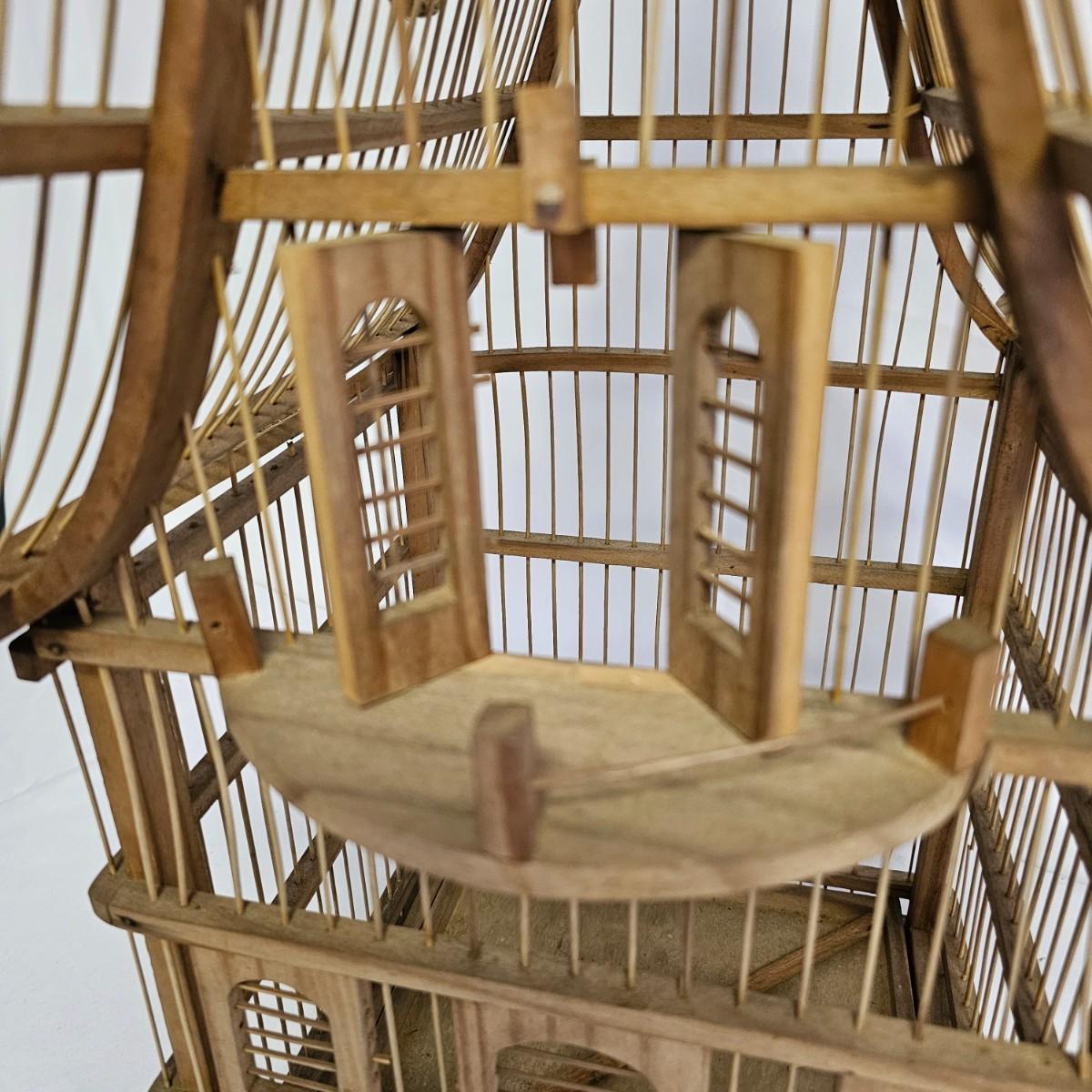 Vintage bamboo bird cage. Opening doors, slatted sides and roof. One perch included. Removable base tray for cleaning. Some small pieces missing. Cage measures 19" x 17" x 29"H, has braided hanging rope at top. See photos for details. Shipping available. Shipping can be costly. We suggest contacting our preferred local shipping provider, Postage Express, with dimensions and getting an estimate before bidding: (828) 670-5501 or postageexpress@yahoo.com.