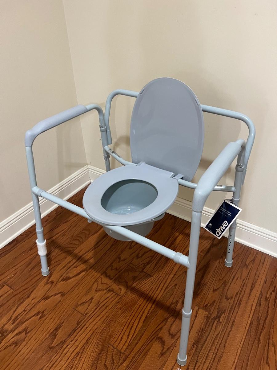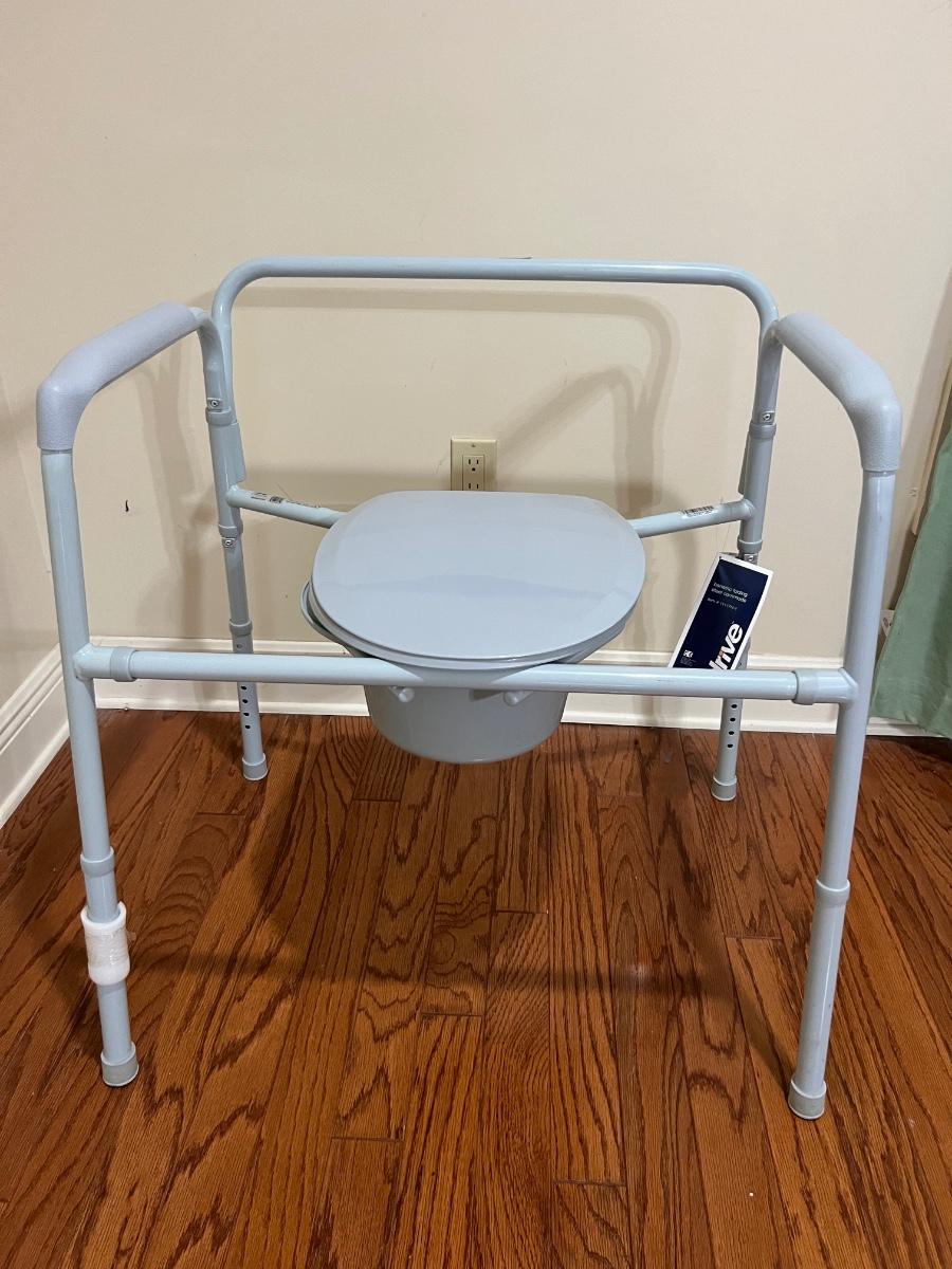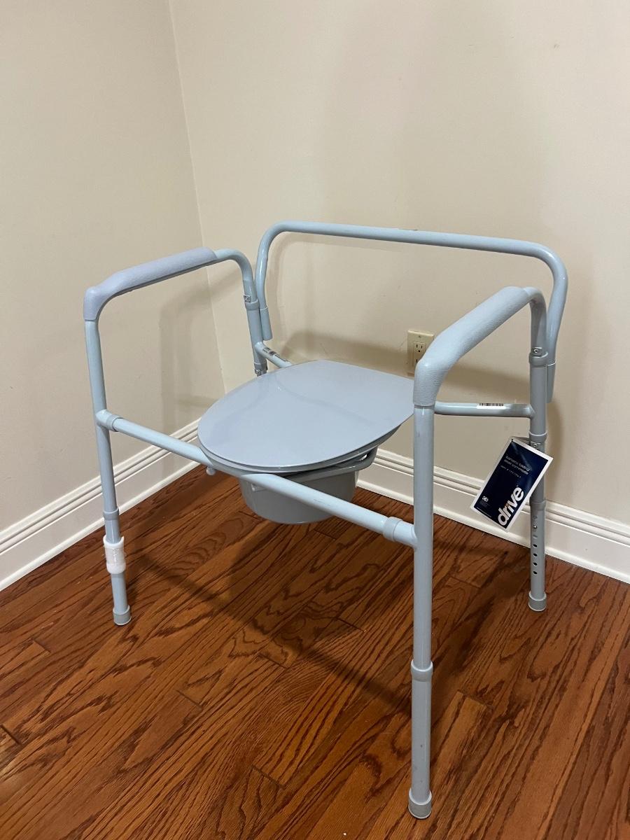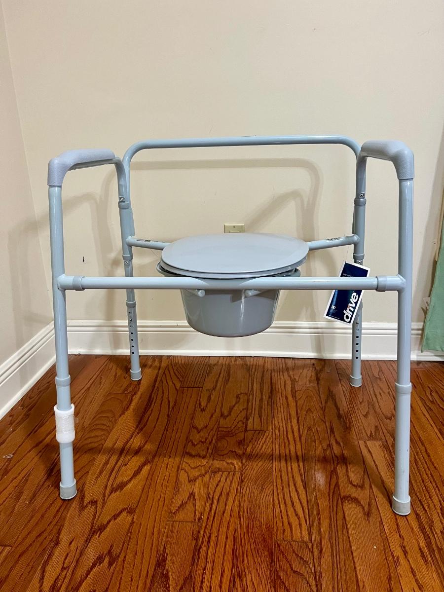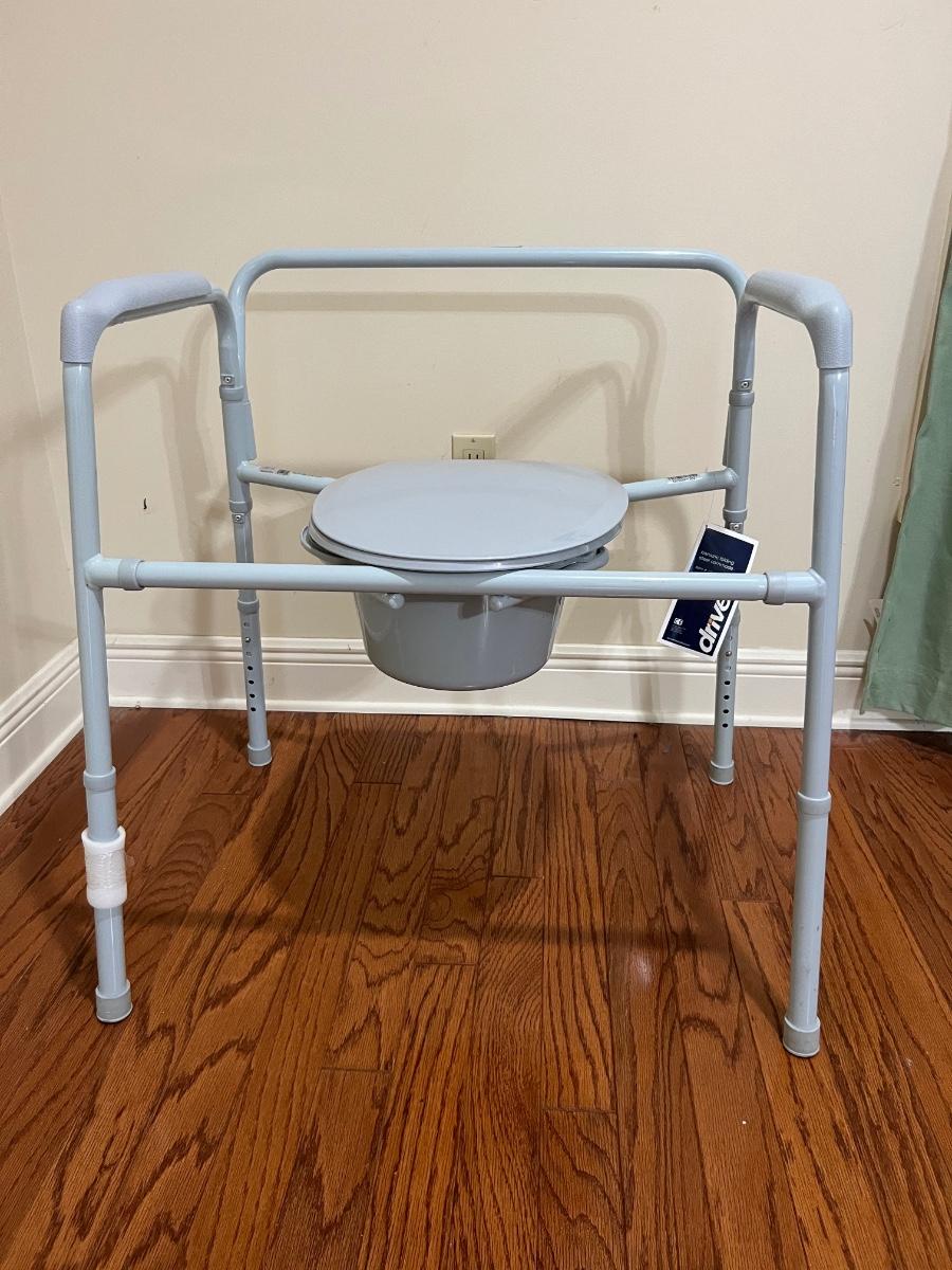 Adjustable bariatric folding steel commode that can hold up to 650 pounds This can be adjusted to your liking, but as pictured measures 31 inches tall, 29 inches wide and 21 inches deep.