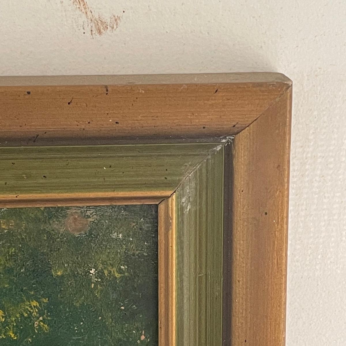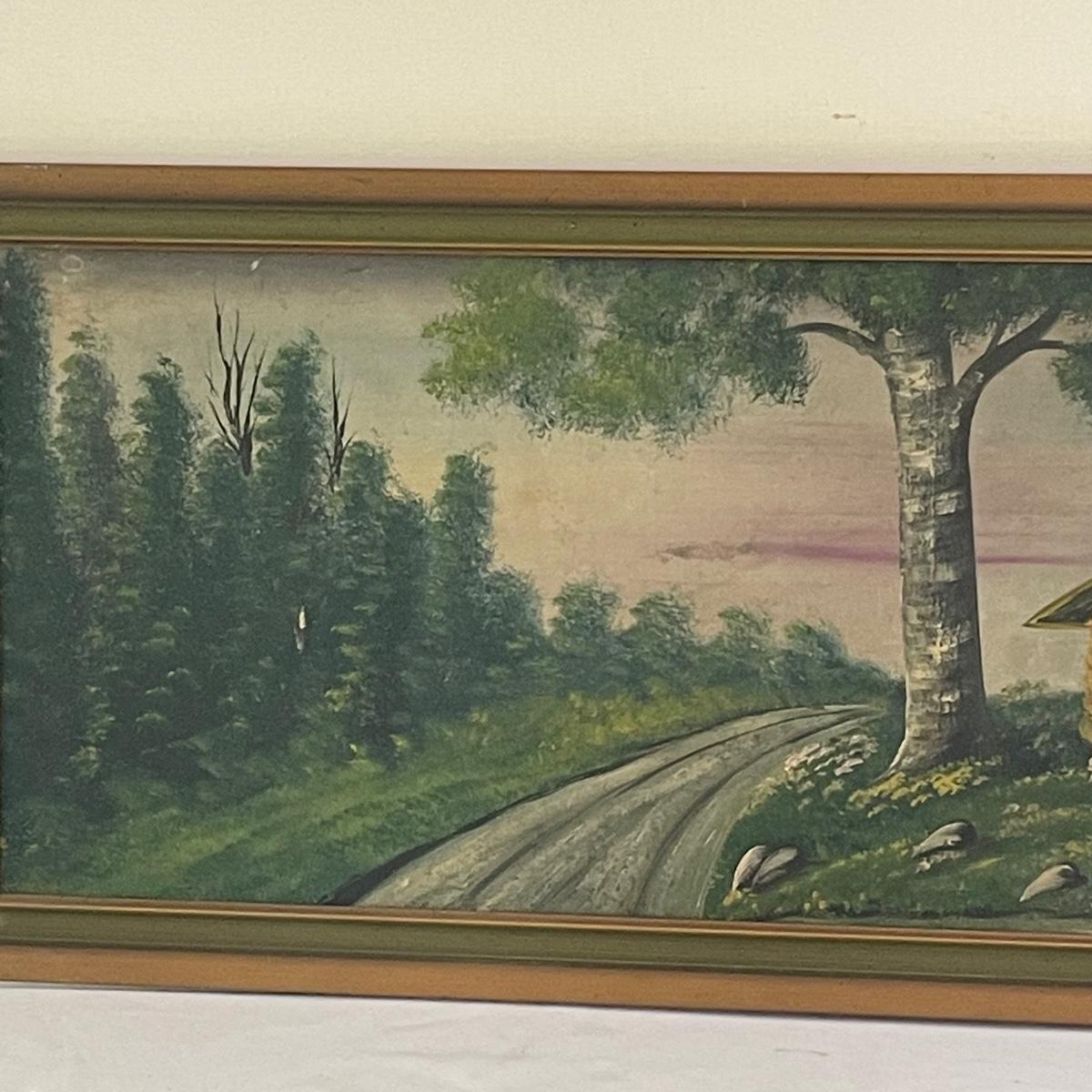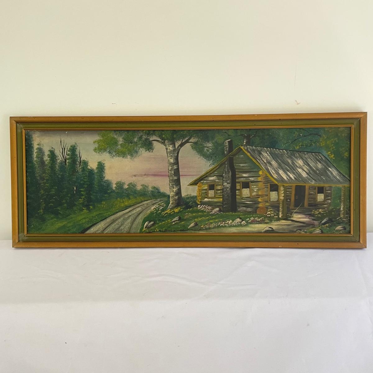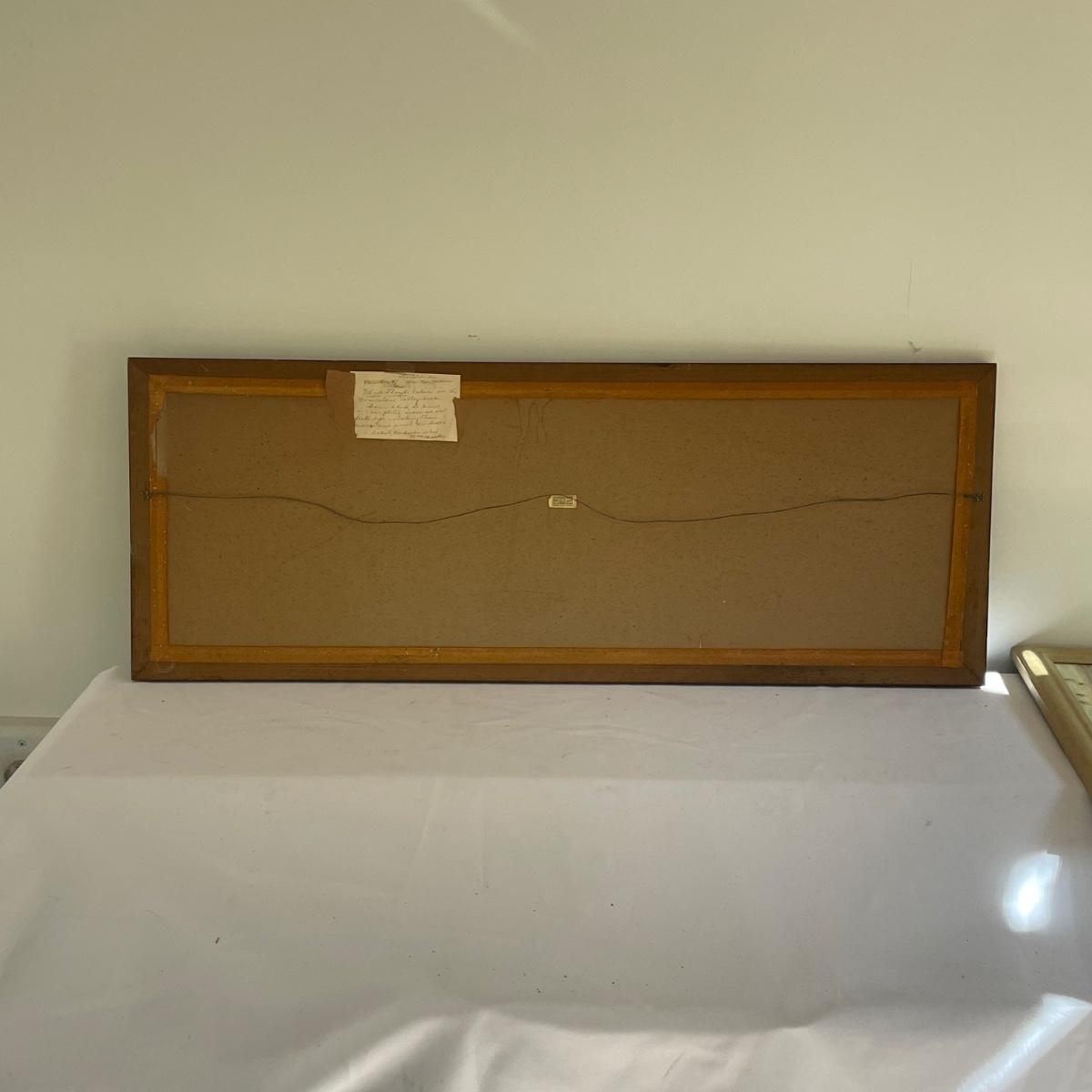This large painting appears to be an unsigned original acrylic piece; there is some artist information on the back, see image. Frame is wood and measures 38.5” x 14.5” x 0.75”.