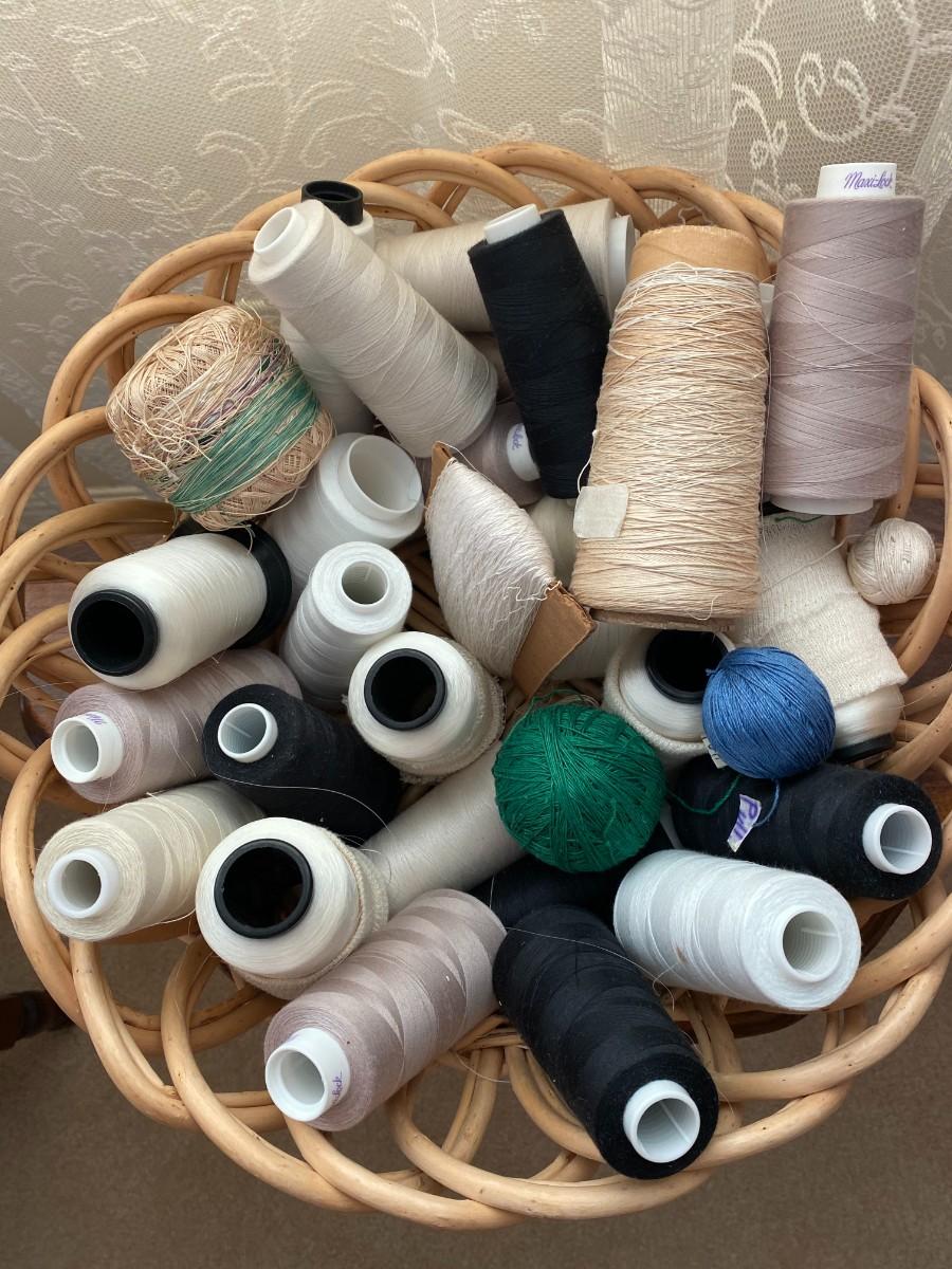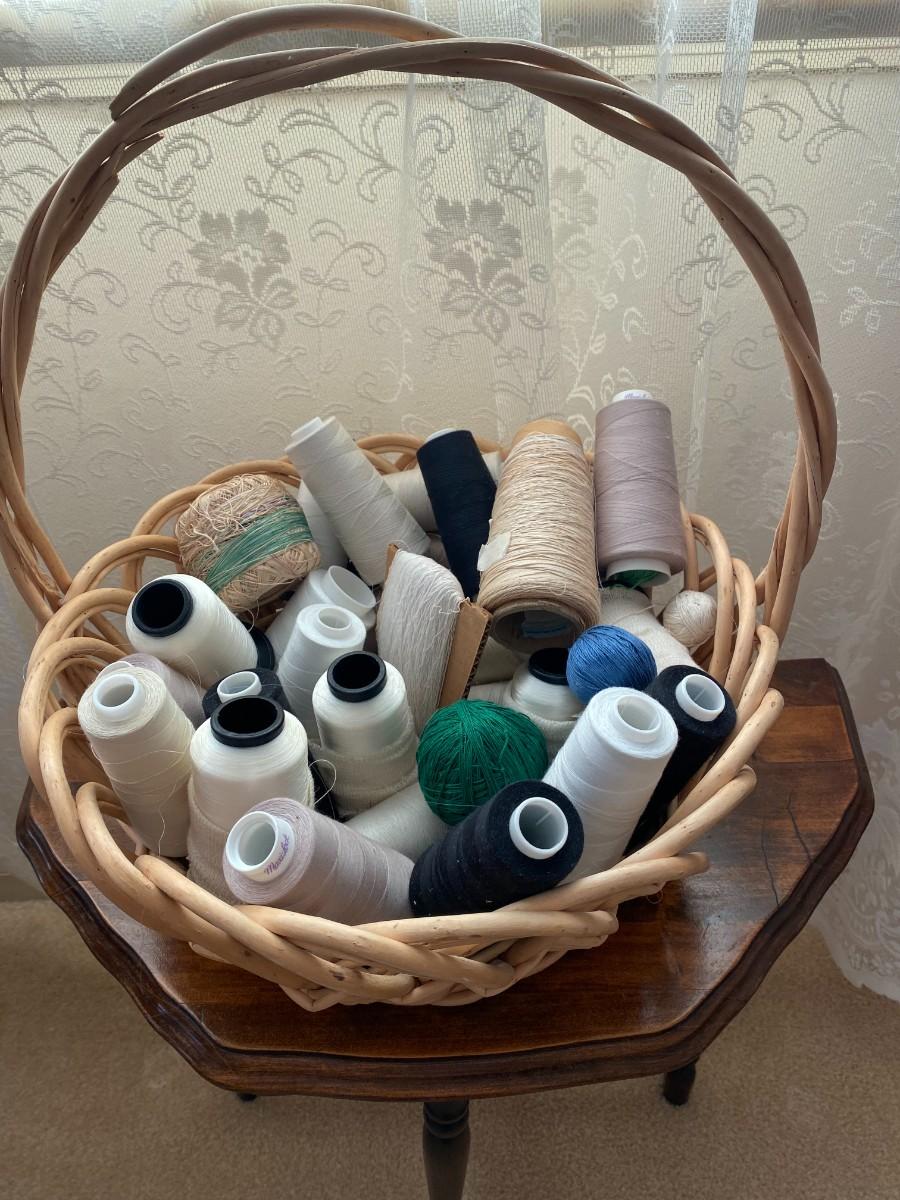 Large basket of sewing machine thread, basket included. Basket is approx. 15-1/2" W.