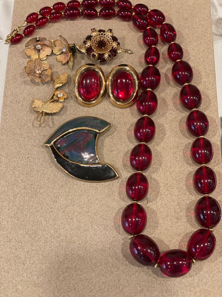Large bead necklace, earrings and brooches