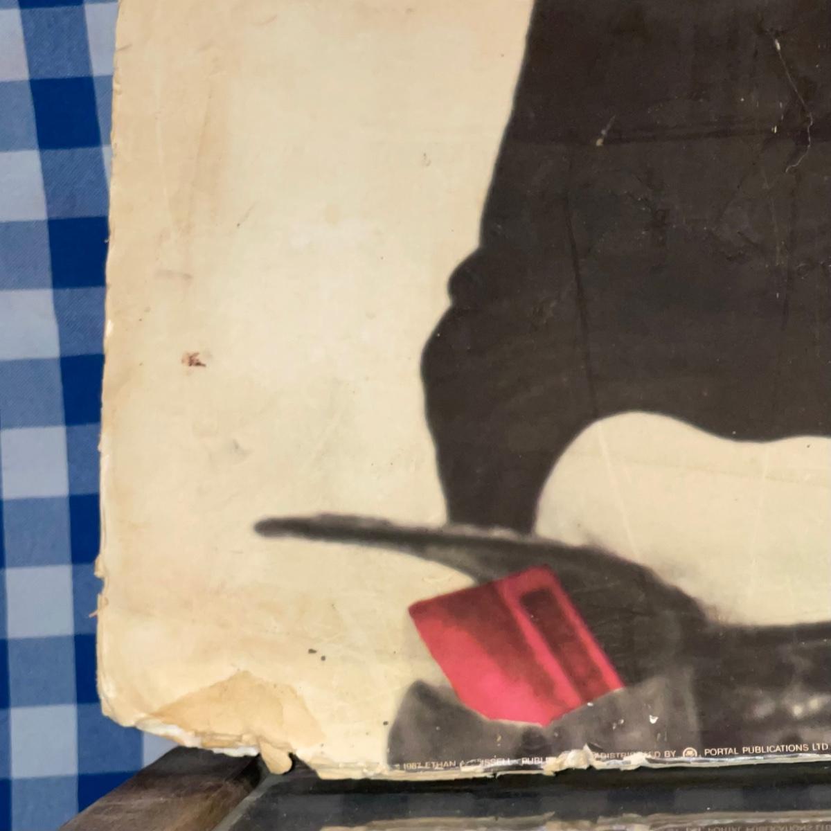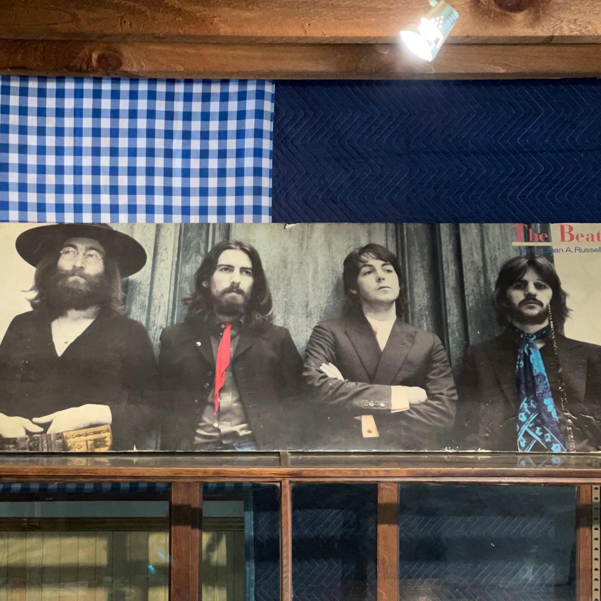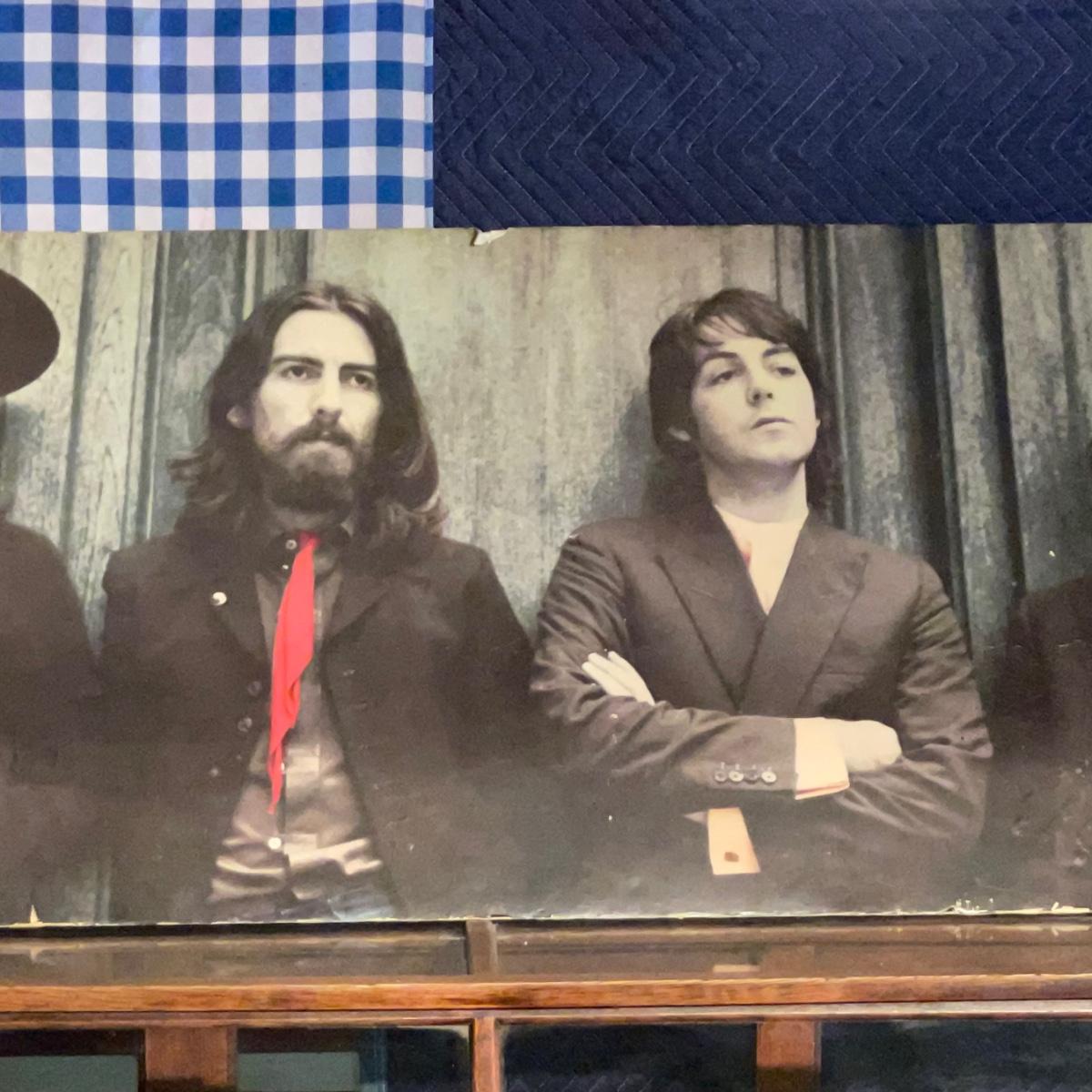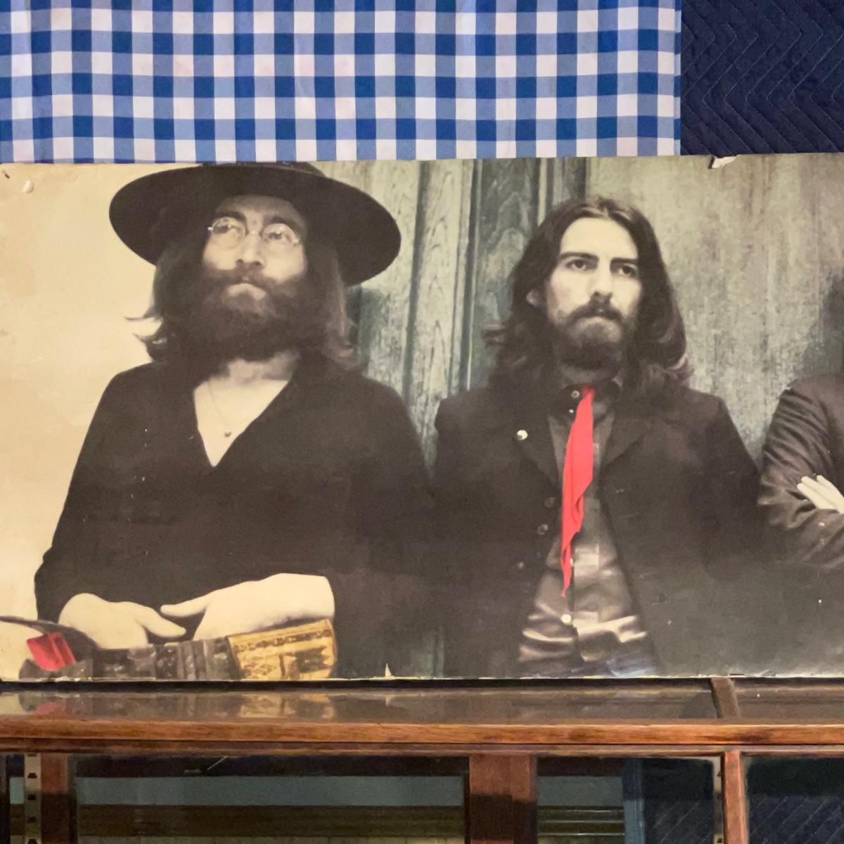 Large poster of The Beatles measuring 26 inches x 74 inches. The poster is fitted and attached to poster board, the back has some discoloration, tape, and water damage. The edges of the poster have wear and damage as well. It says “The Beatles”, “Dear Mr. Fantasy Ethan A Russell photographs”.