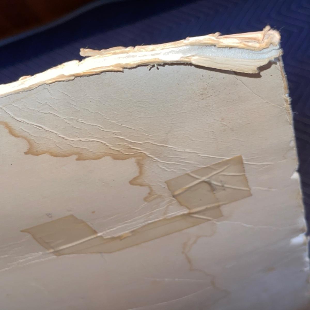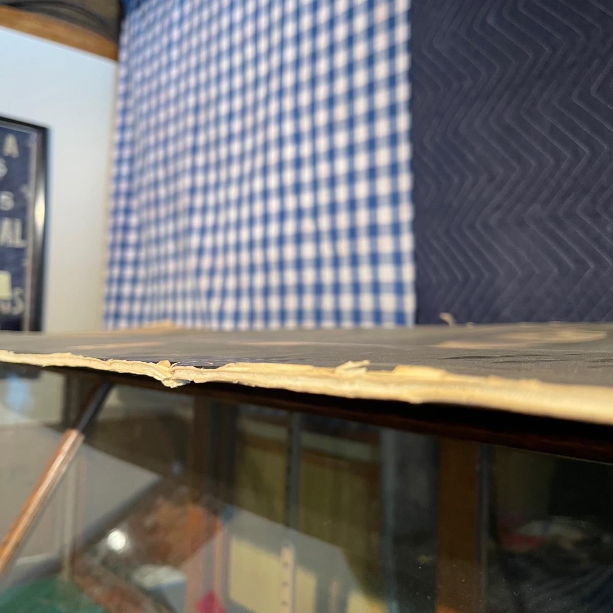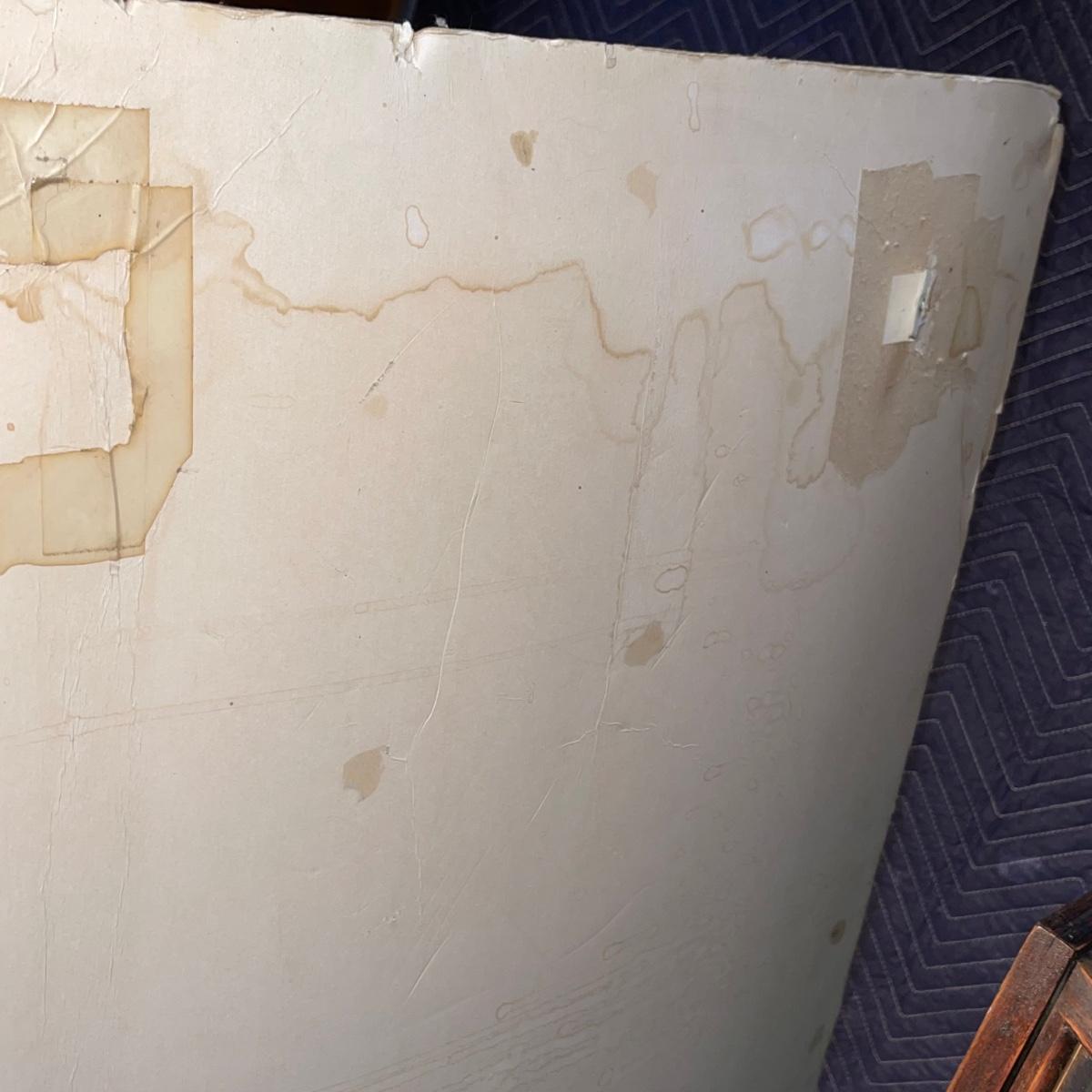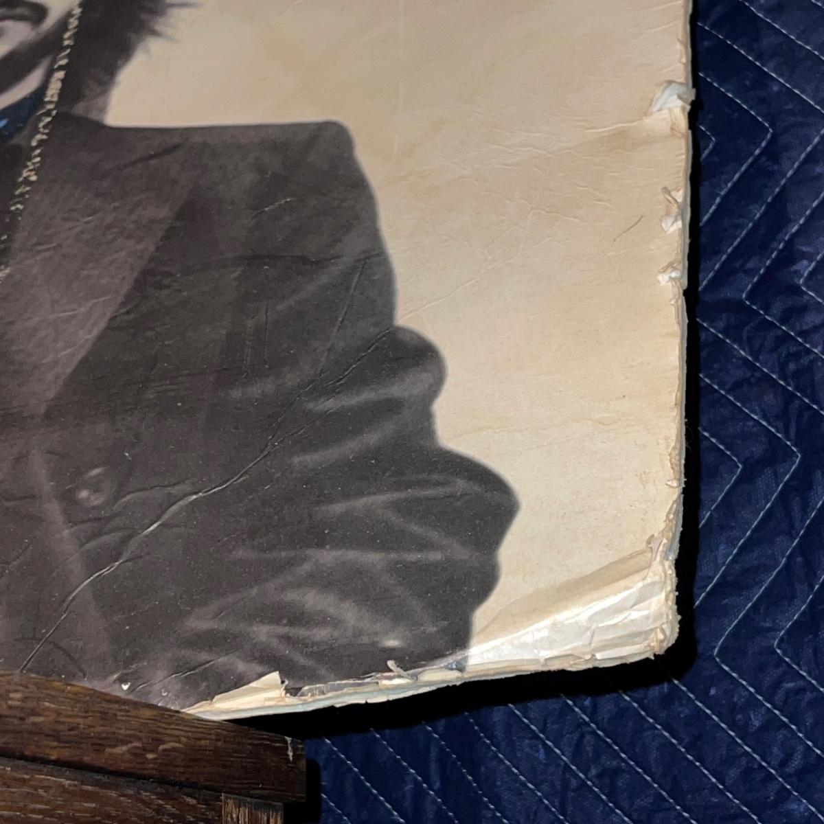 Large poster of The Beatles measuring 26 inches x 74 inches. The poster is fitted and attached to poster board, the back has some discoloration, tape, and water damage. The edges of the poster have wear and damage as well. It says “The Beatles”, “Dear Mr. Fantasy Ethan A Russell photographs”.