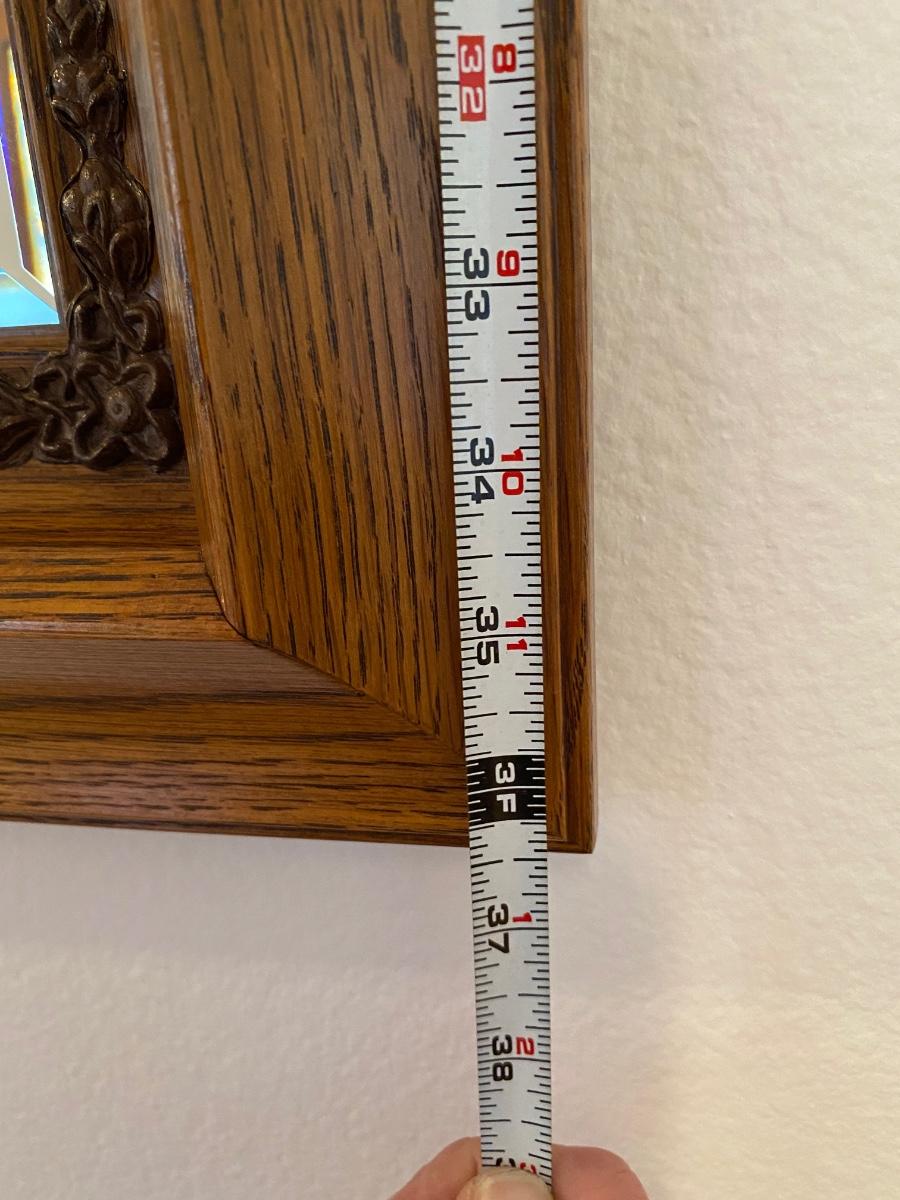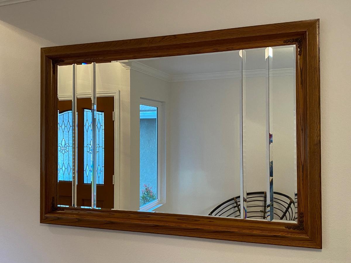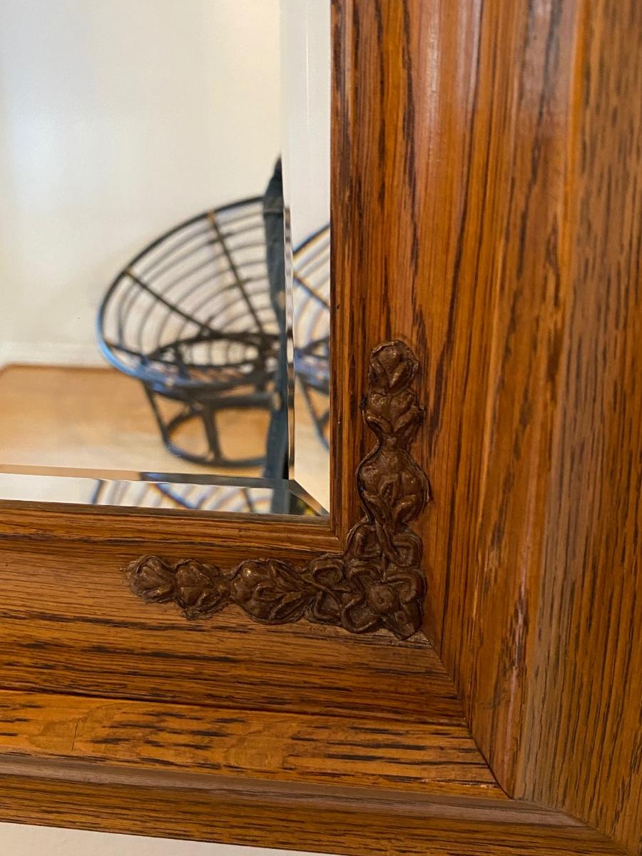 Large, beveled edge wall mirror. Nice oak frame with small floral details in the corners. Mirror is about 3' wide and 5' long. Did not remove from wall, but it looks heavy.
