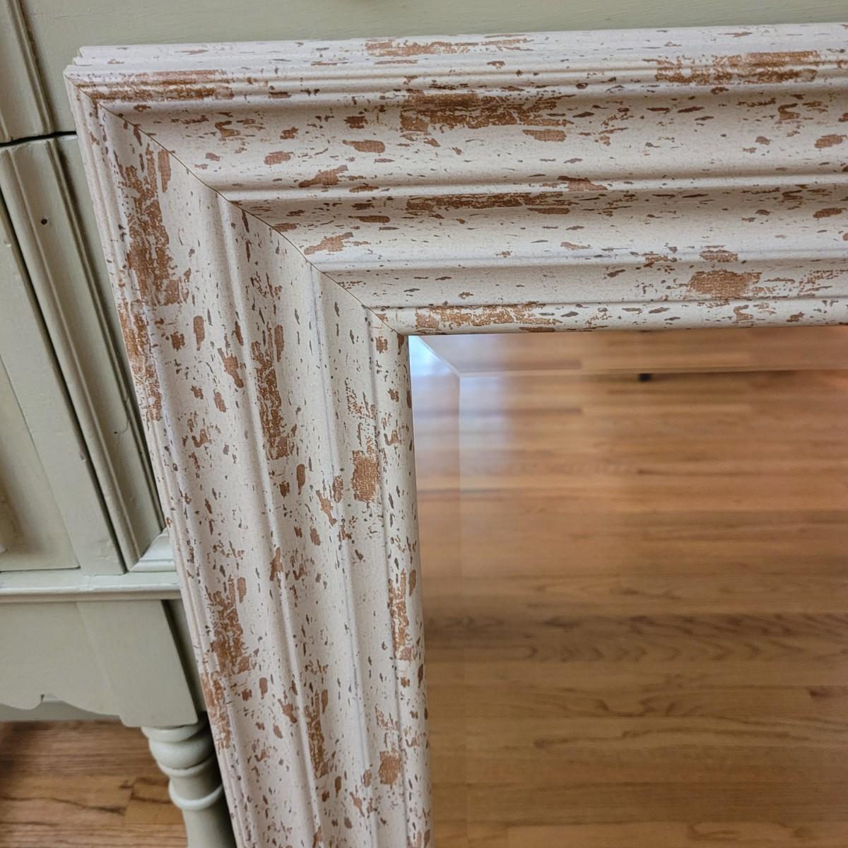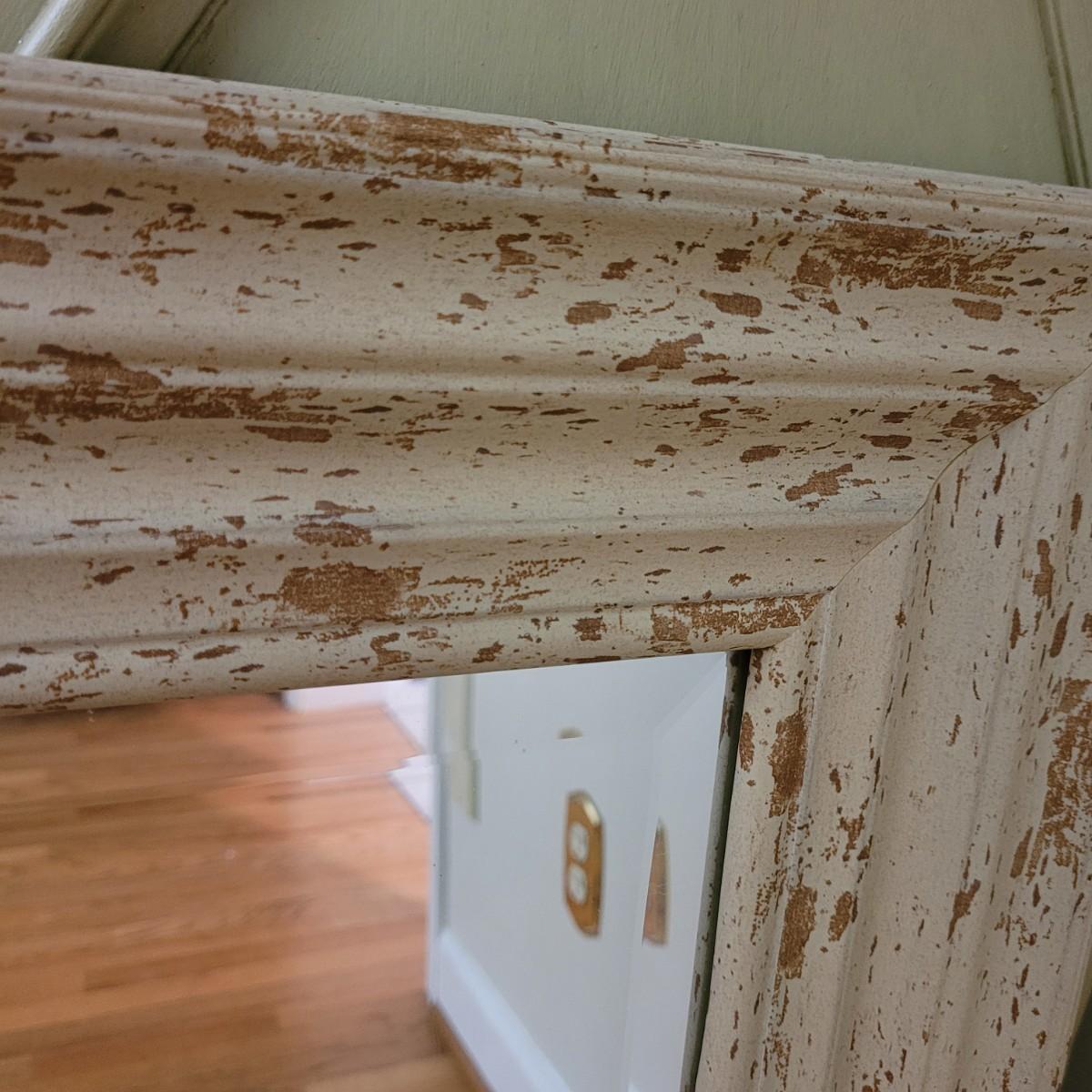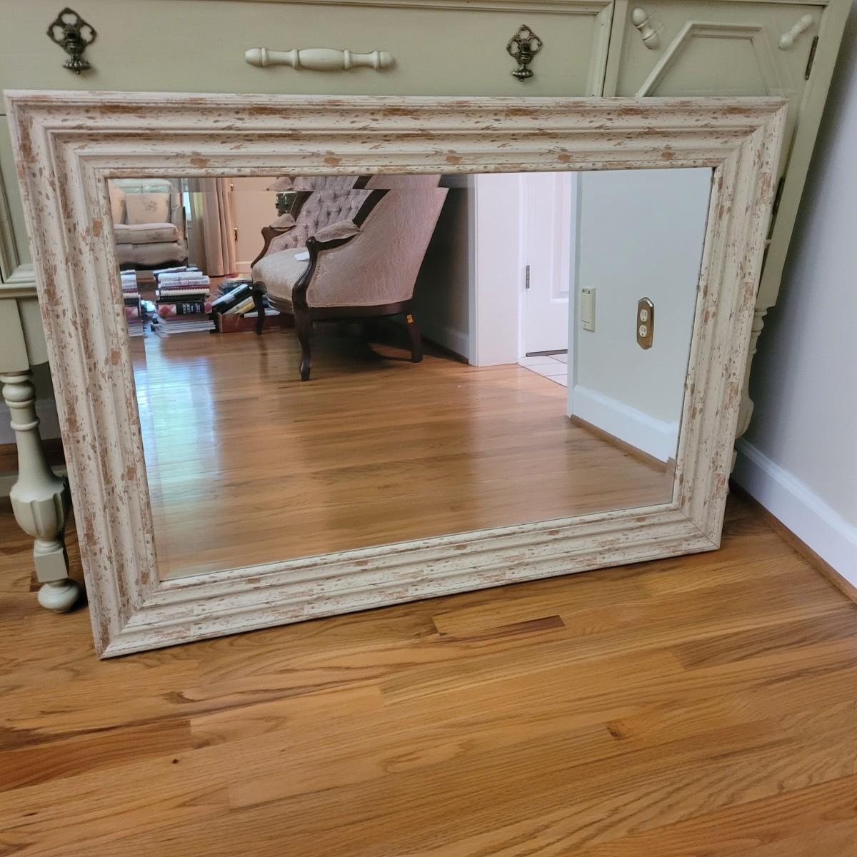 Large beveled mirror with plastic frame that has a distressed wood appearance. It can hang horizontally or vertically. Measures approximately 43.5" x 32". Local pickup only.