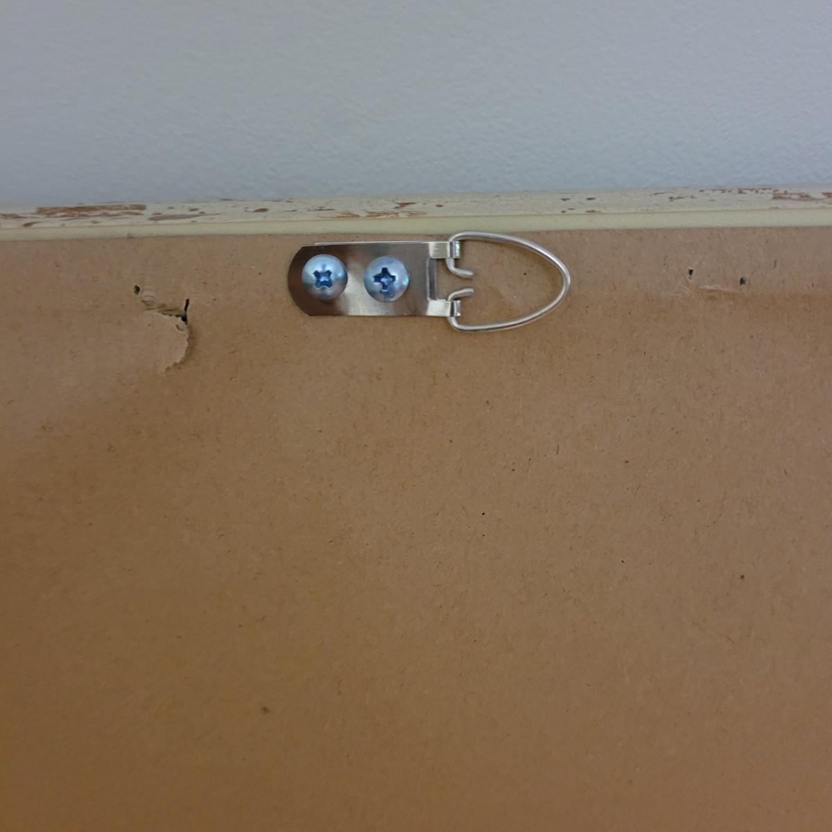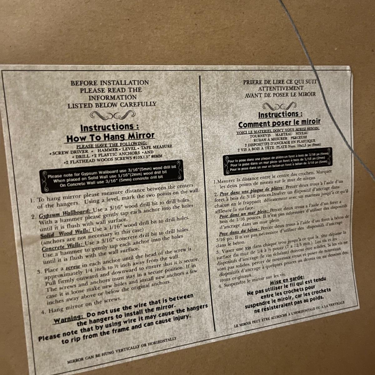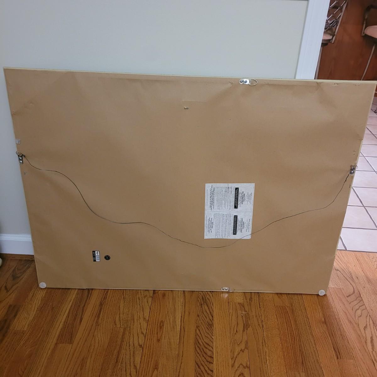 Large beveled mirror with plastic frame that has a distressed wood appearance. It can hang horizontally or vertically. Measures approximately 43.5" x 32". Local pickup only.