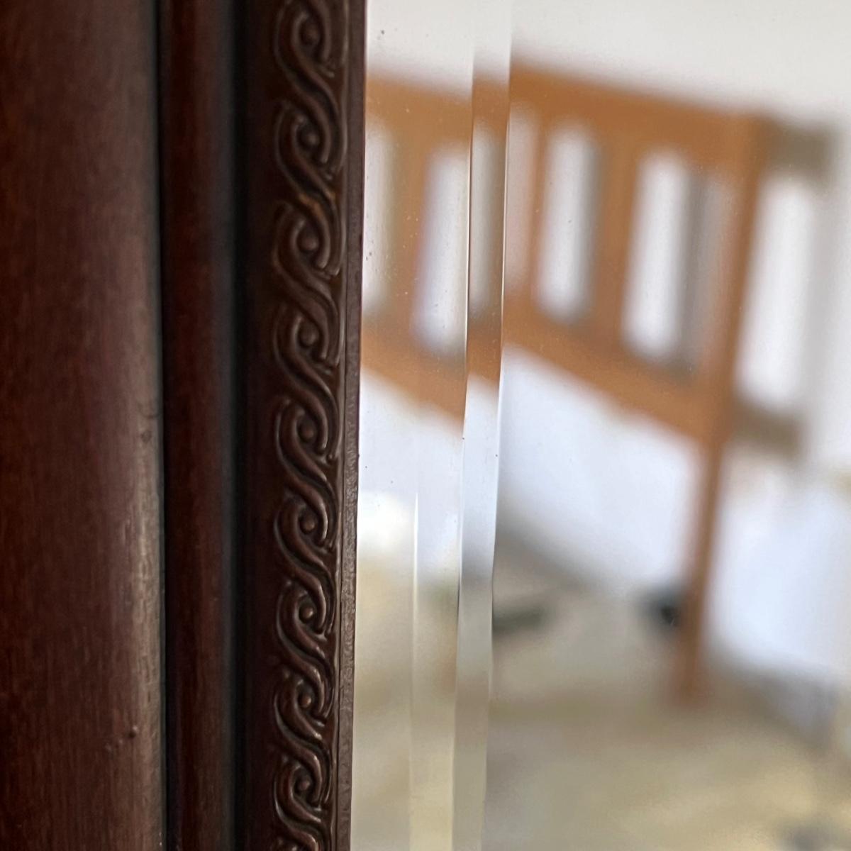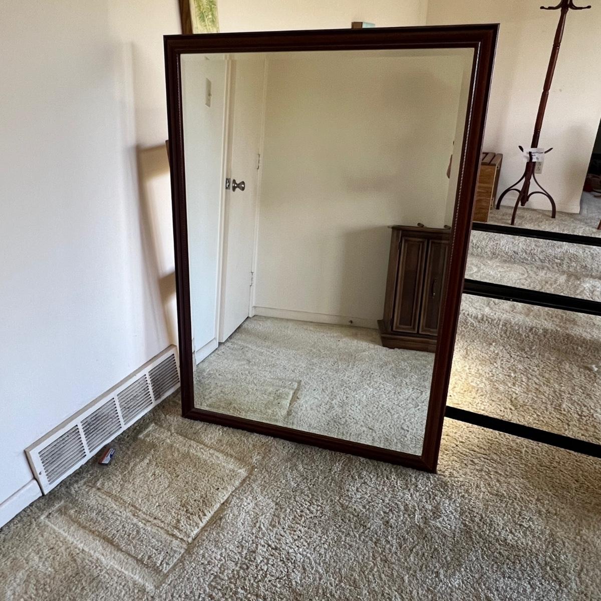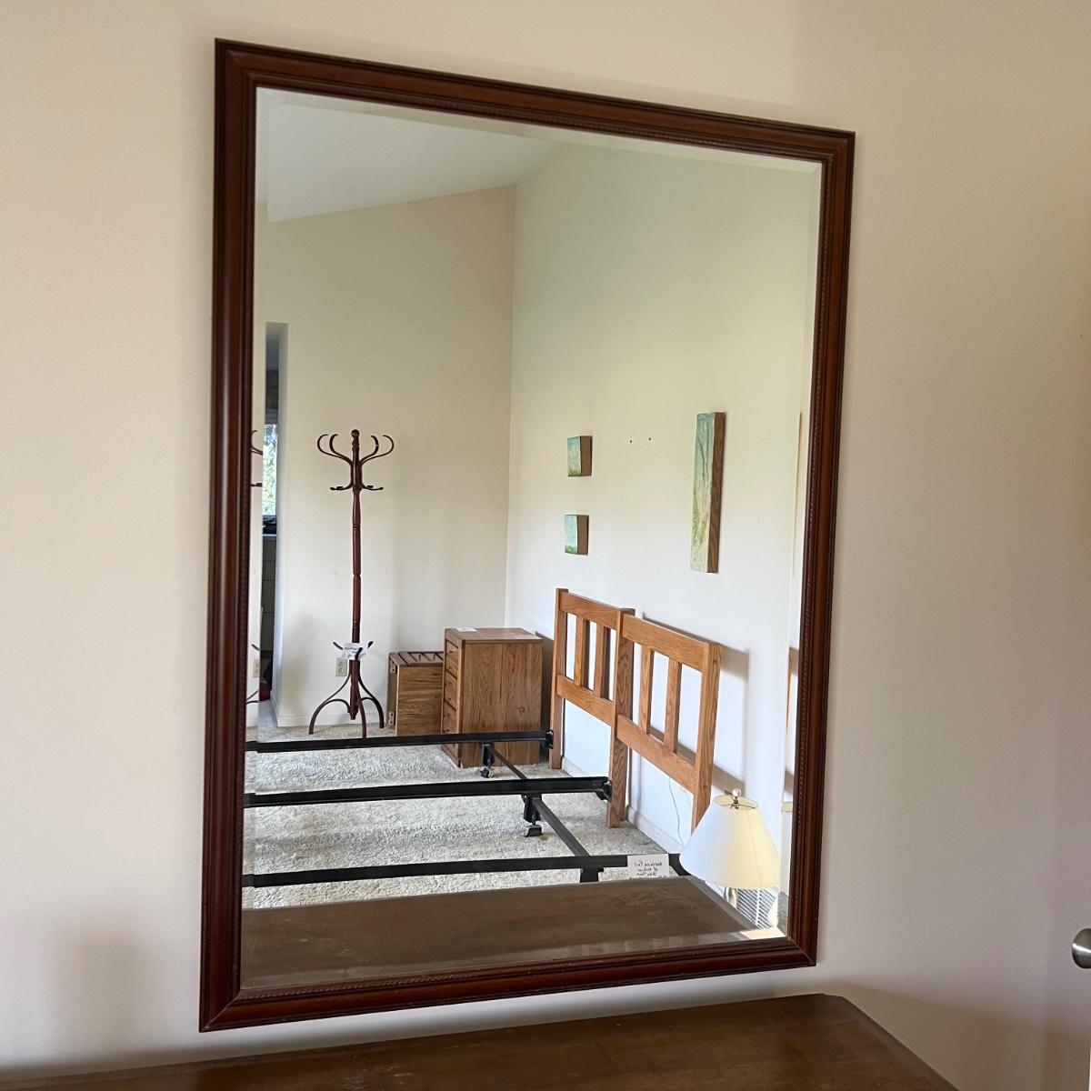 This large beveled mirror has a wooden frame. The hanging hardware is included and has been taken down ready for transport.
