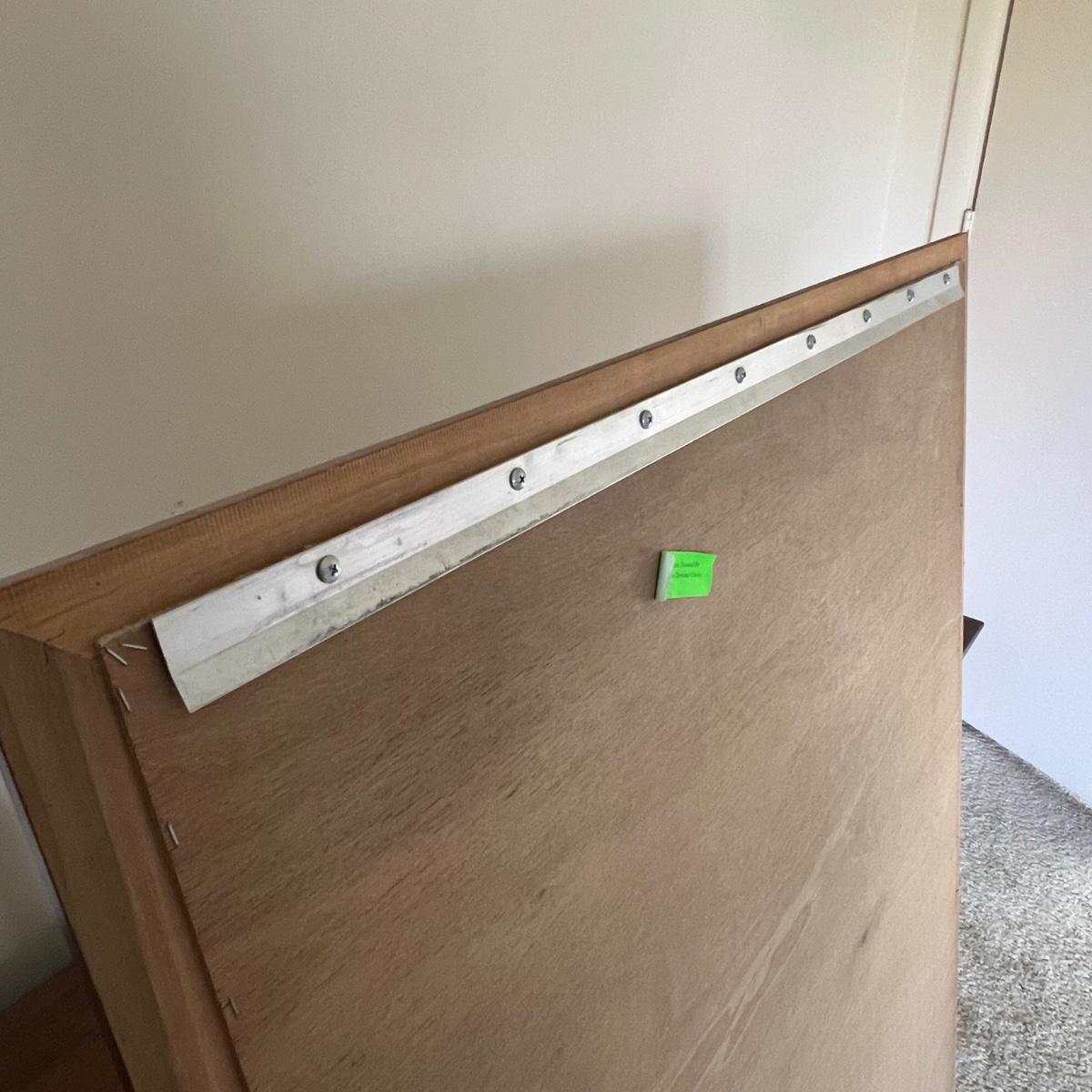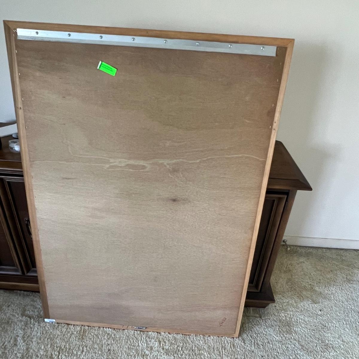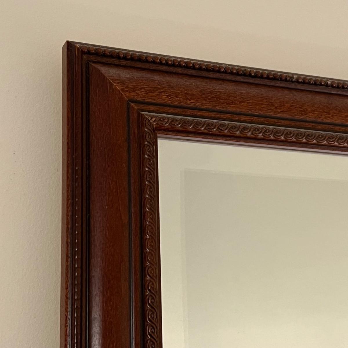 This large beveled mirror has a wooden frame. The hanging hardware is included and has been taken down ready for transport.