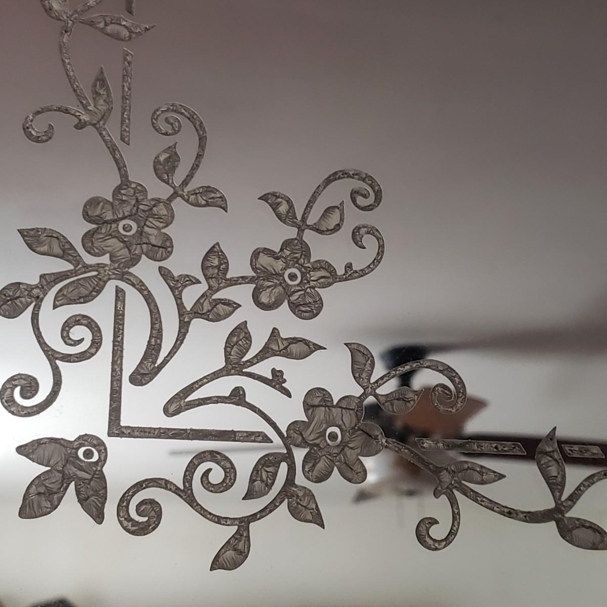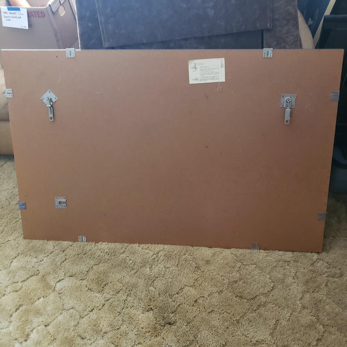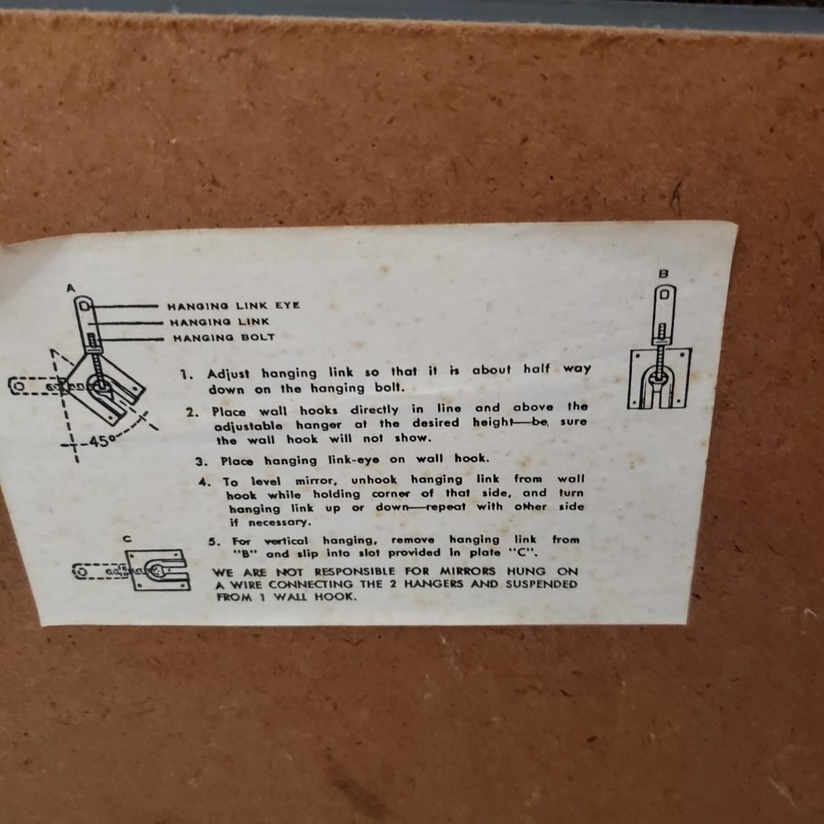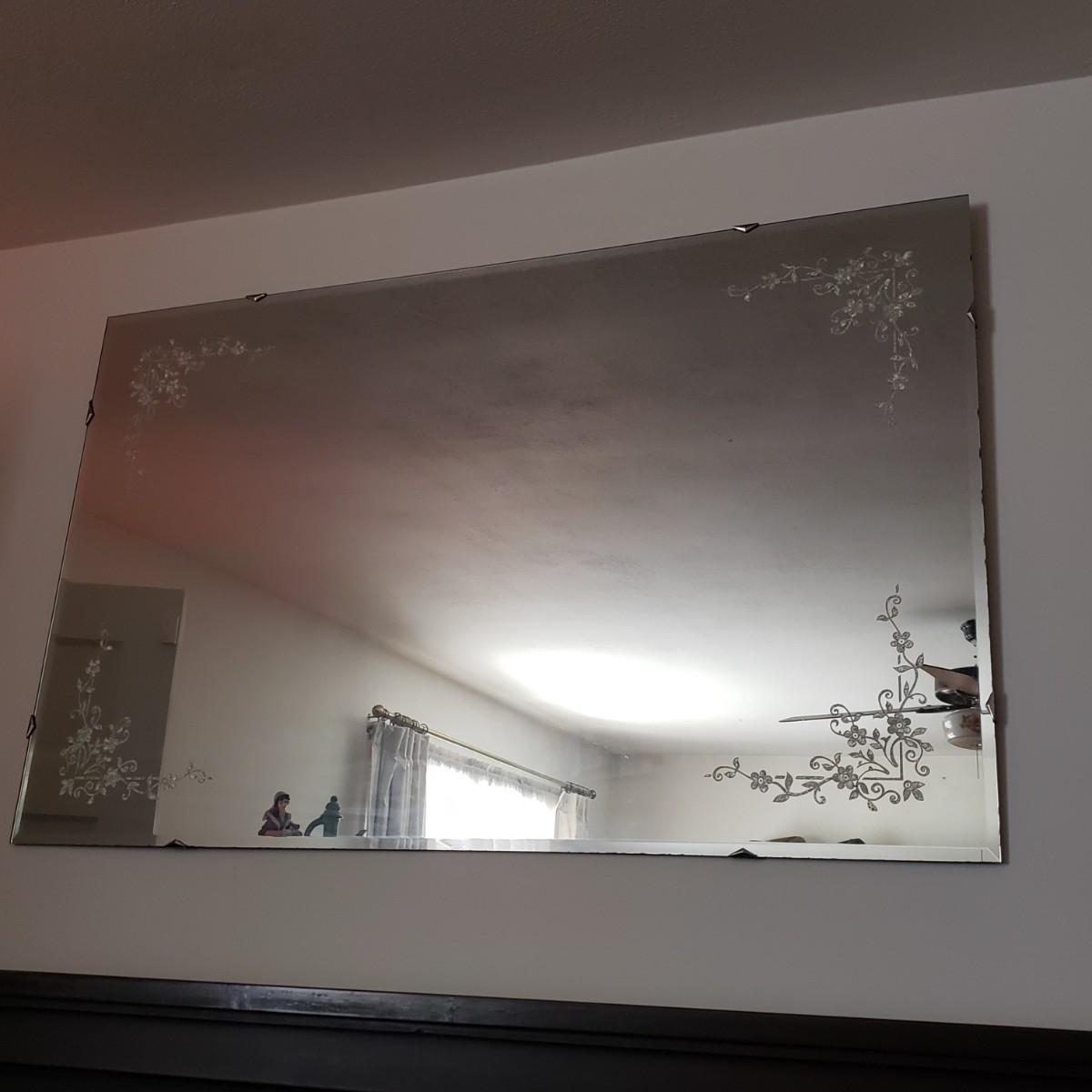 This large mirror has beveled edges and a frosted floral pattern near each corner. The mirror is mounted on pressed wood. The hangers are different, but super handy because they pivot. The mirror measures 48" x 30"H. There are some worn spots along the edges, see pictures.