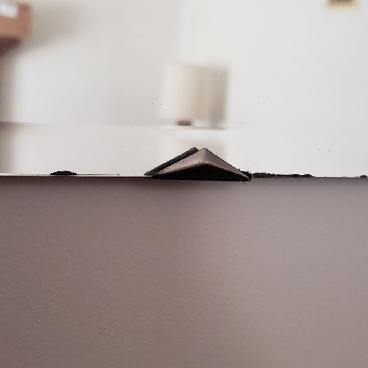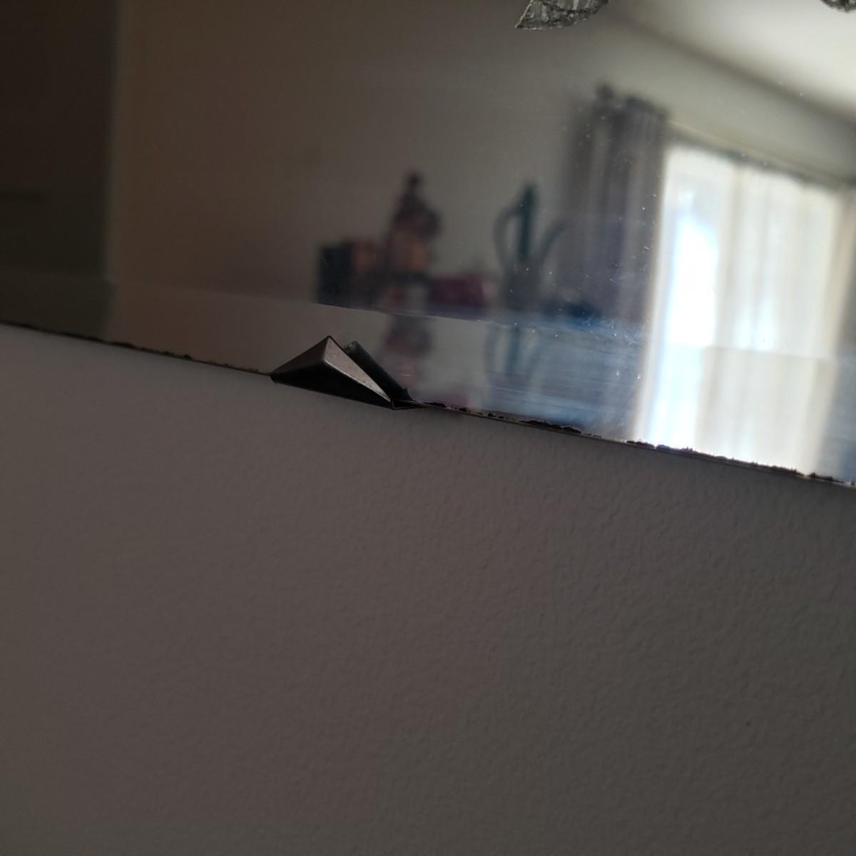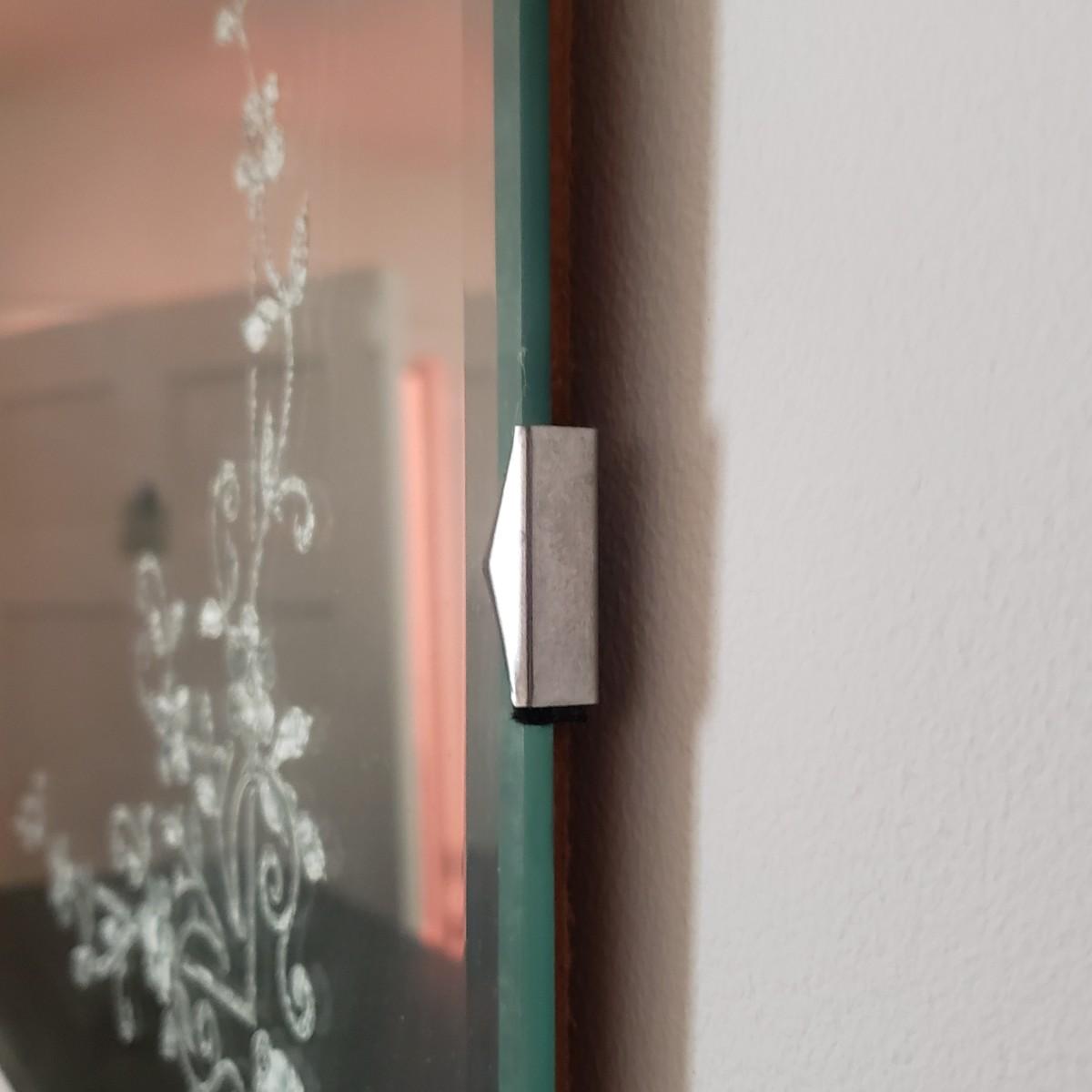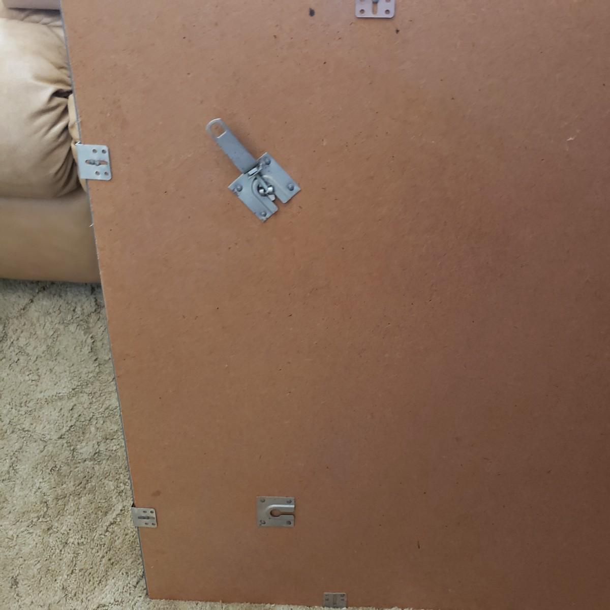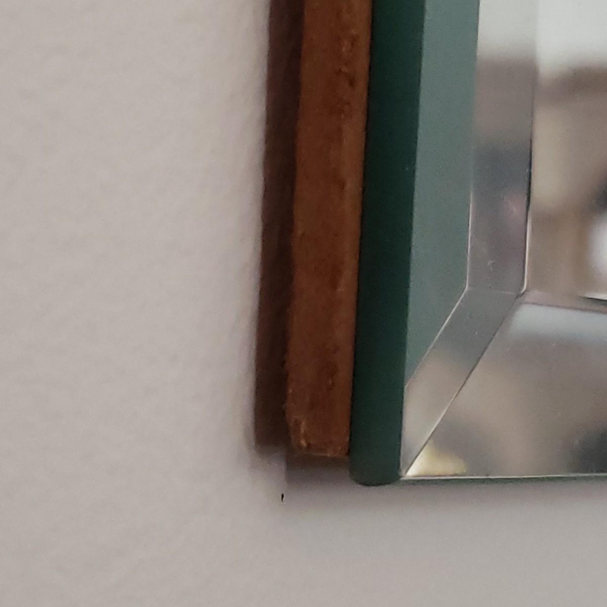 This large mirror has beveled edges and a frosted floral pattern near each corner. The mirror is mounted on pressed wood. The hangers are different, but super handy because they pivot. The mirror measures 48" x 30"H. There are some worn spots along the edges, see pictures.