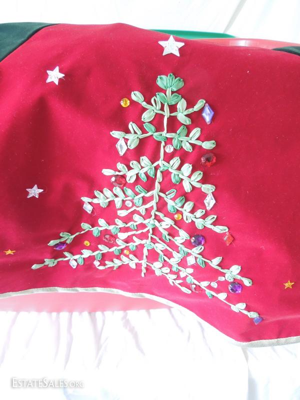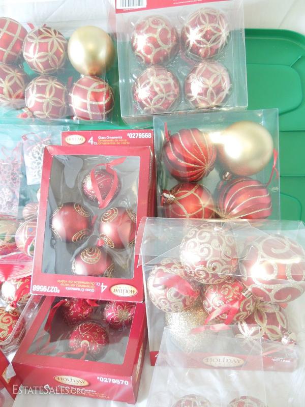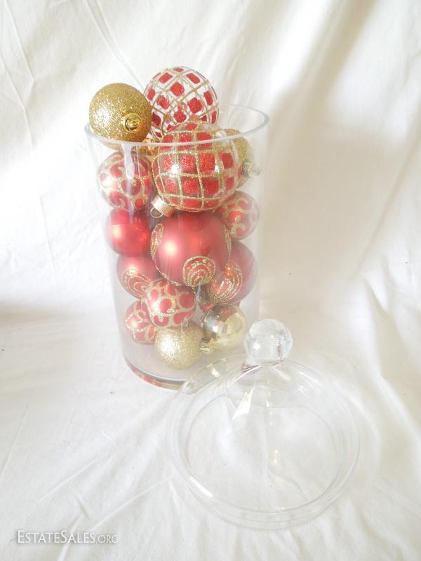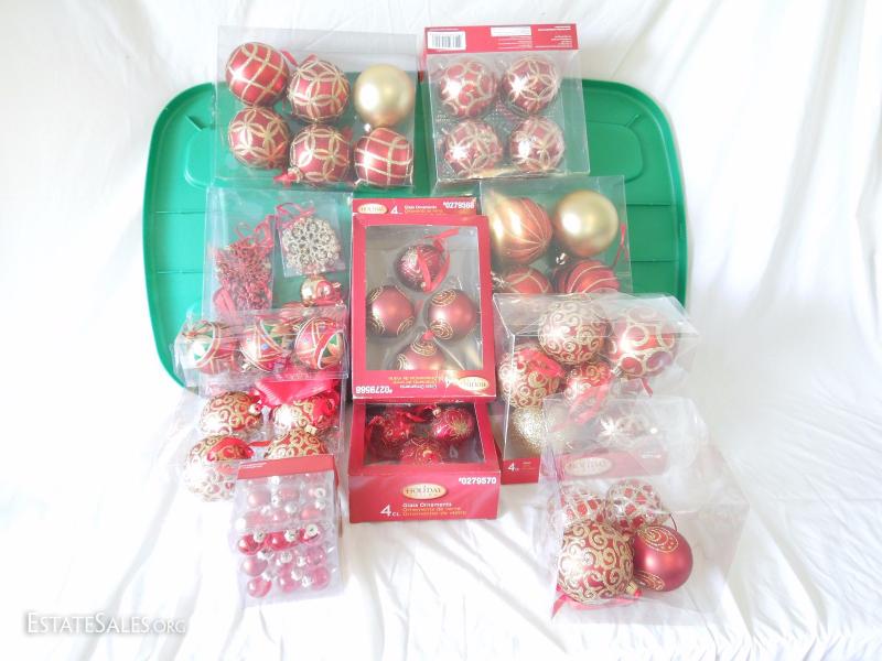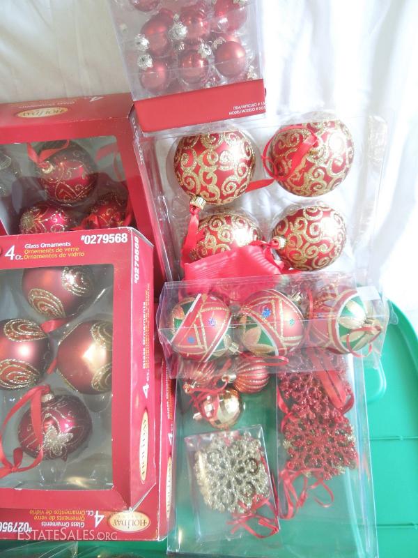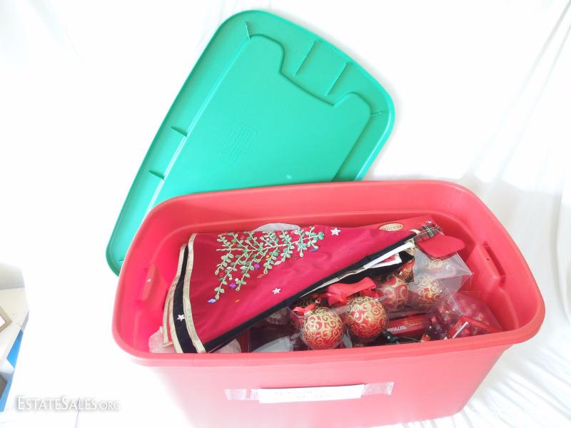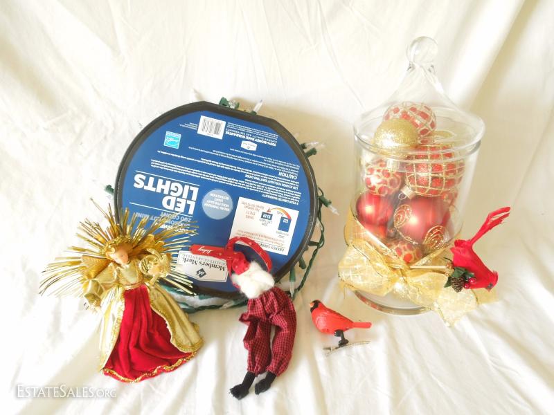 Oh my! Large bin with over 60 glass ornaments in red and gold, snowflakes, embroidered and jeweled velveteen Christmas tree skirt Most in original boxes. apothecary jar full of glass ornaments, 200 miniature lights on reel, and more! Includes bin.