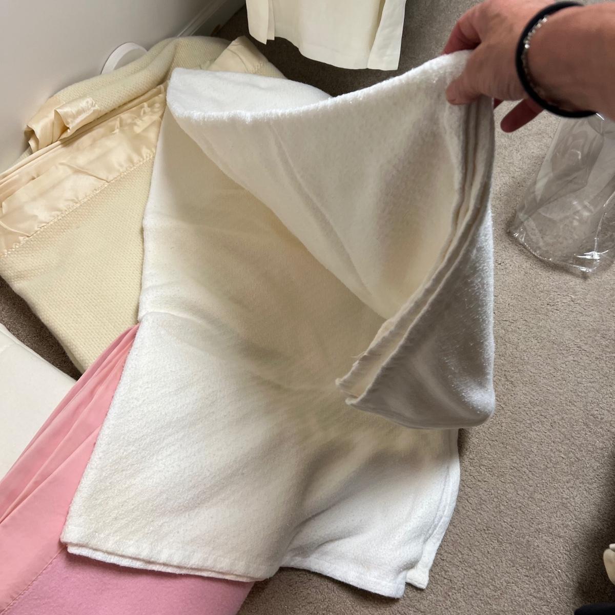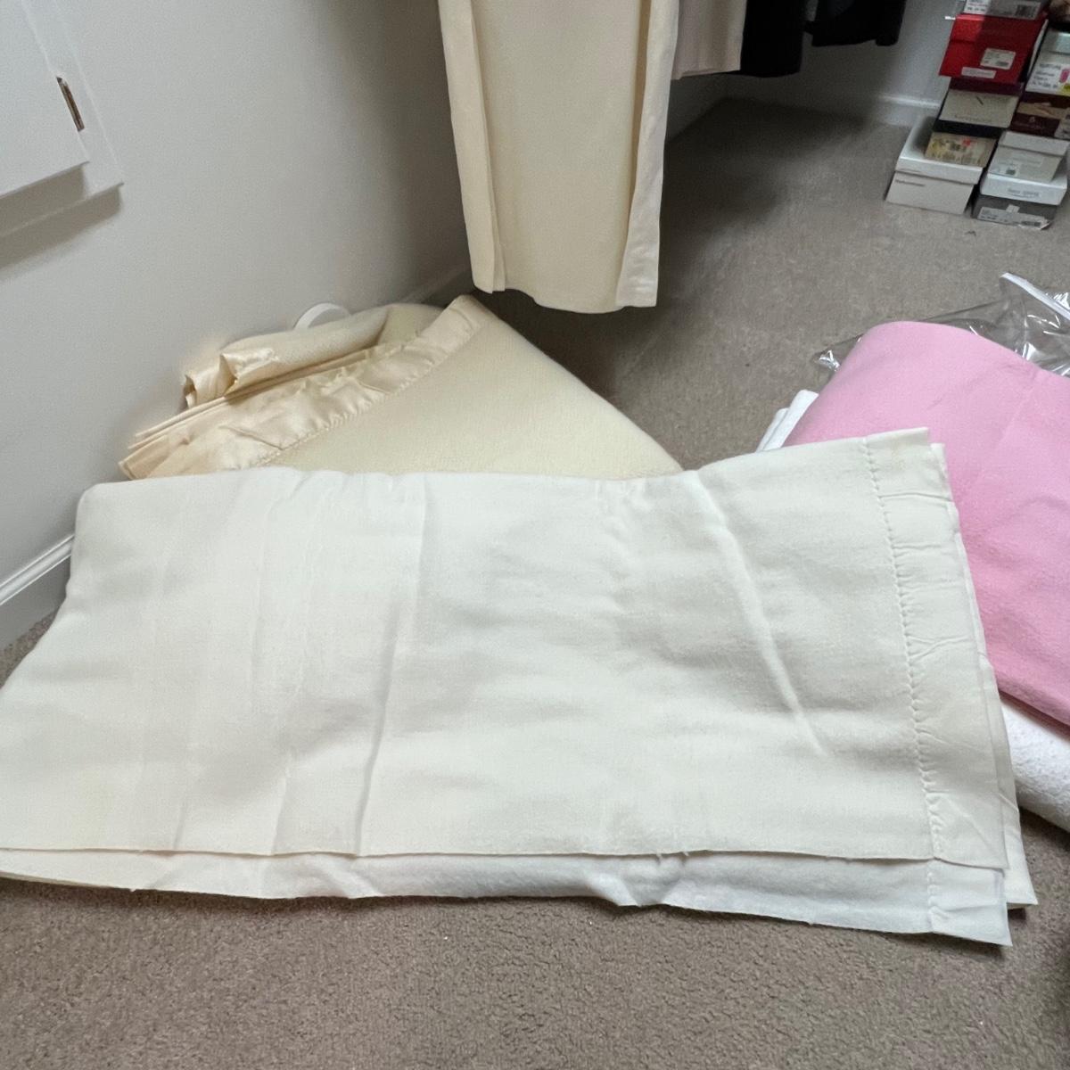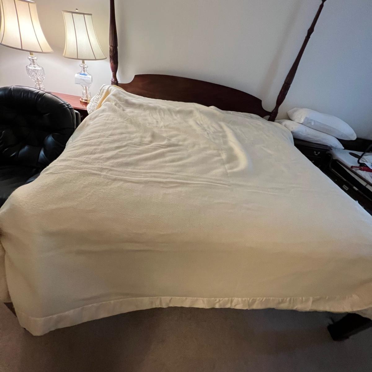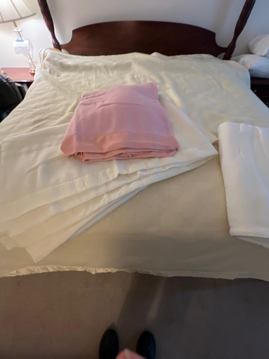 Four large blankets in this lot. The largest is photographed on a king sized bed (bed not included) and measures 90” x 108”. Any labels found are in images. Note that there is some light yellowing on the one blanket.