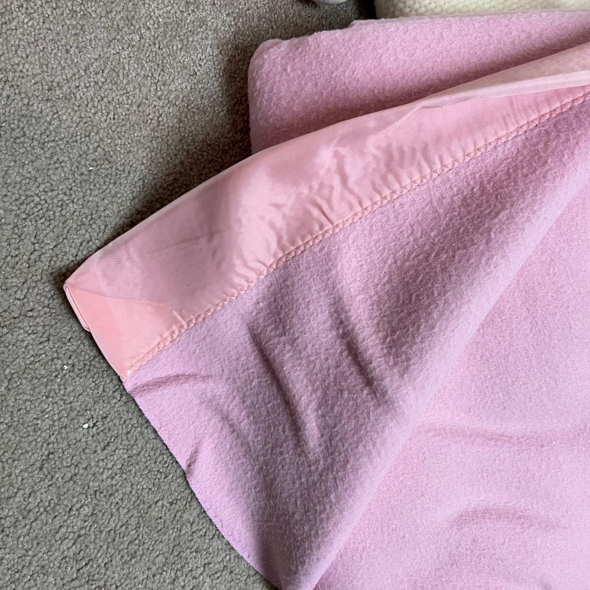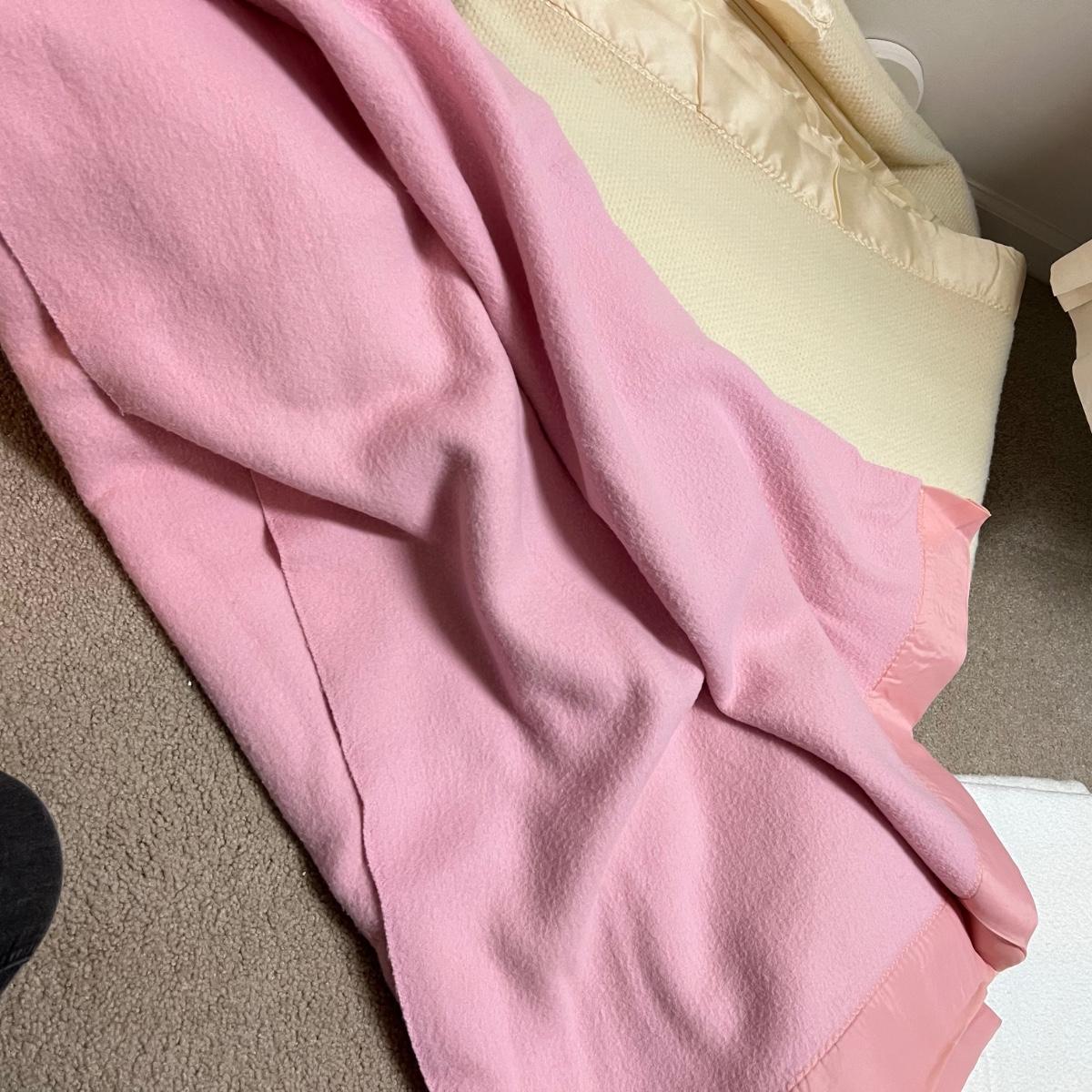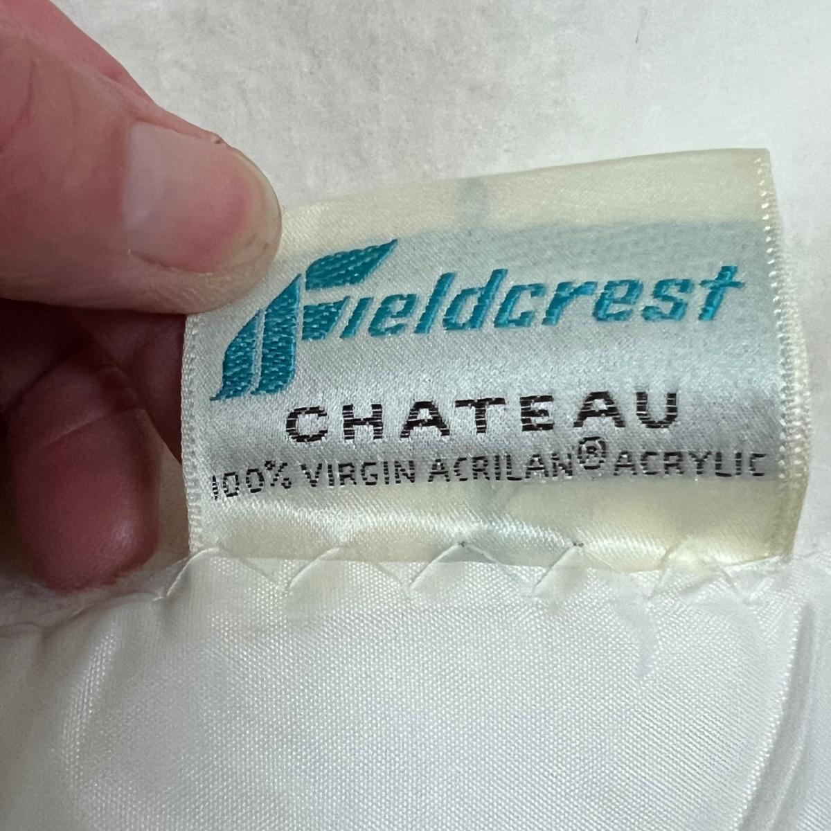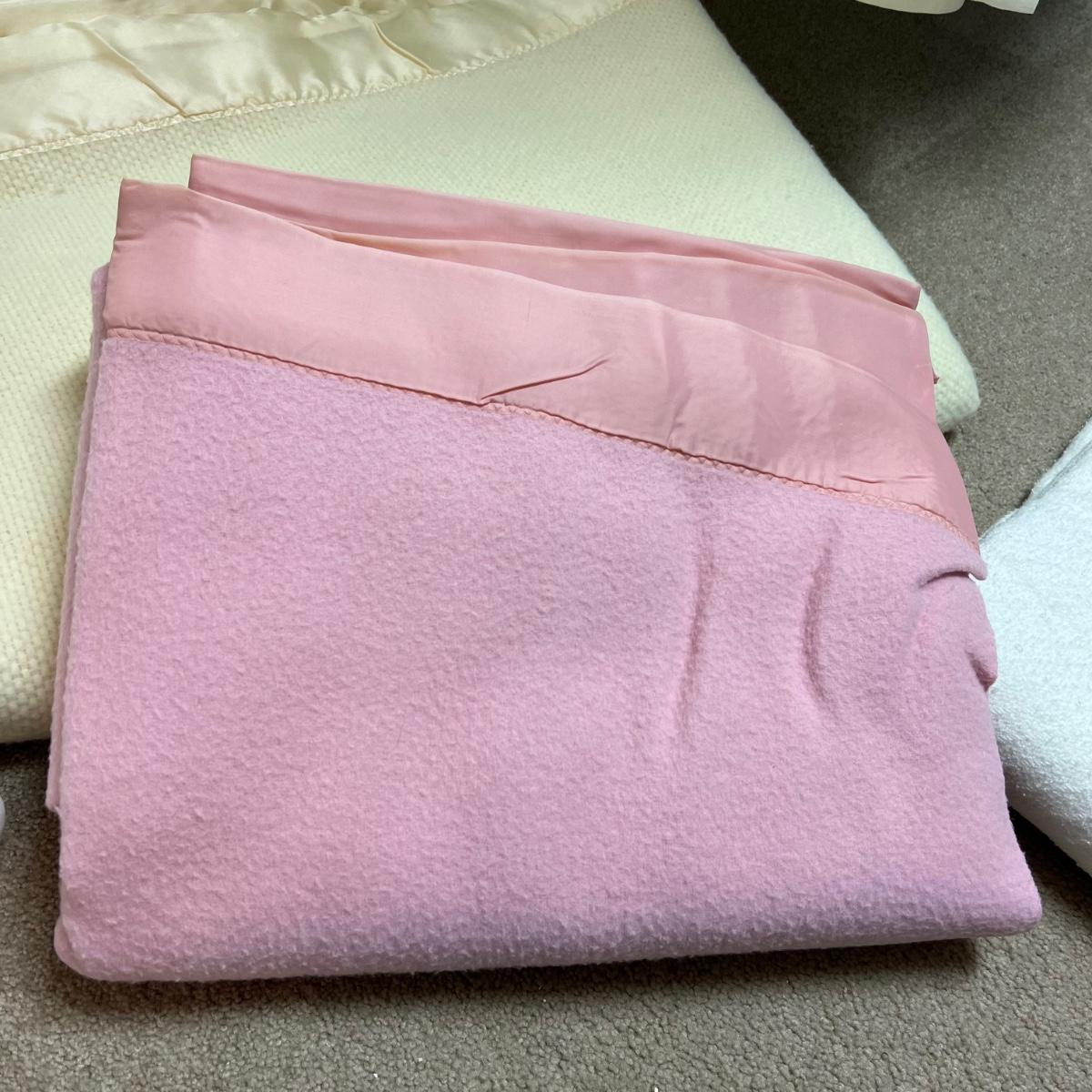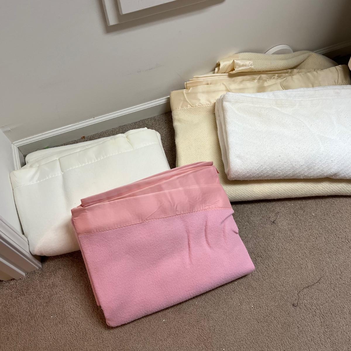 Four large blankets in this lot. The largest is photographed on a king sized bed (bed not included) and measures 90” x 108”. Any labels found are in images. Note that there is some light yellowing on the one blanket.
