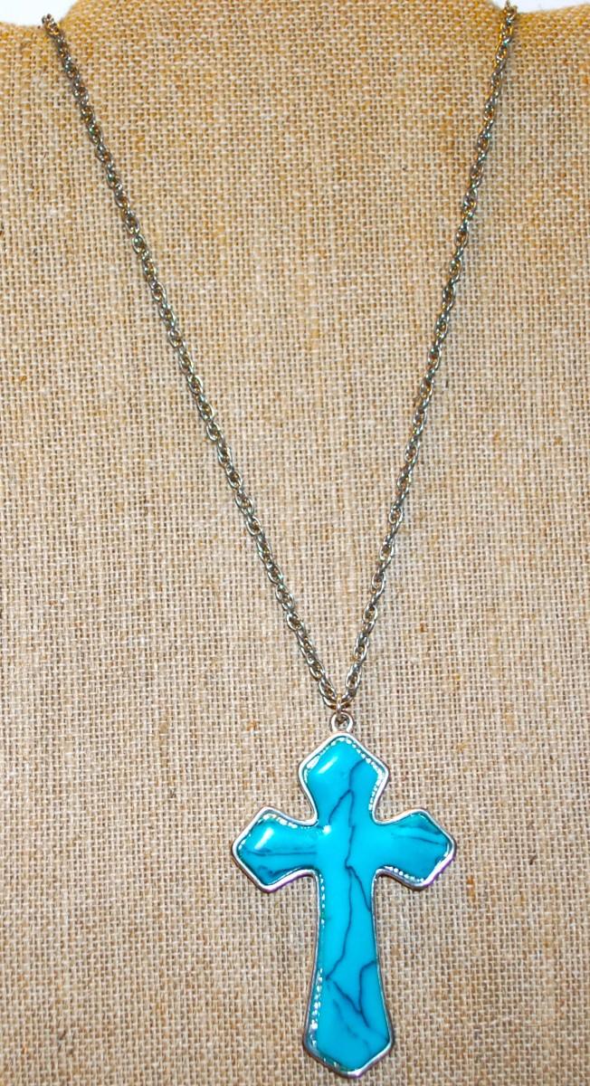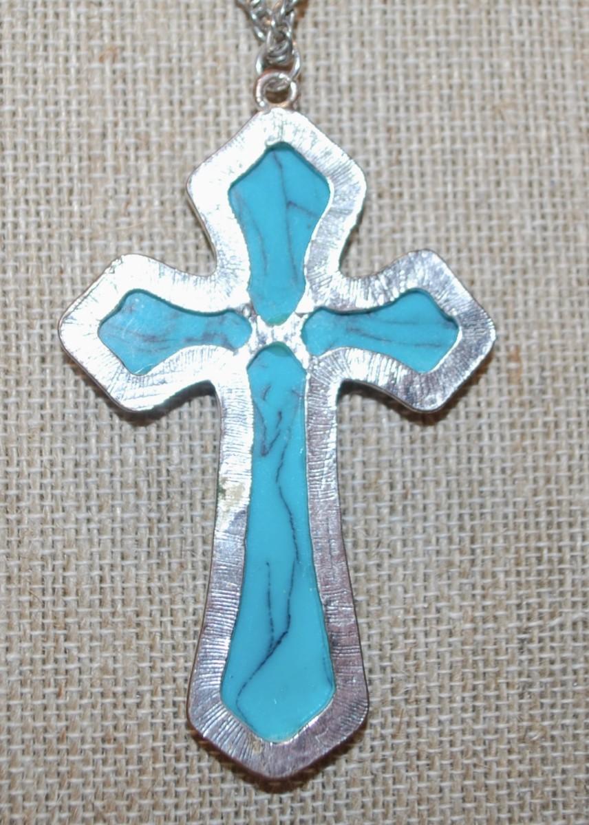 Large Blue Crackle Cross PENDANT (3" x 2") on a Dark Silver Tone Chain 30" L