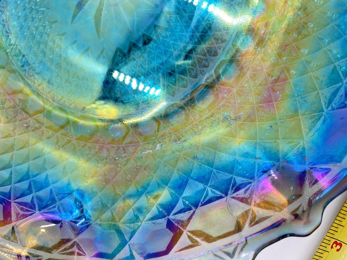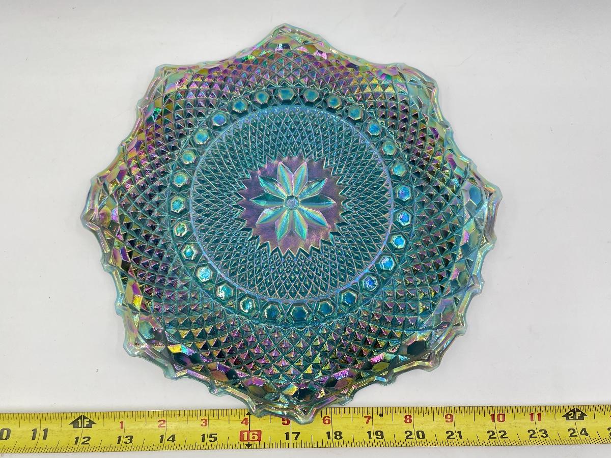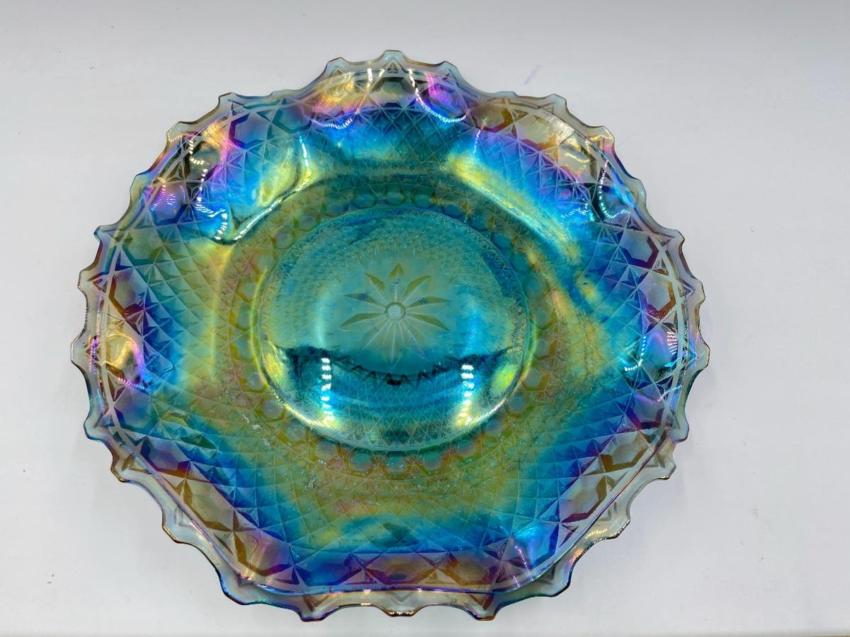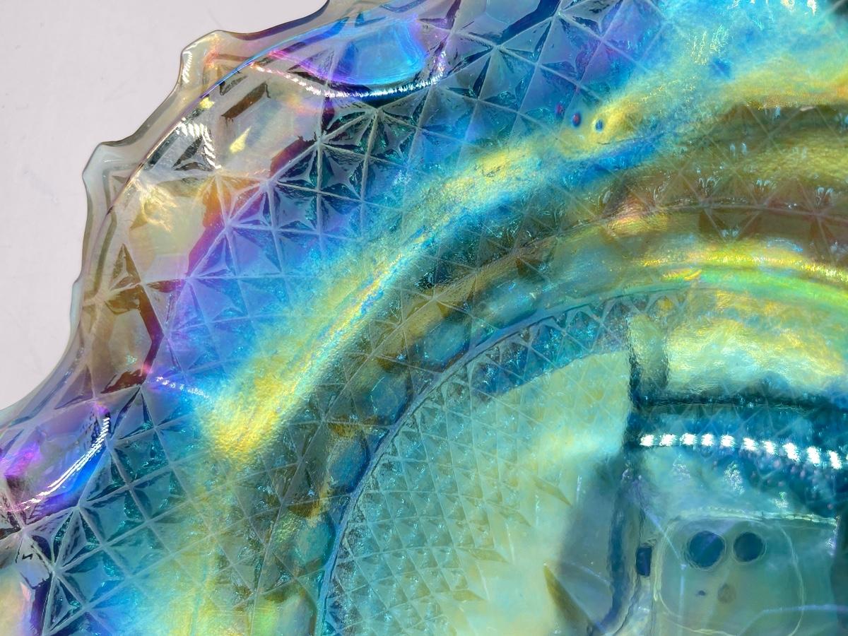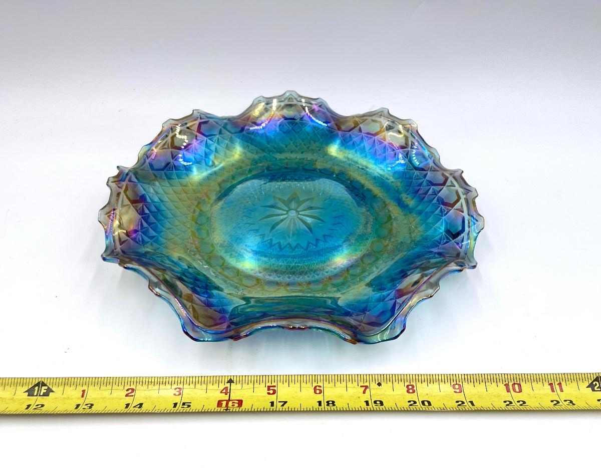 LARGE BLUE IRIDESCENT CARNIVAL GLASS RUFFLED EDGE DISH