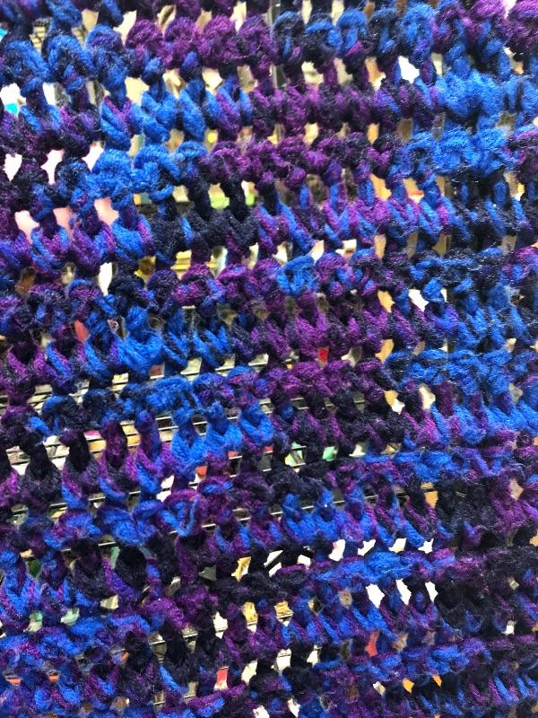 Fringed crochet blanket. Blue, purple and black. Roughly 4’x6’.
