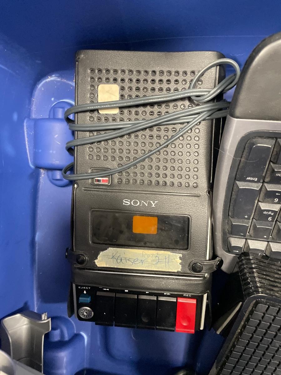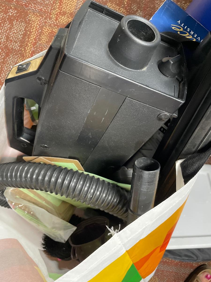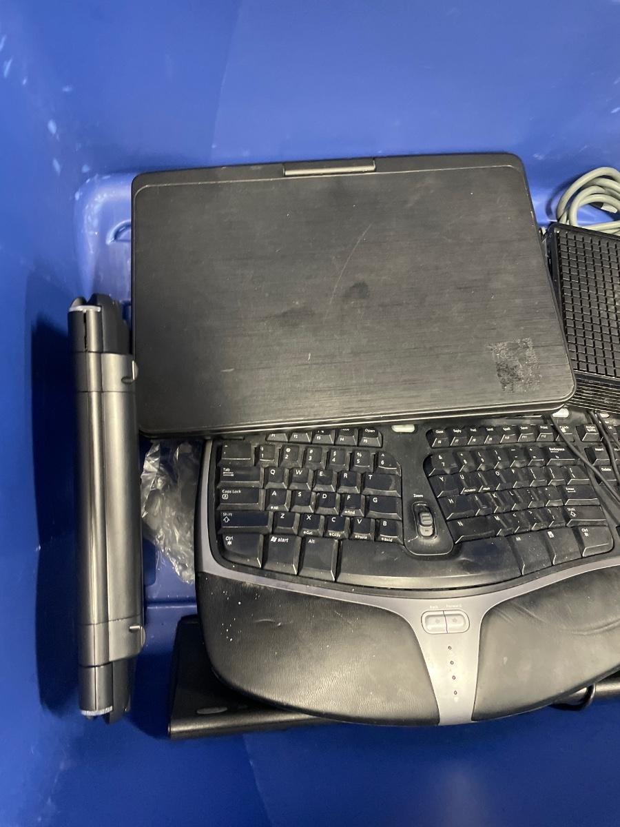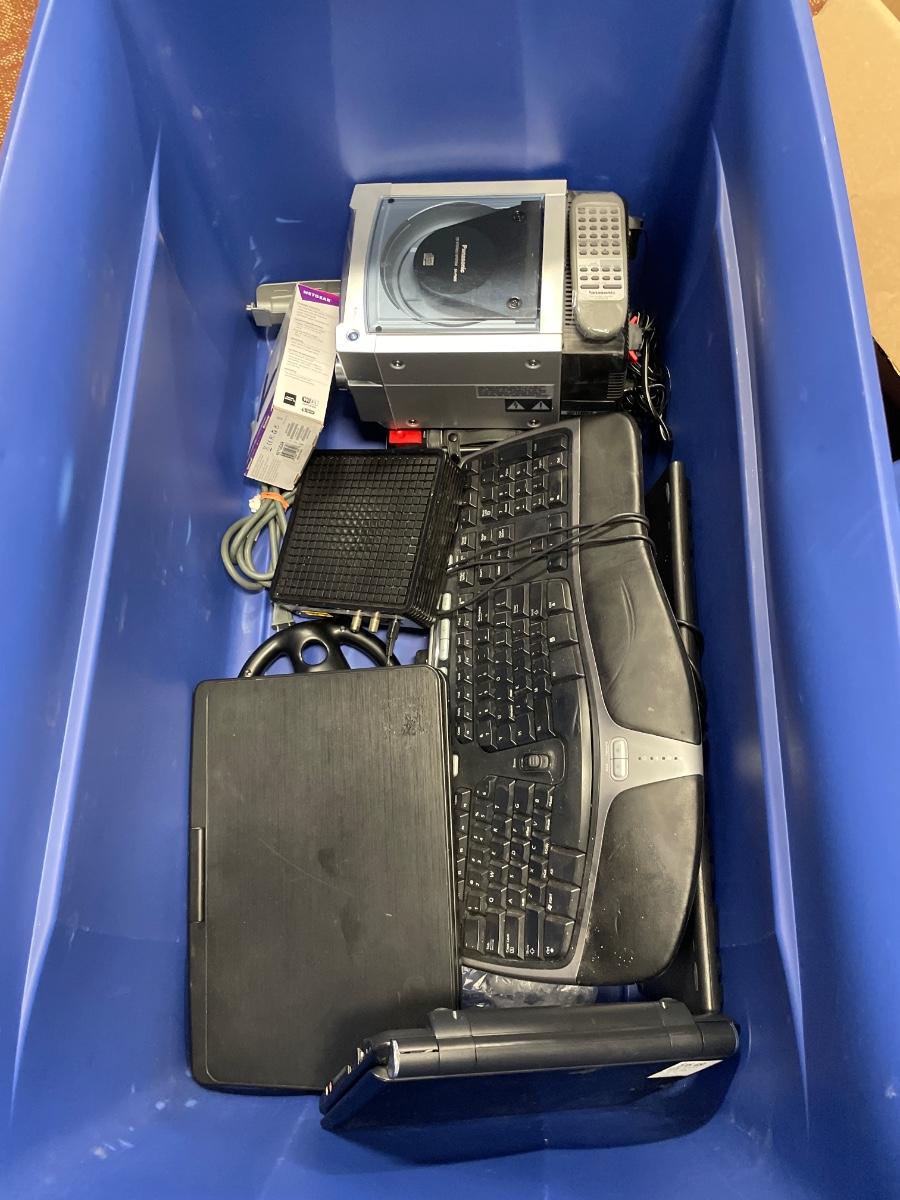 Large blue tote with misc electronics
