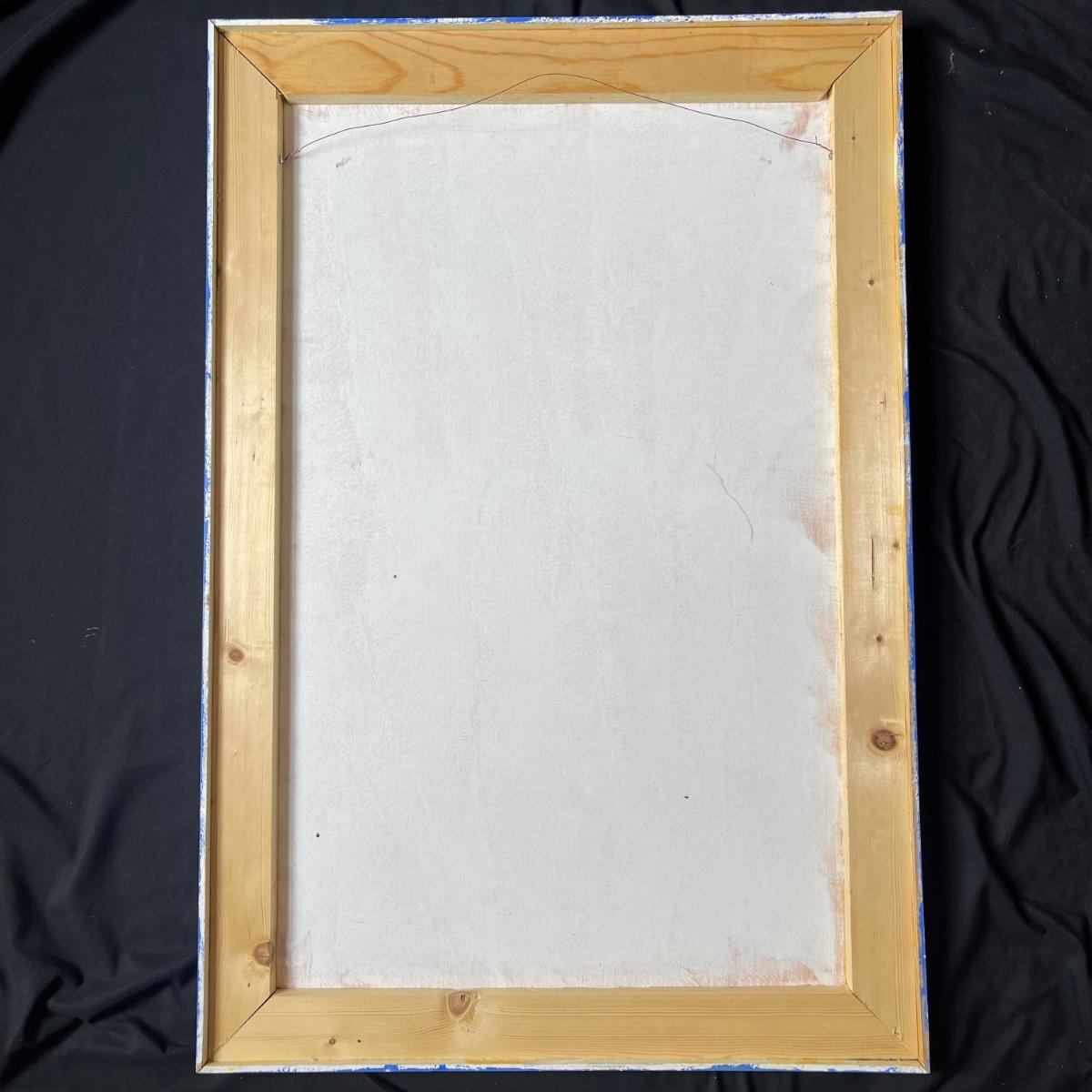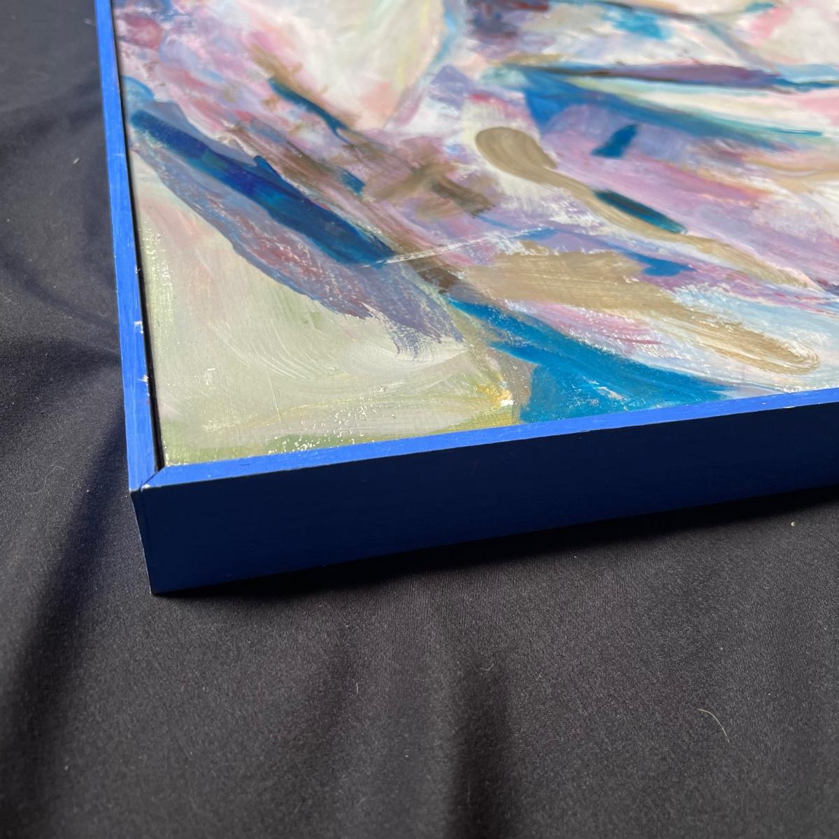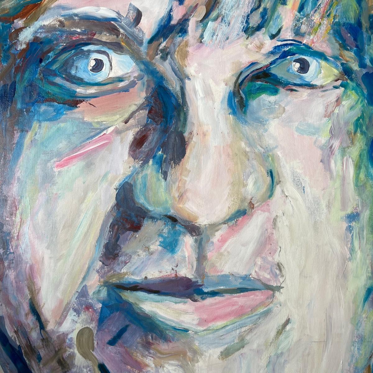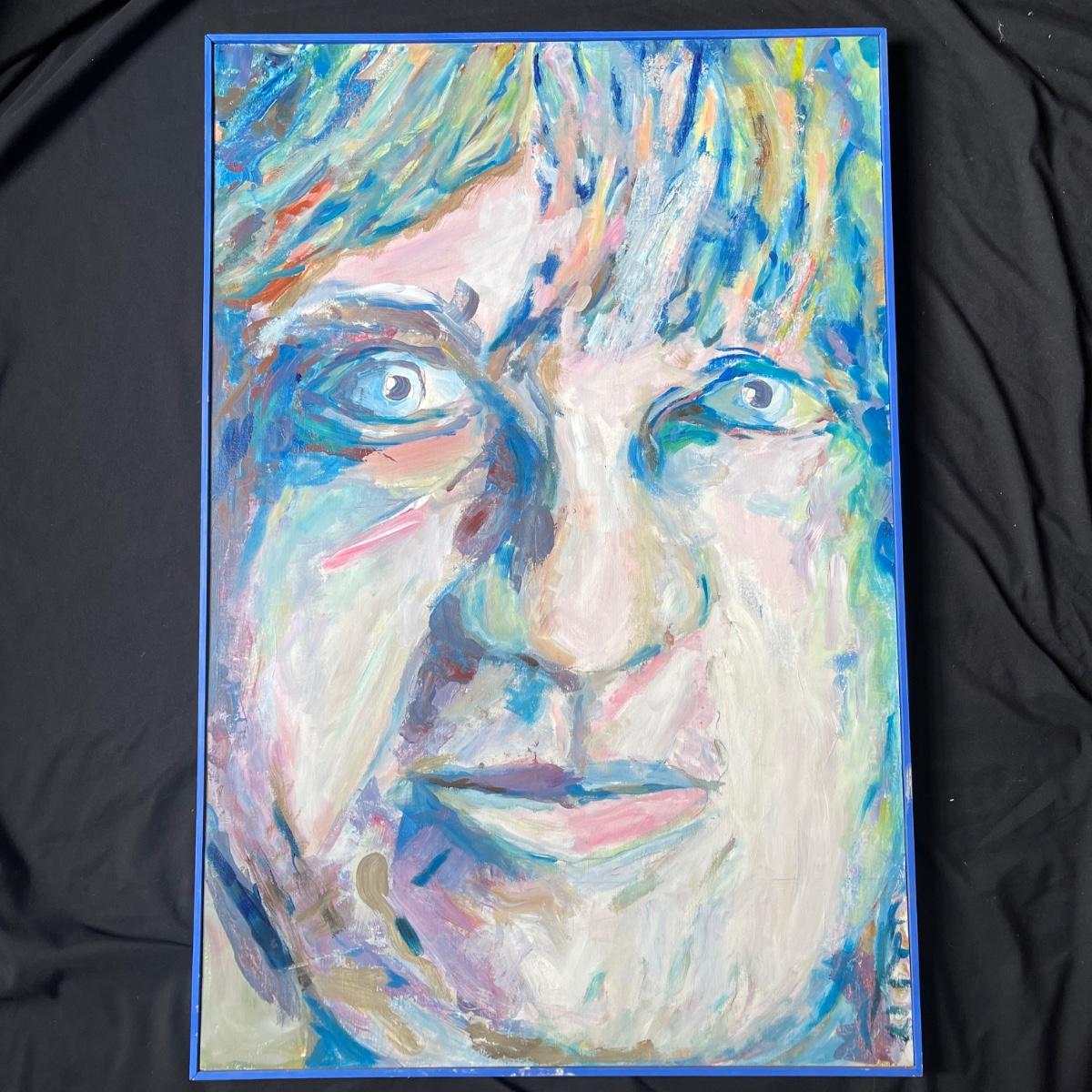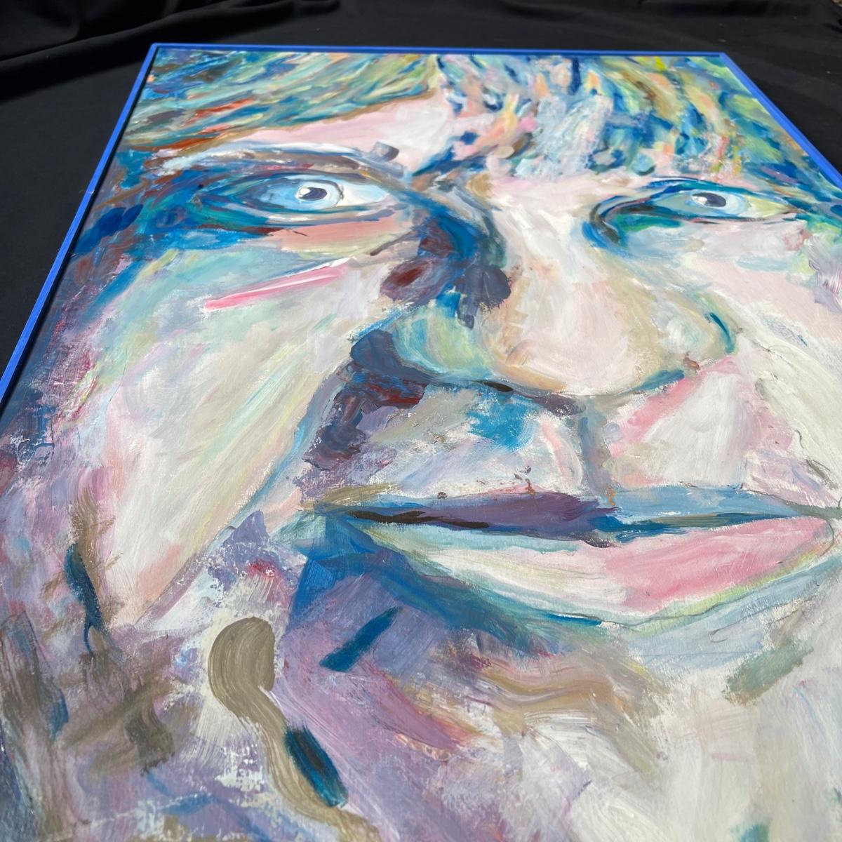 A large close up portrait painting by Asheville artist Reginald “Ripp” Smith” with a blue painted frame. It measures 24.5” x 36.5”. Each of his paintings is numbered and this one is number 5.