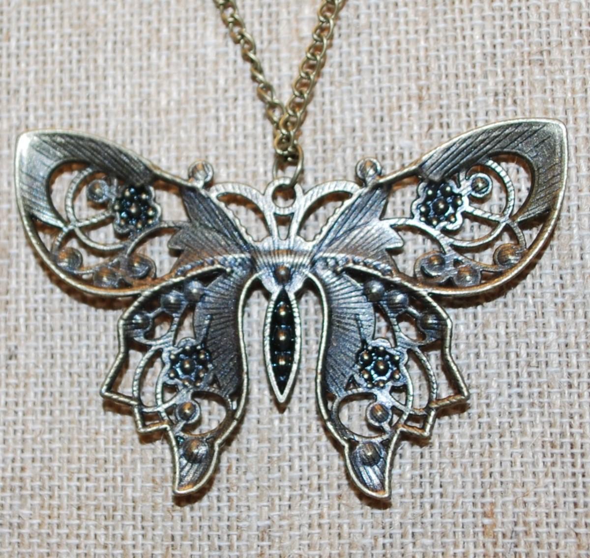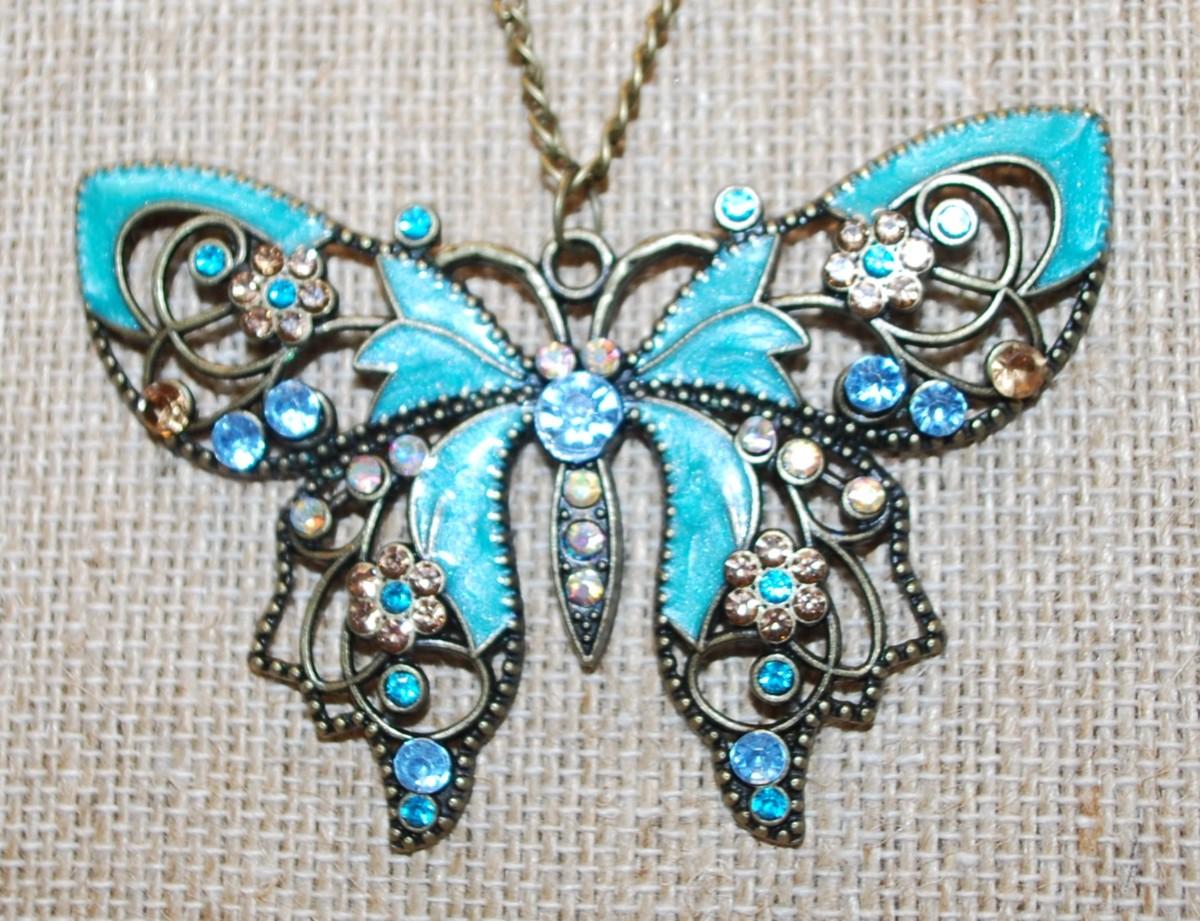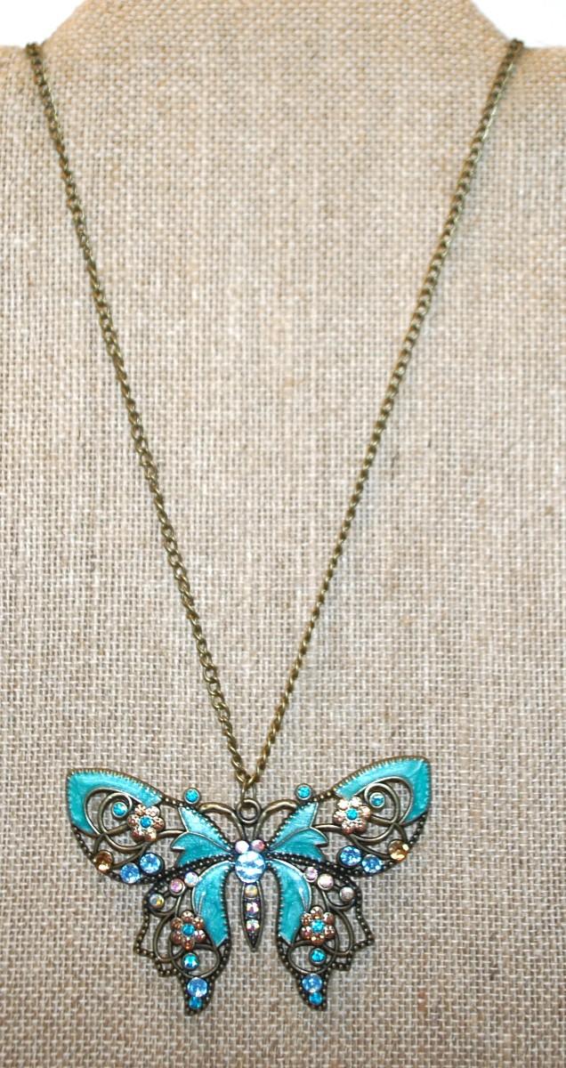 Large Blues Bejeweled Butterfly PENDANT (3" x 1¾") on a Long Brass Colored Necklace Chain 31" L