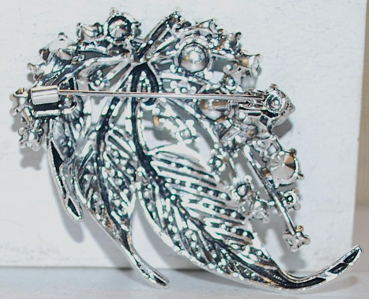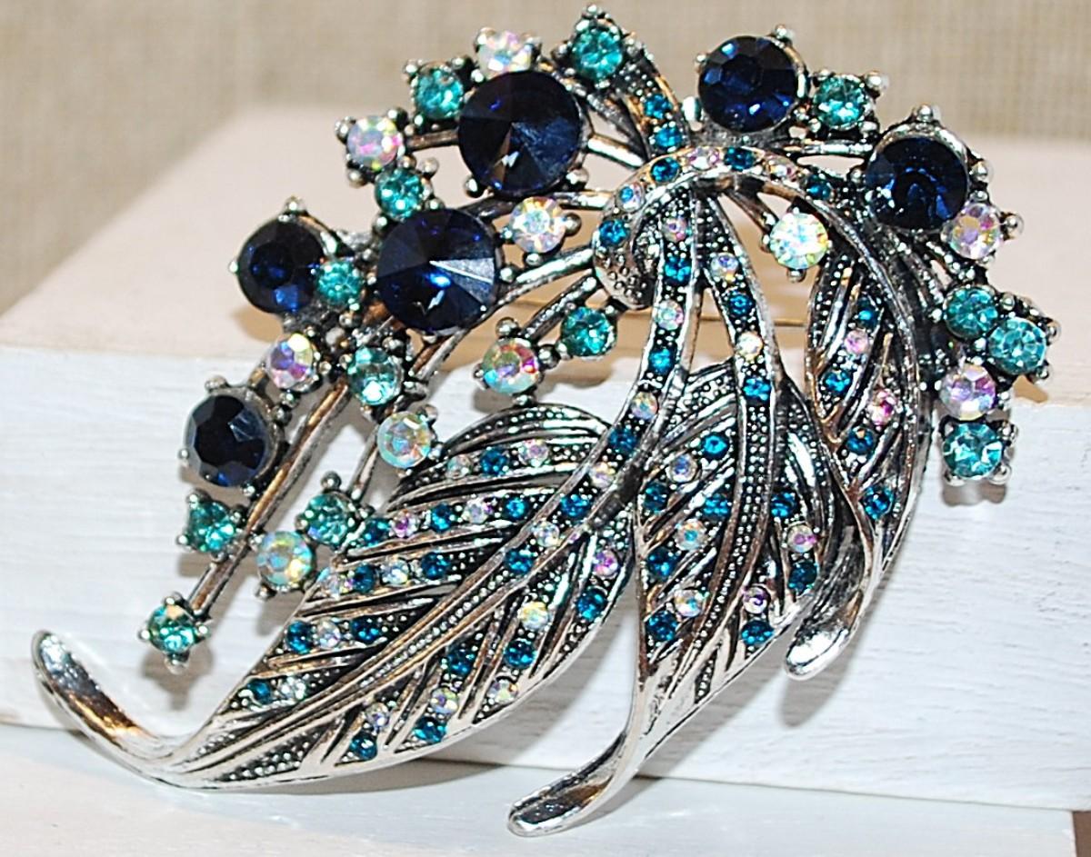 Large BLUES & GREENS Stones "Leaf Spray" BROOCH (3" x 2") on a Silver Tone Setting