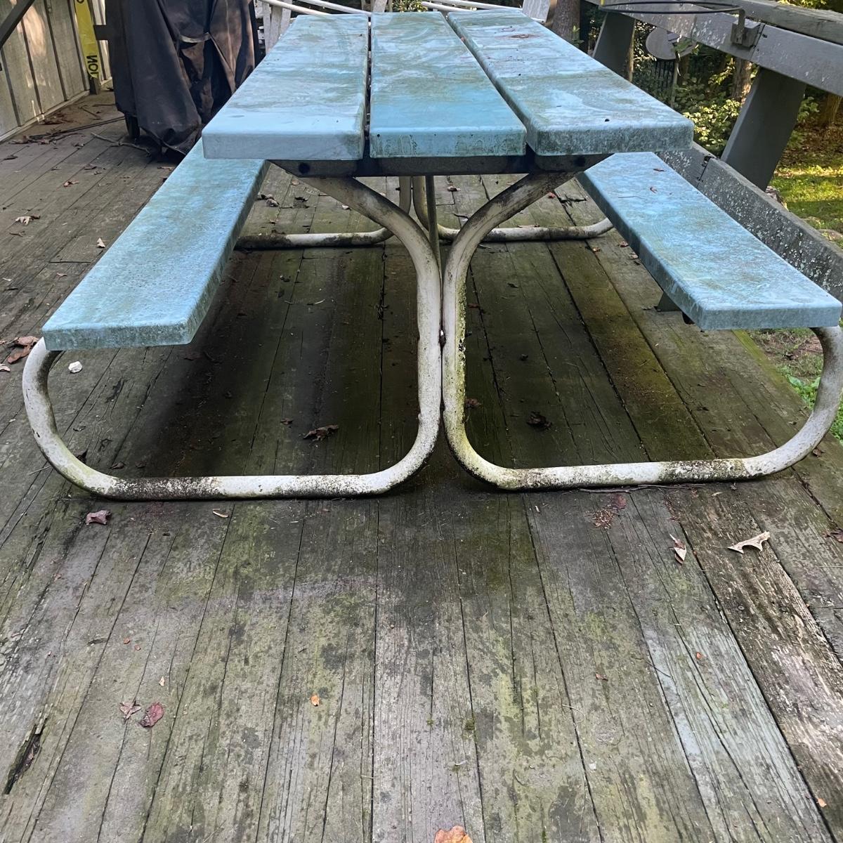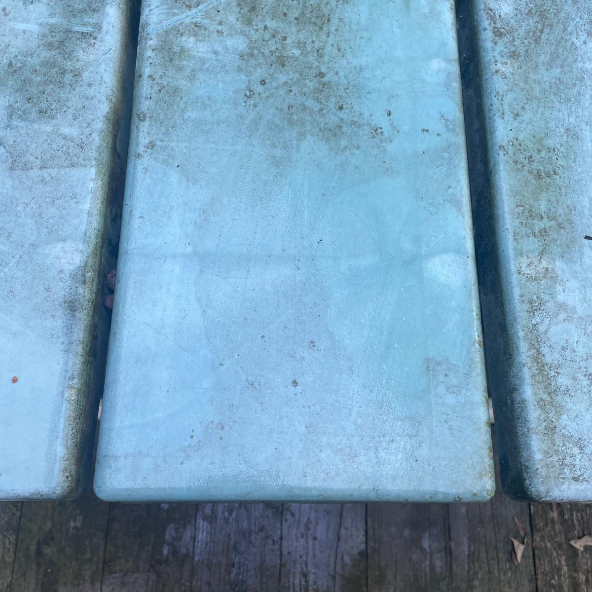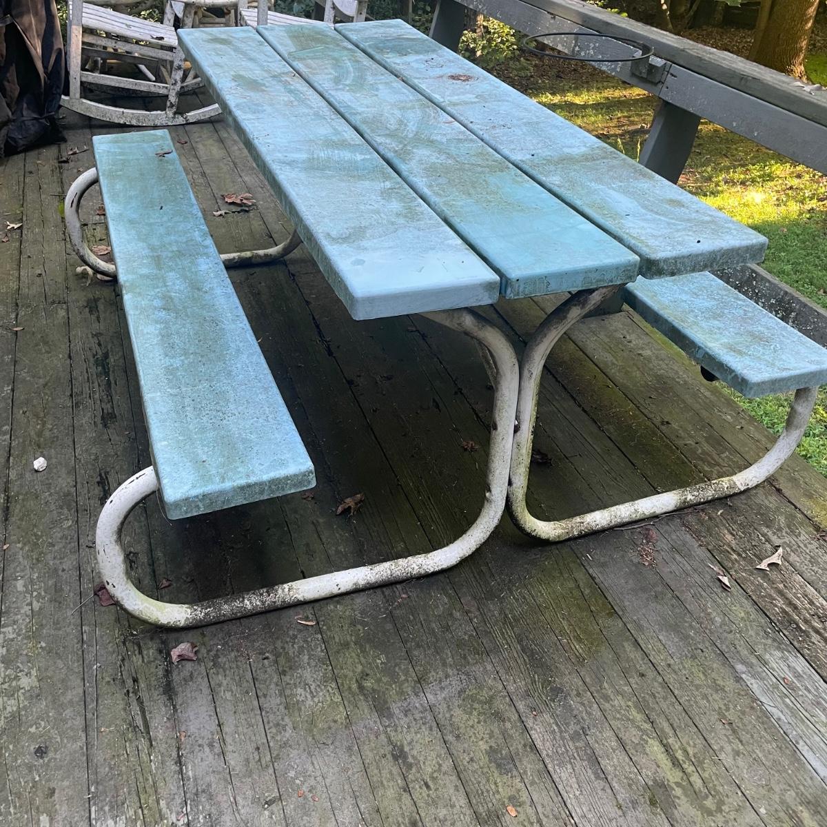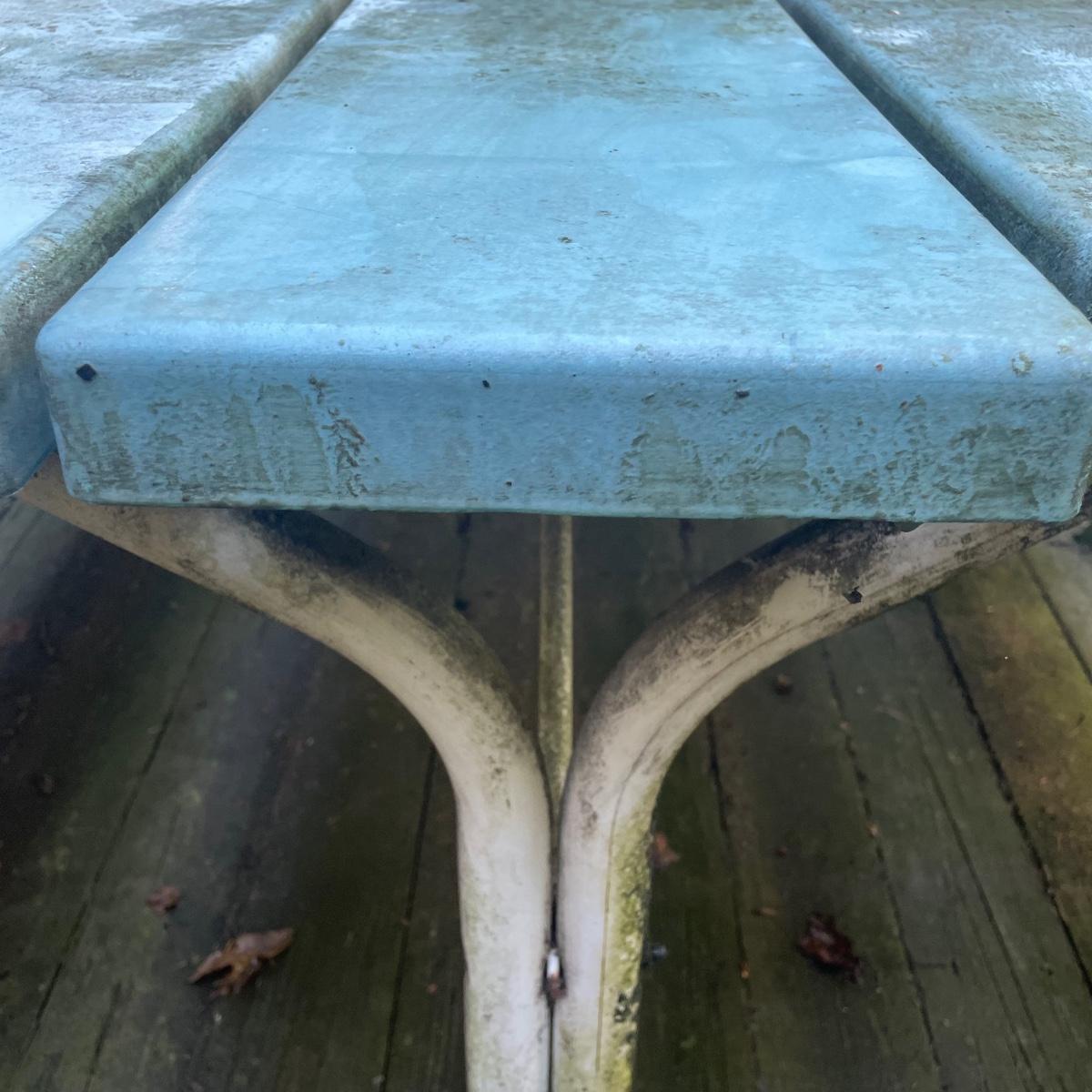This large picnic table is a solid and sturdy bench table with white metal frame and blue plastic seats and table top giving it a vintage look. The plastic has no cracks but as you can see it is dirty from living outside in an area that gets no sun. Most of the dirt cleans off but does leave stains which might come clean with a pressure wash. This appears to be similar to the metal vintage patio chairs earlier in the sale.
