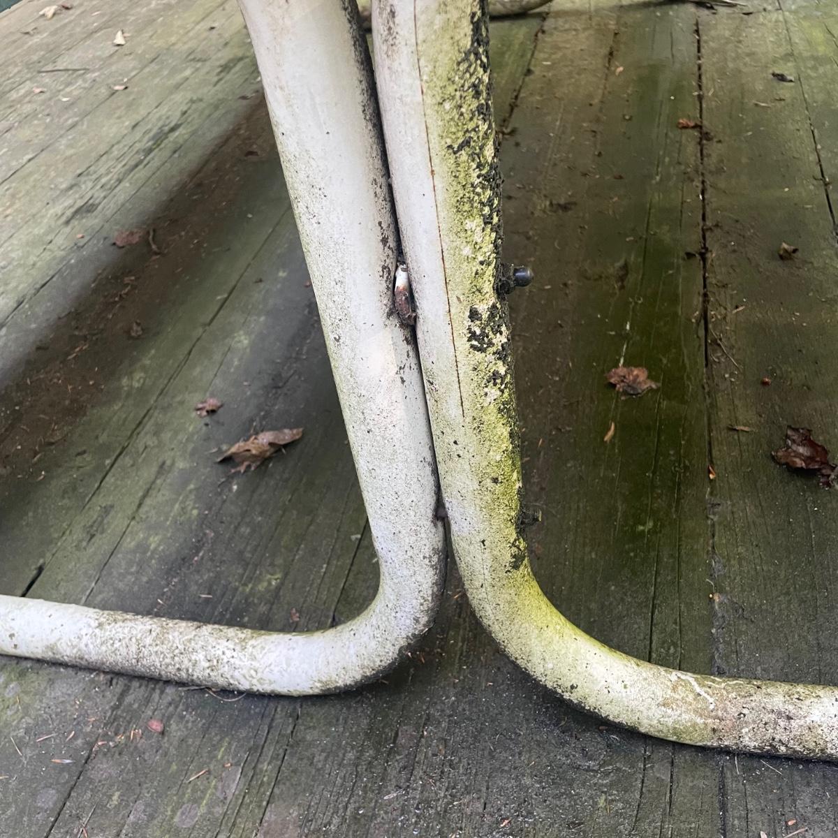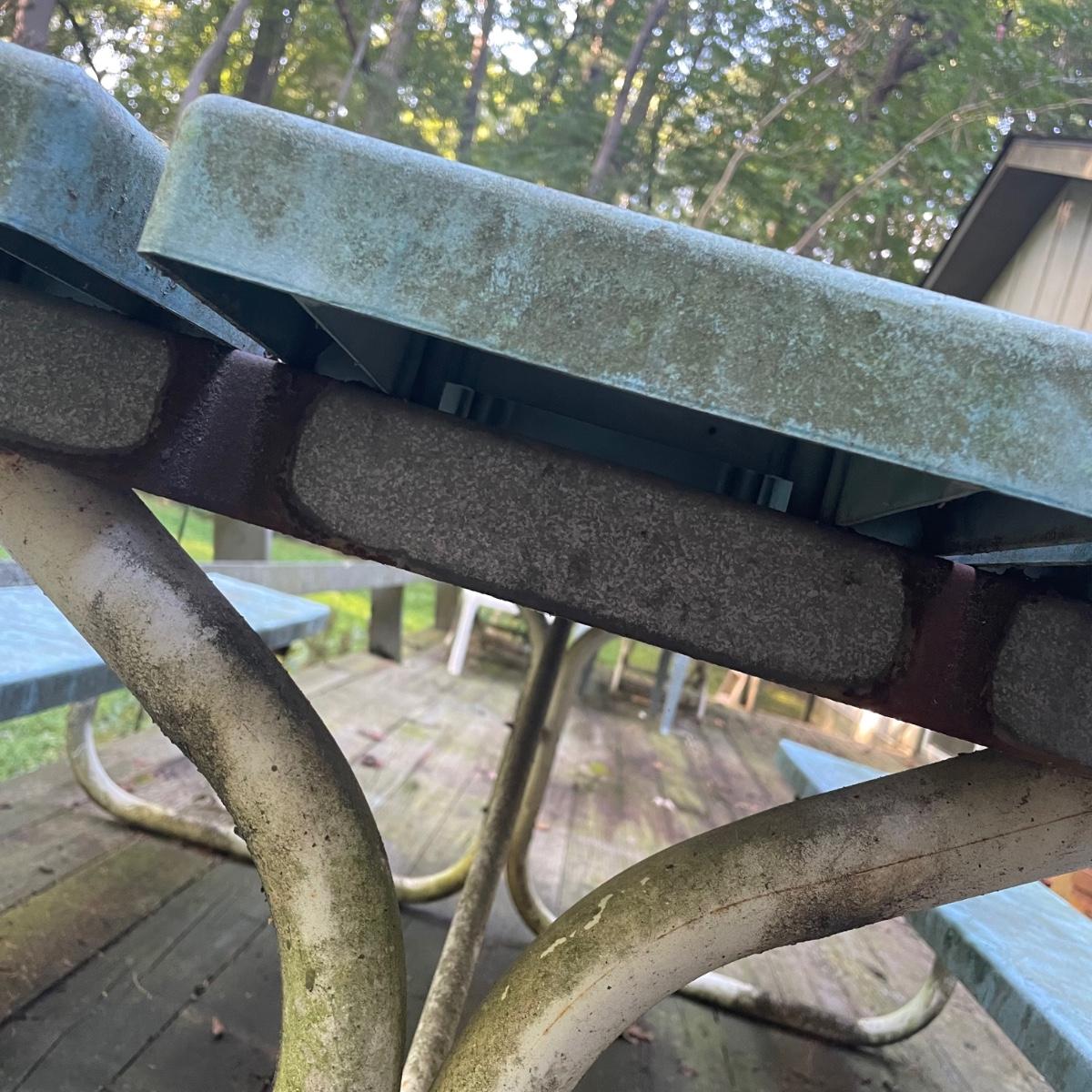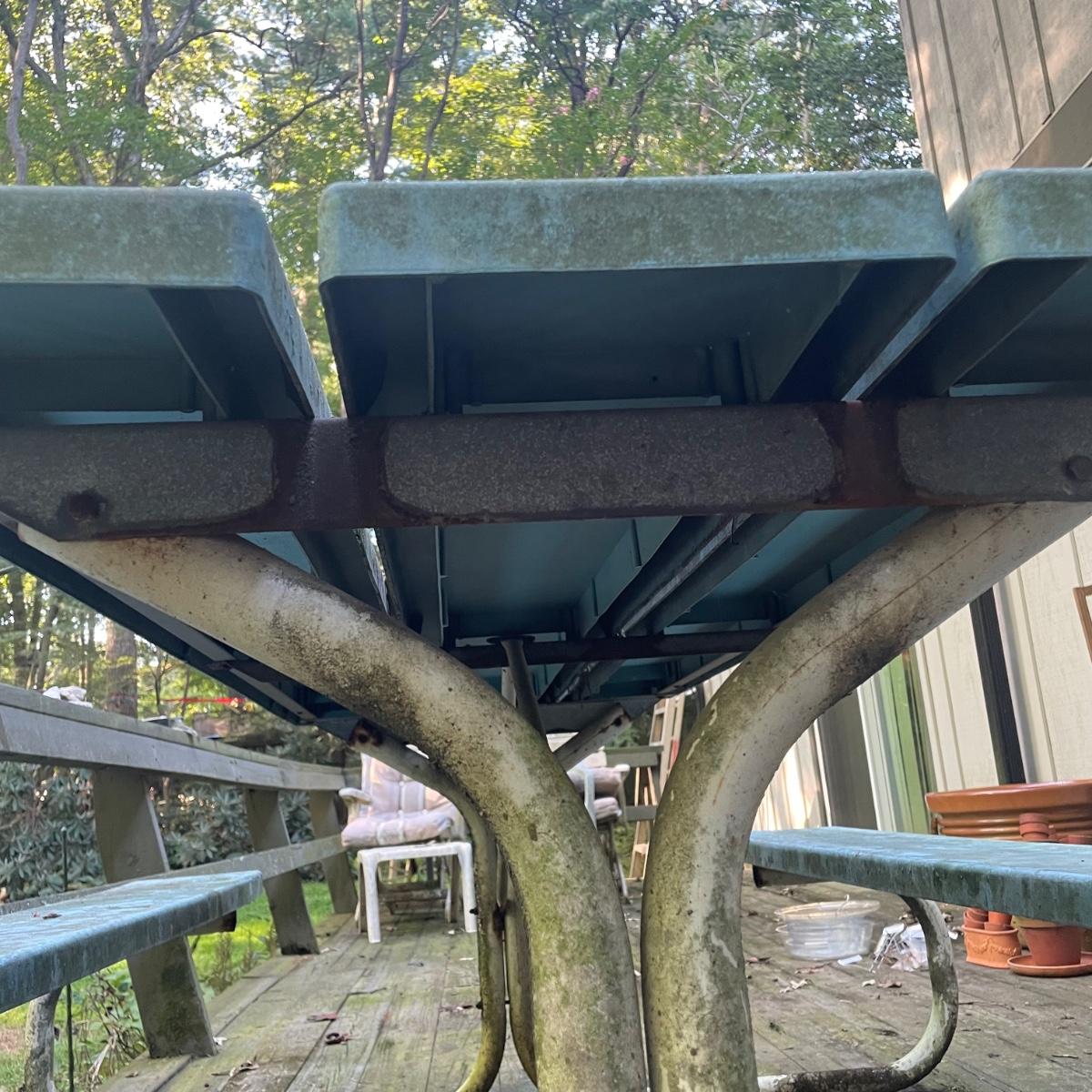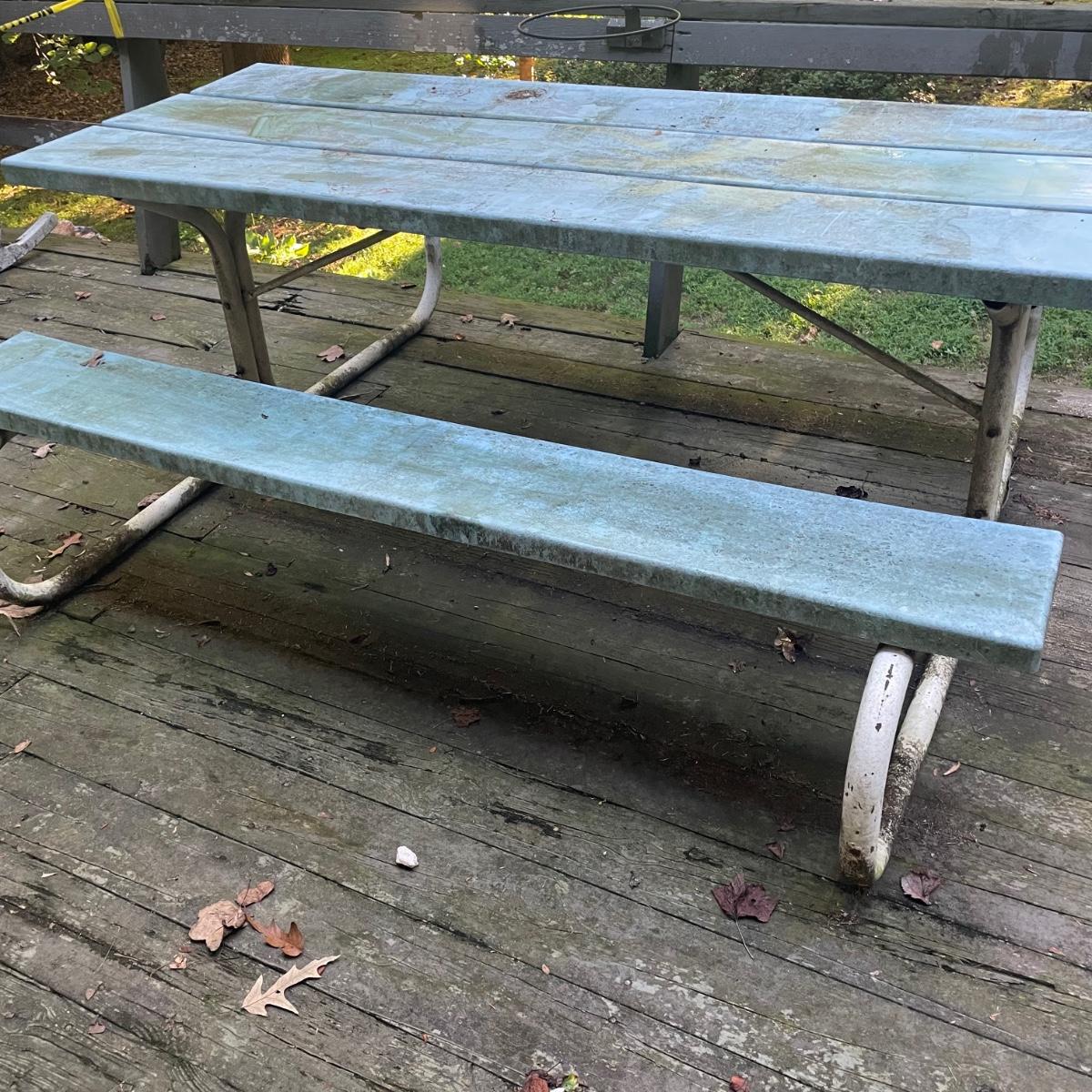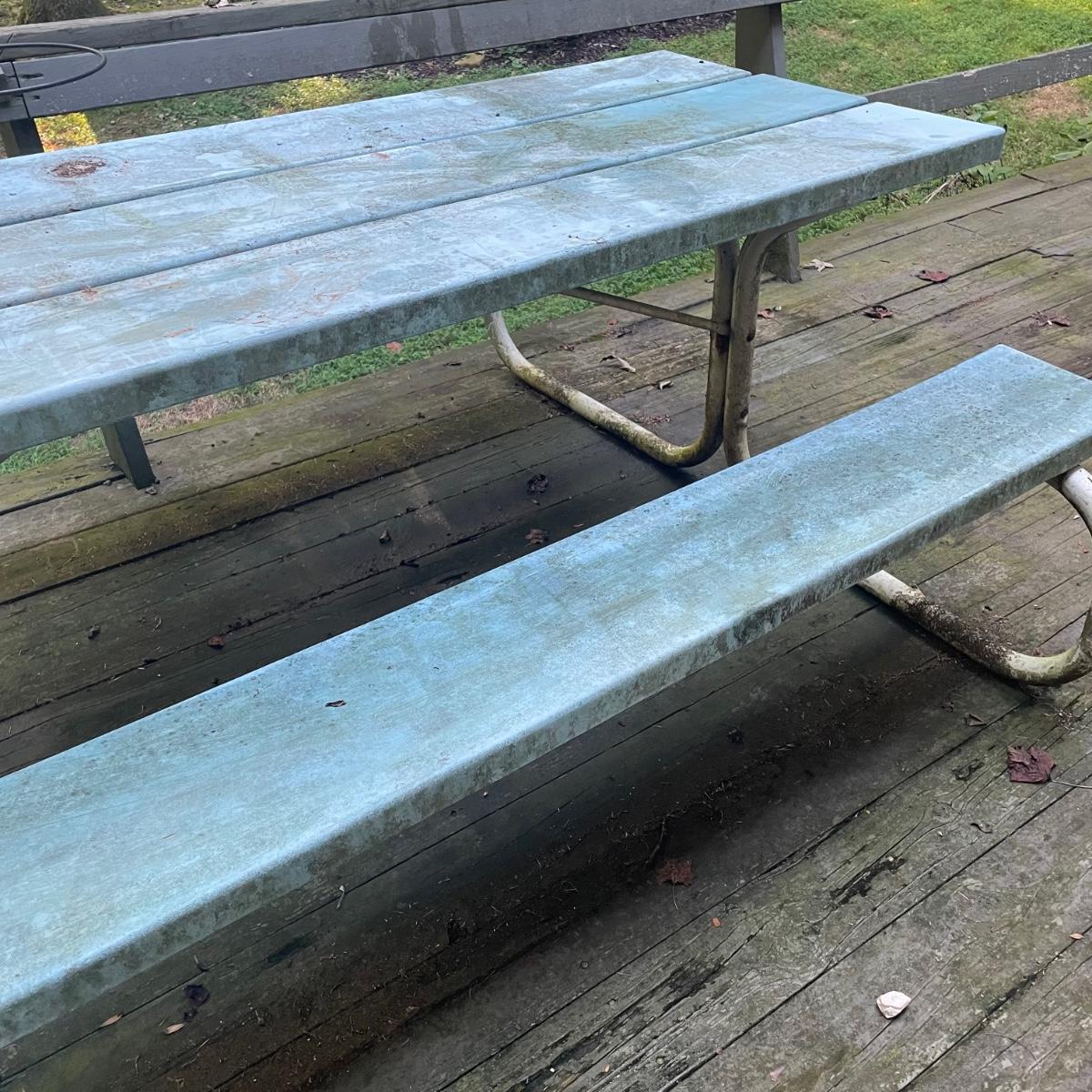 This large picnic table is a solid and sturdy bench table with white metal frame and blue plastic seats and table top giving it a vintage look. The plastic has no cracks but as you can see it is dirty from living outside in an area that gets no sun. Most of the dirt cleans off but does leave stains which might come clean with a pressure wash. This appears to be similar to the metal vintage patio chairs earlier in the sale.
