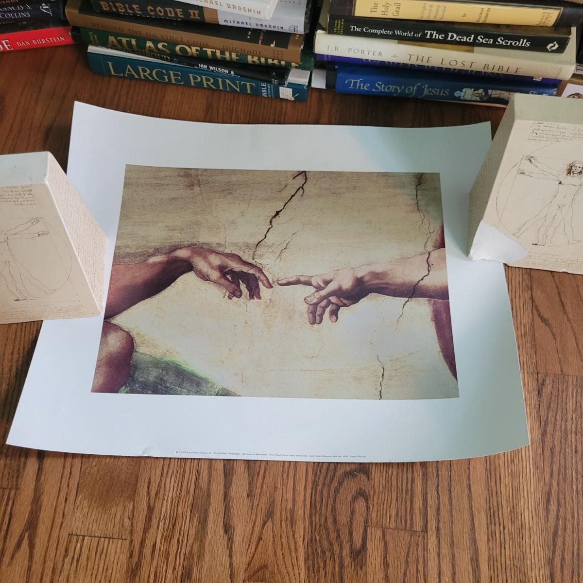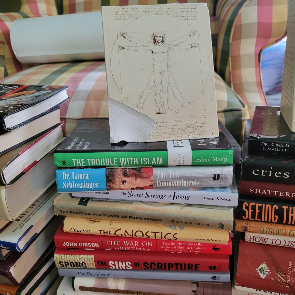 Over 140 books focused on many aspects of religious studies. Includes a variety of study Bibles and books on mythology. Also includes a poster a Sistine Chapel detail and a set of DaVinci bookends. One bookend has a chip. Local pickup only