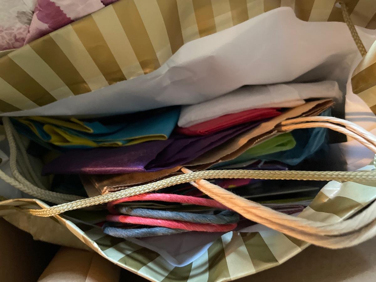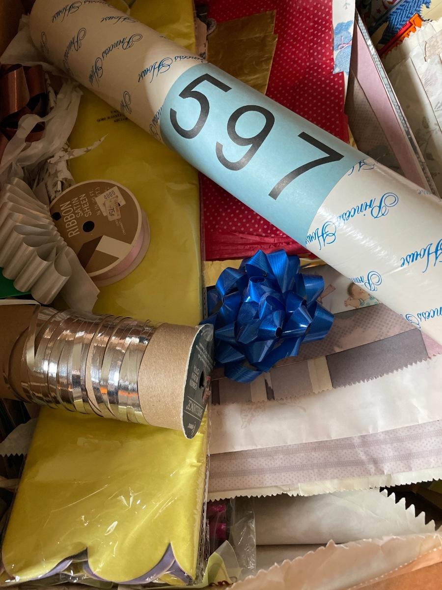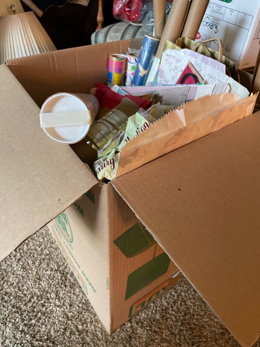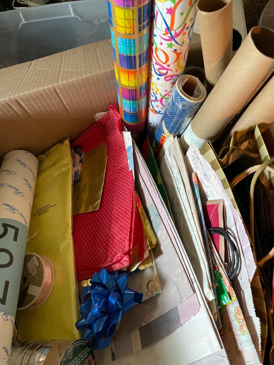 Large box full of gift bags, wrap, bows & ribbon