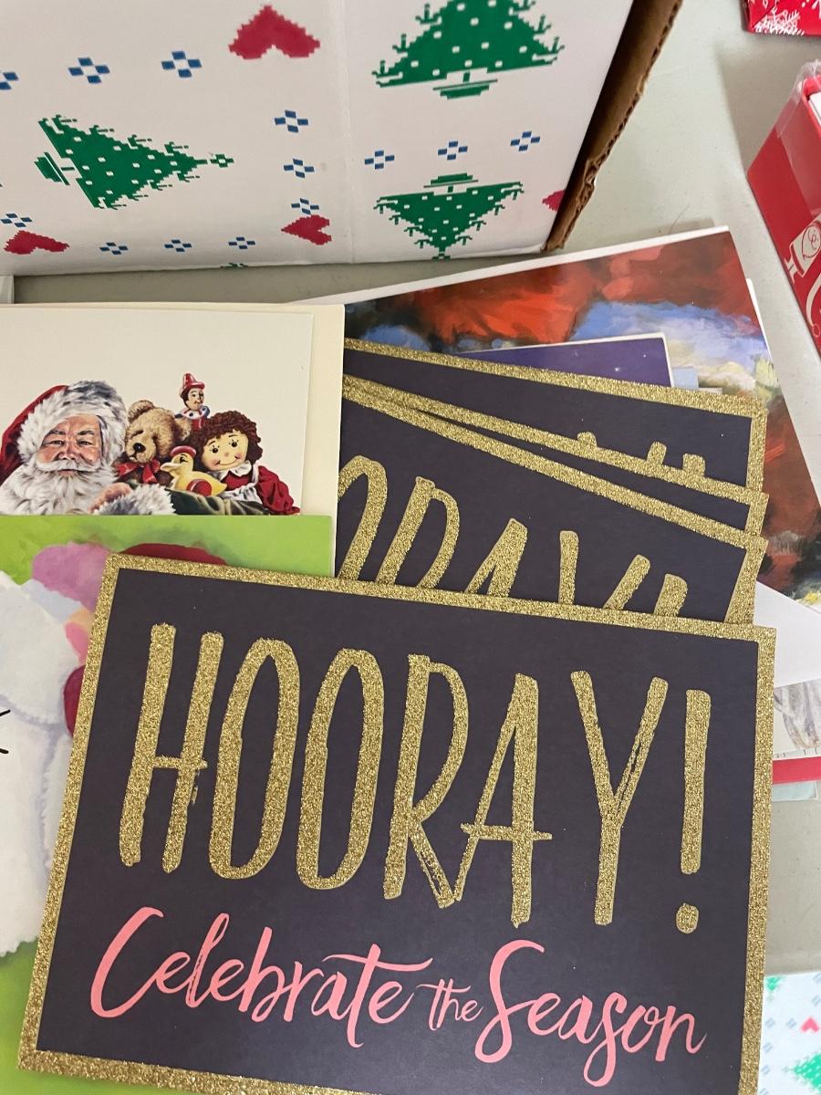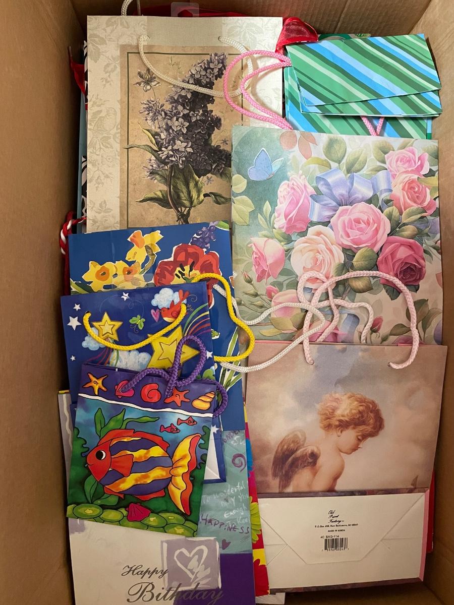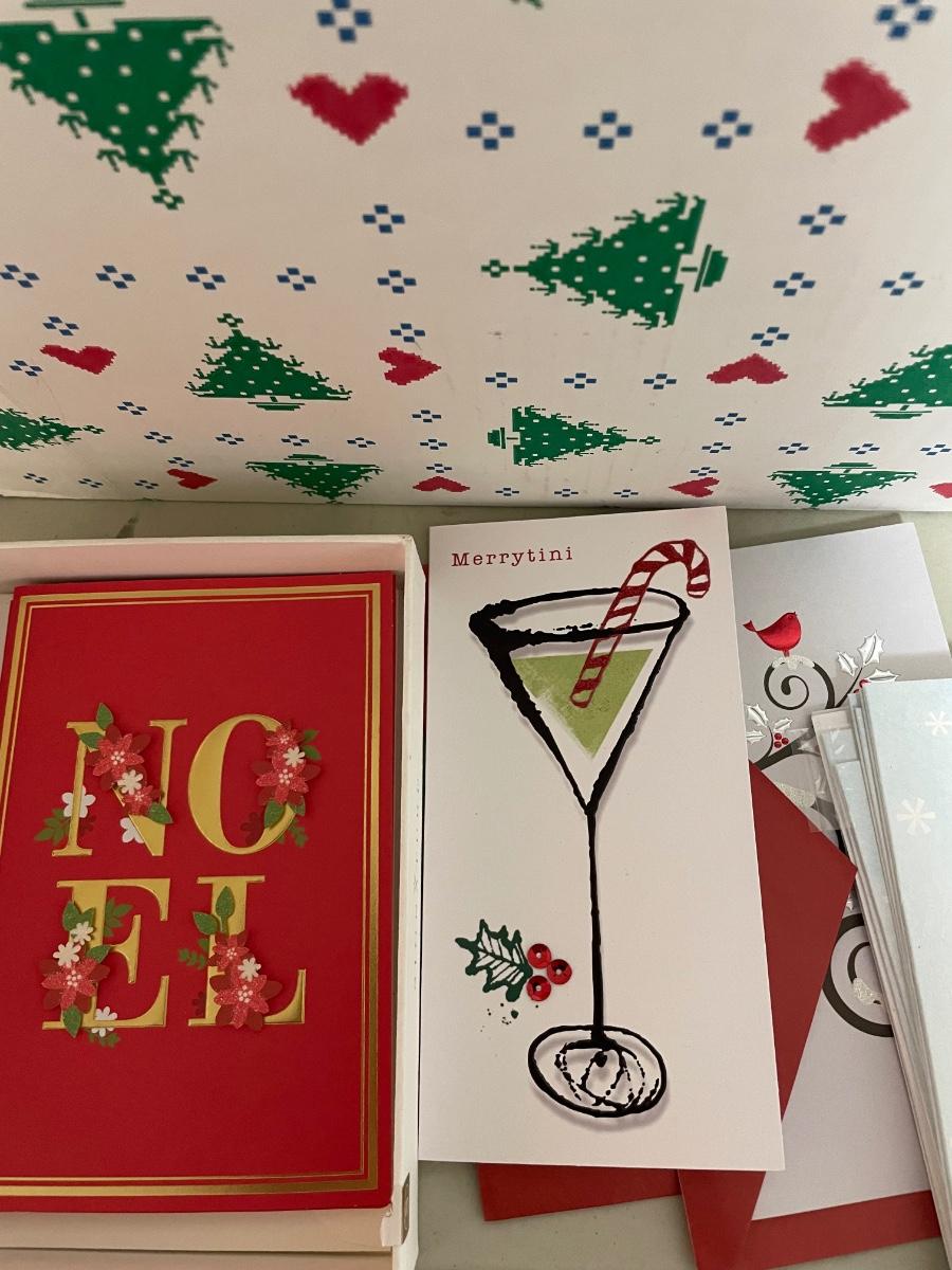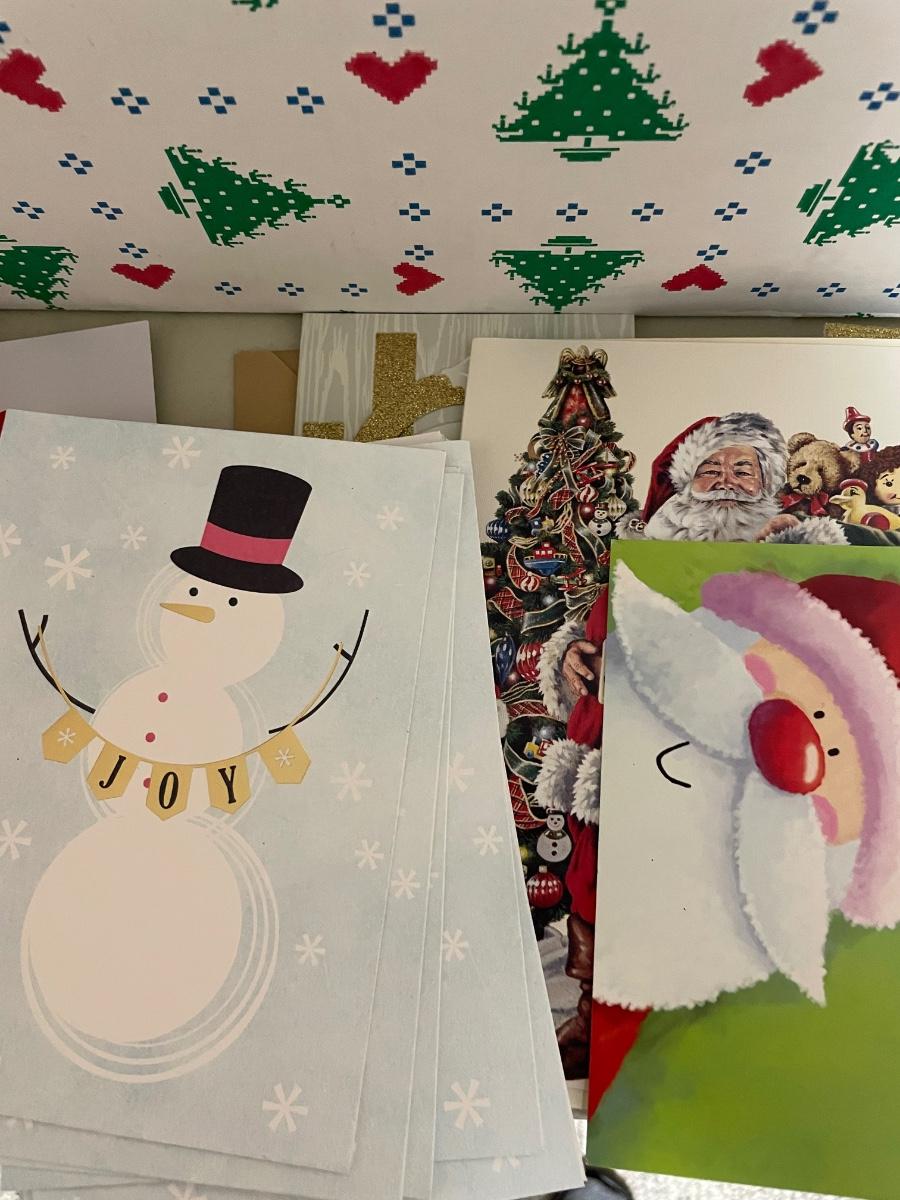 Assorted holiday cards. Many sizes of gift bags.