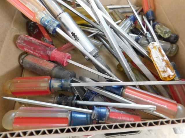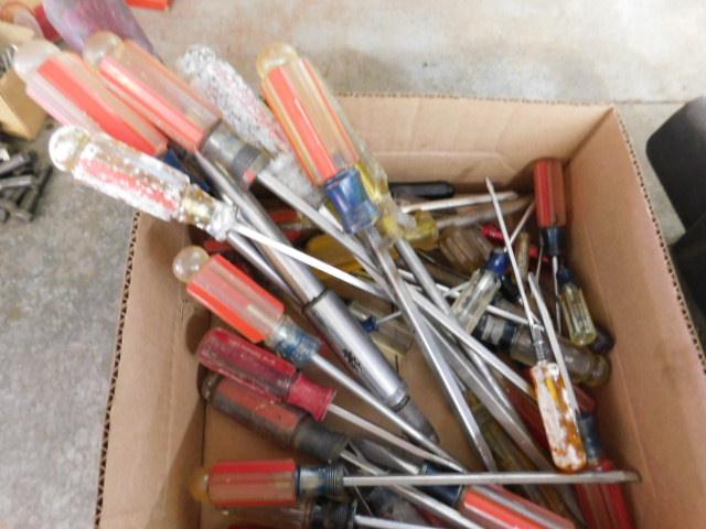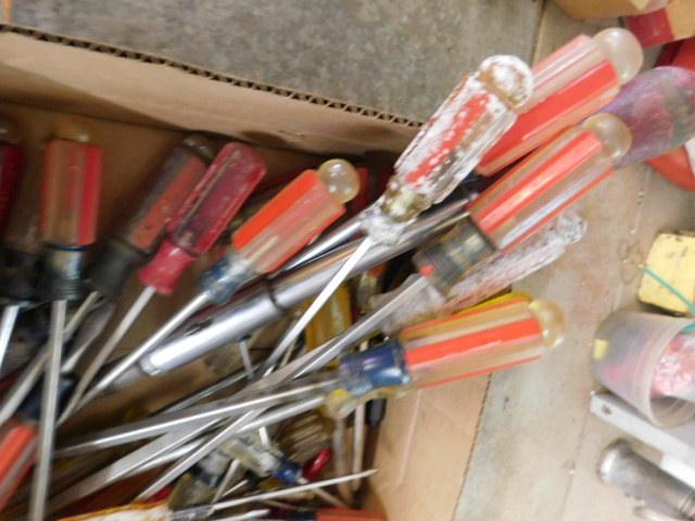 Large Box Full of Various Sized Screw Drivers Flat and Phillips Head