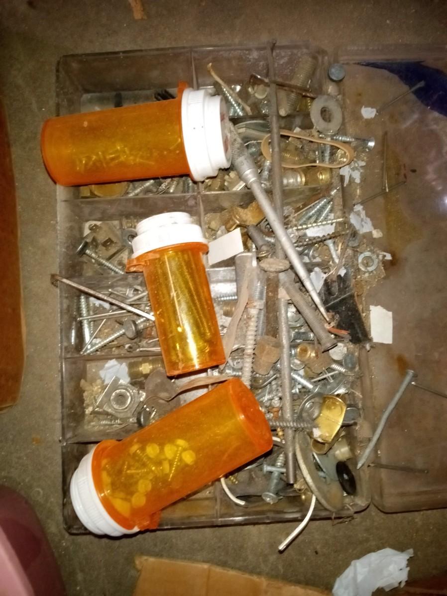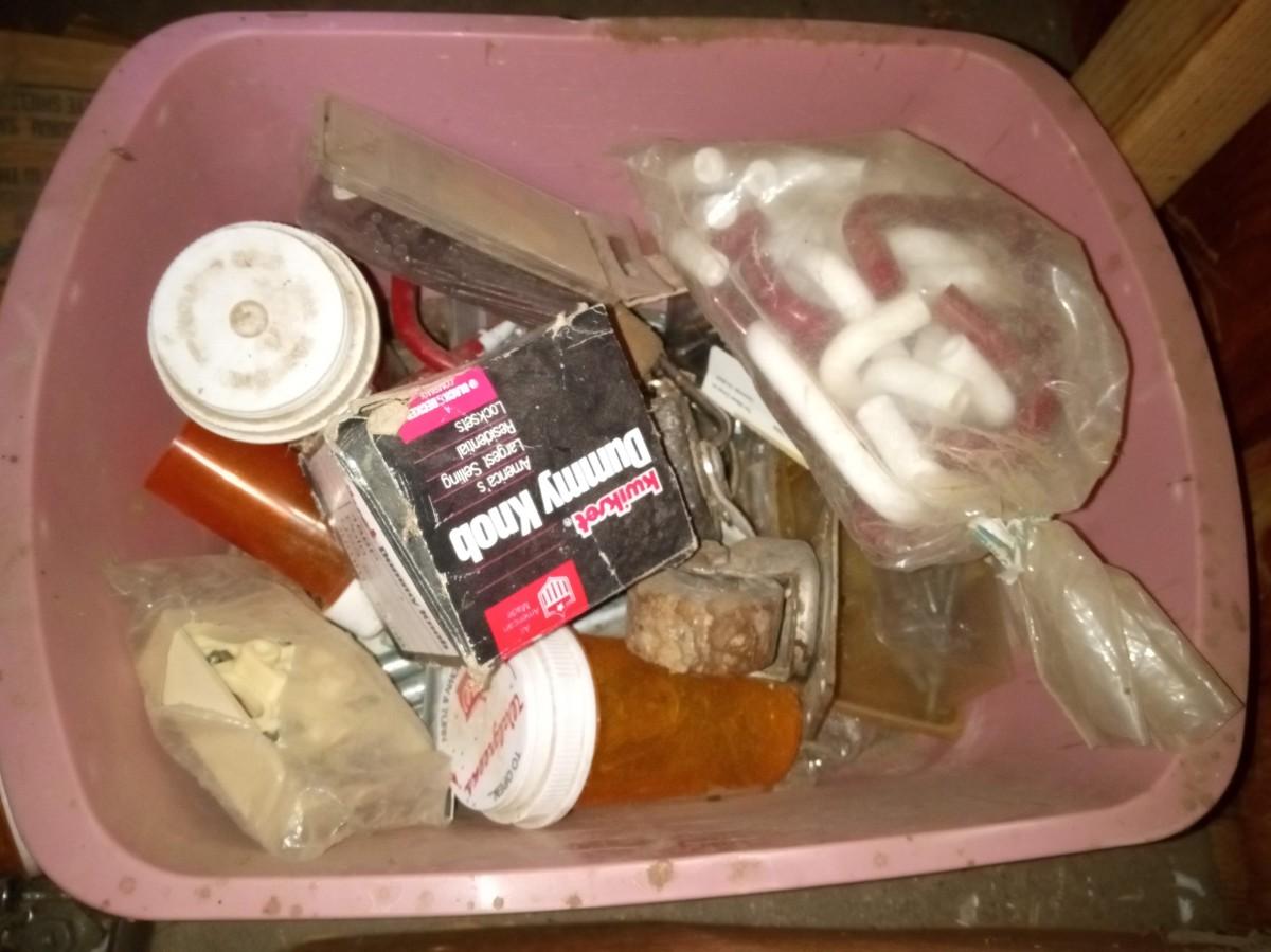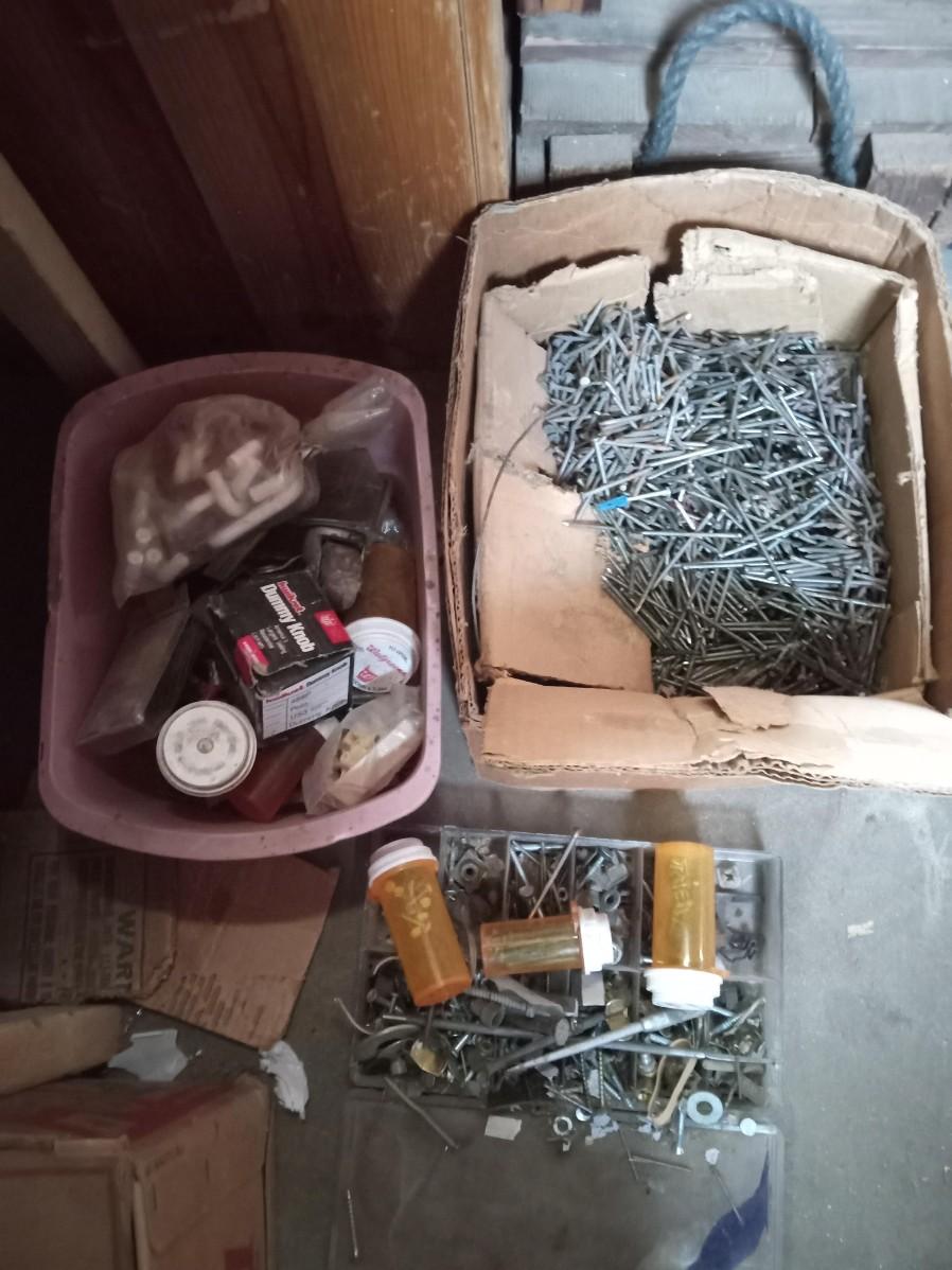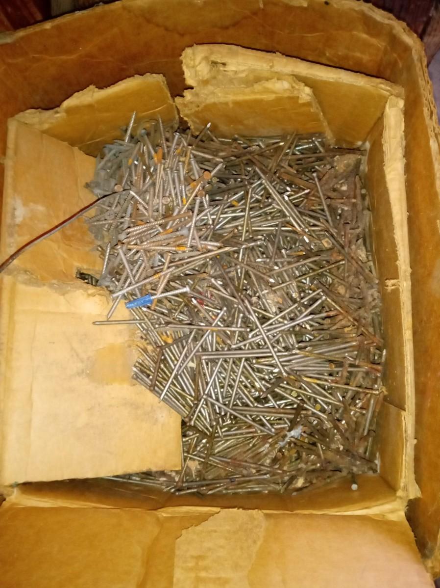 LARGE BOX OF 2 1/2" NAILS AND OTHER HARDWARE