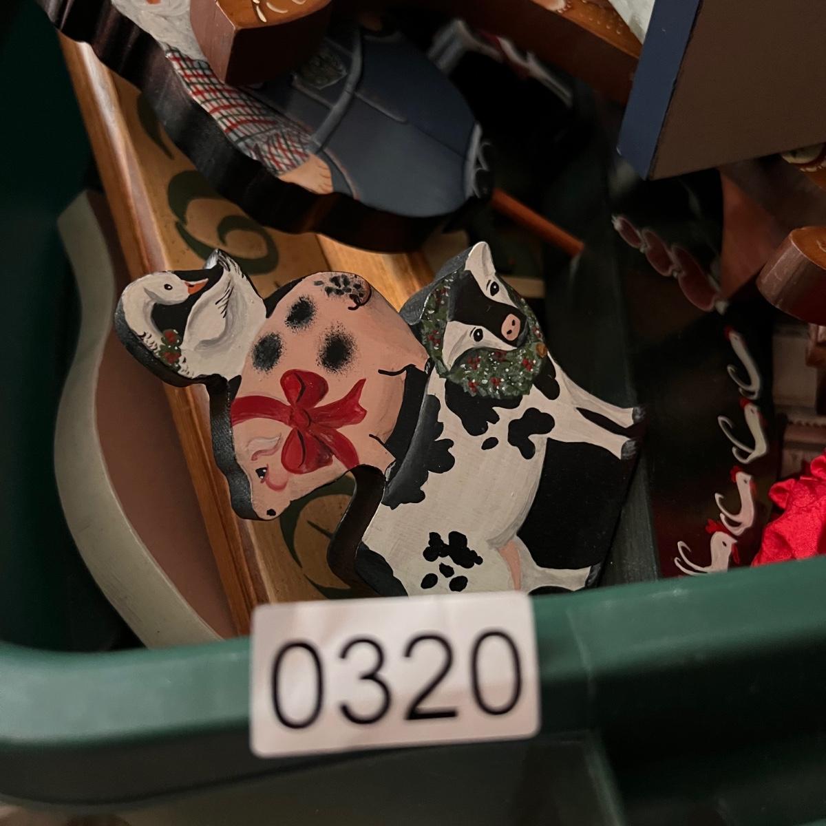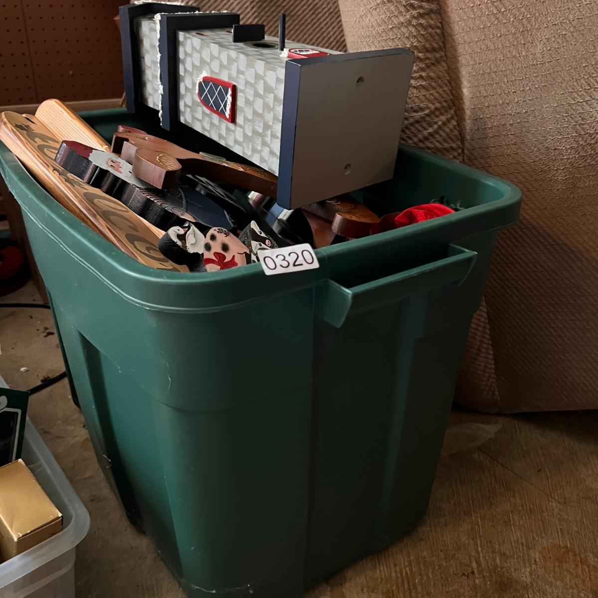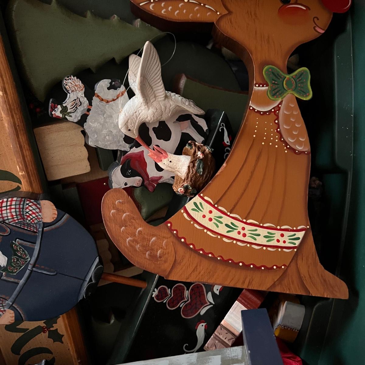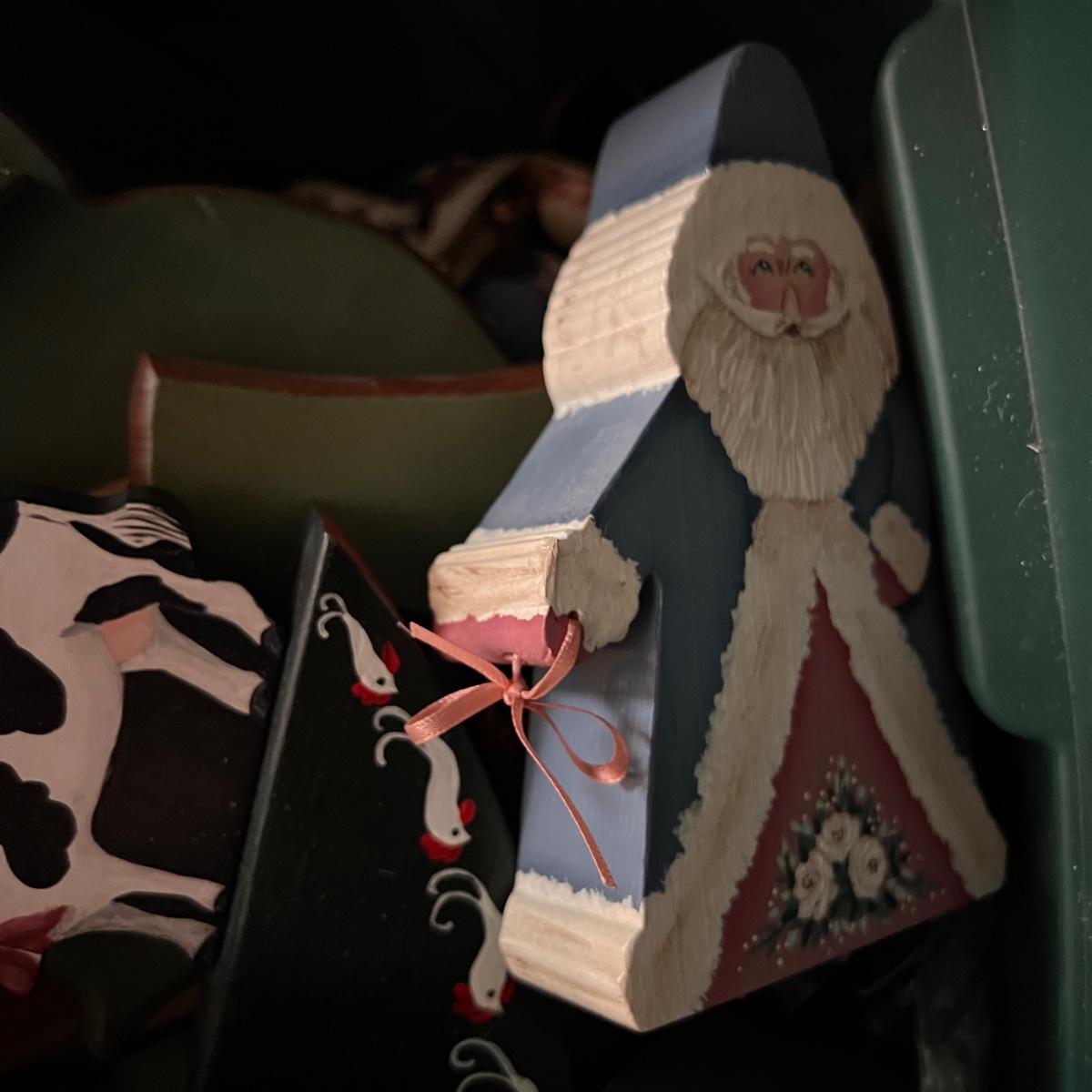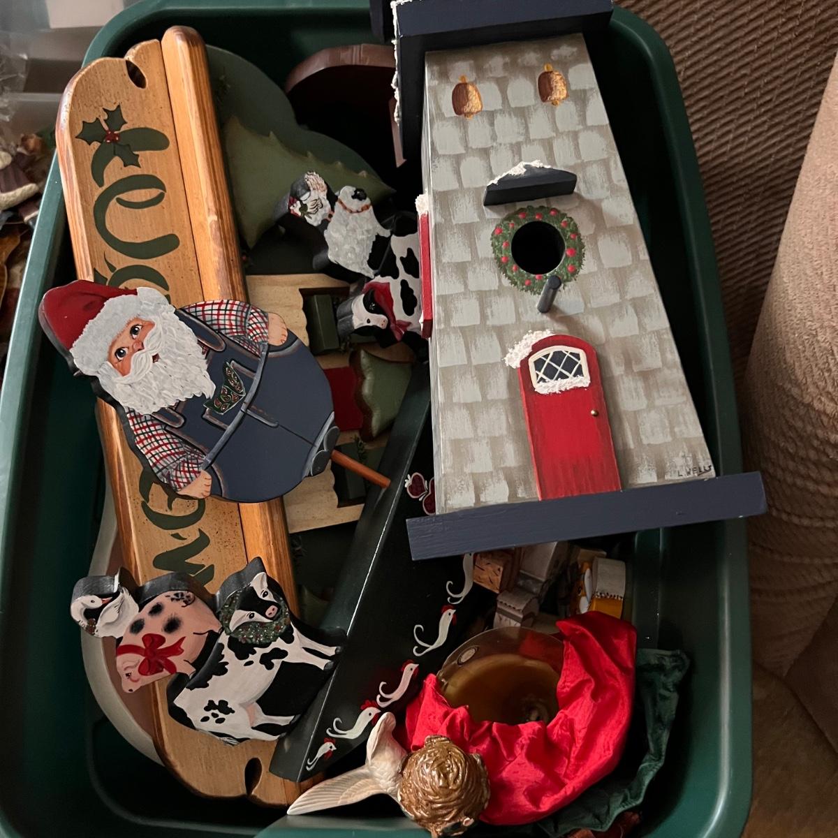 Large bin full of painted wooden holiday and Christmas decorations.