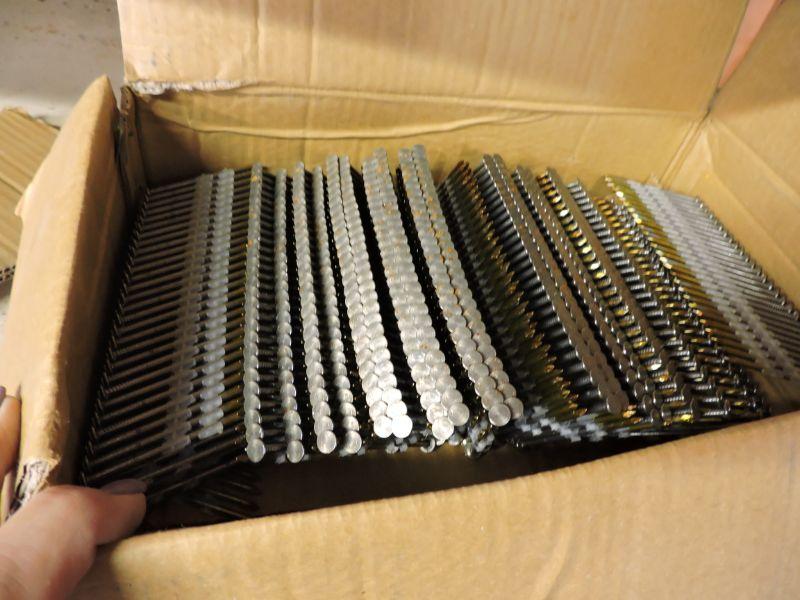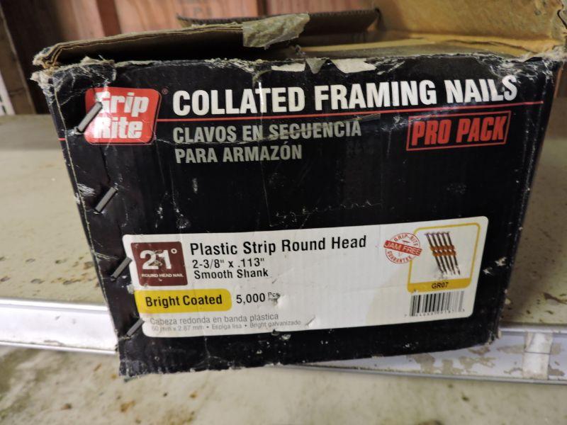 3/4 full box of bright coated plastic strip round head 2 3/8" x .113 smooth shank nails. Please read Terms and Conditions before placing a bid. Pick up is Friday, October 25th between 4 and 7, and Saturday, October 26th between 9 and 1. Please bring boxes, tools, and muscle to help move your items. Props included in photos are not included in listing. All measurements are approximate.