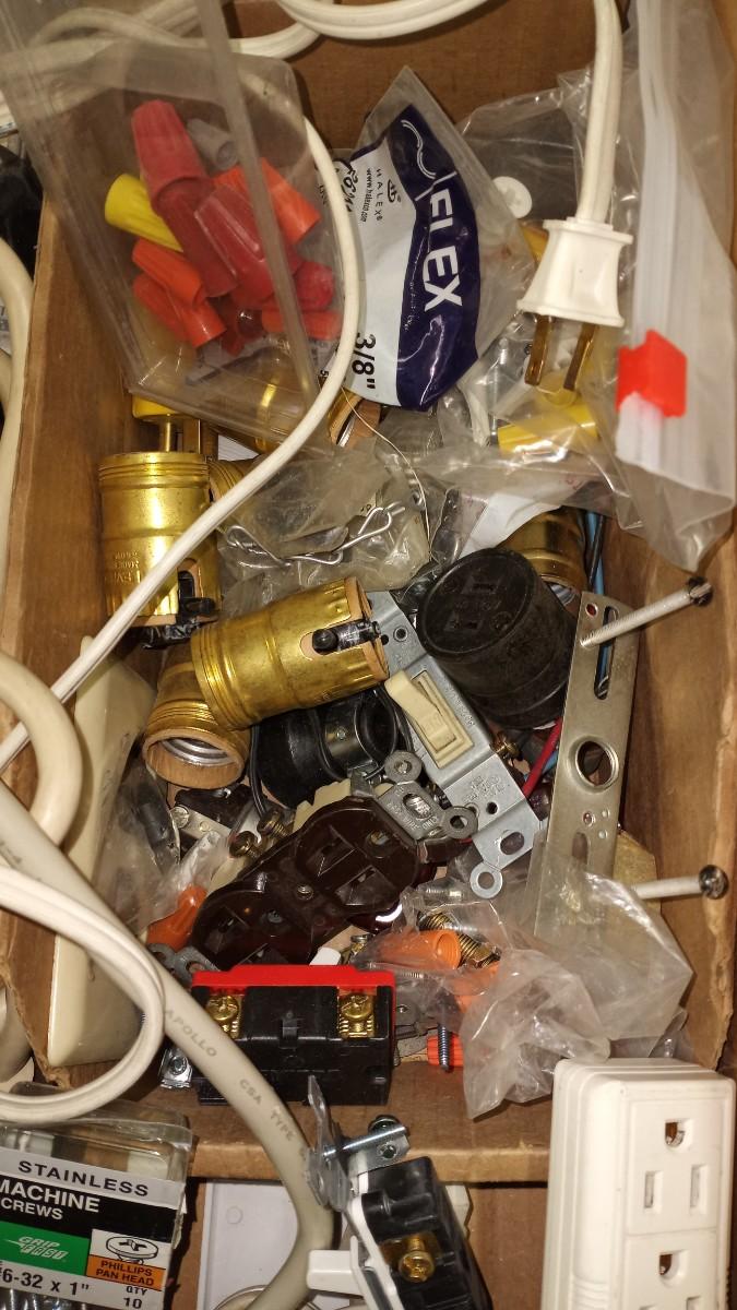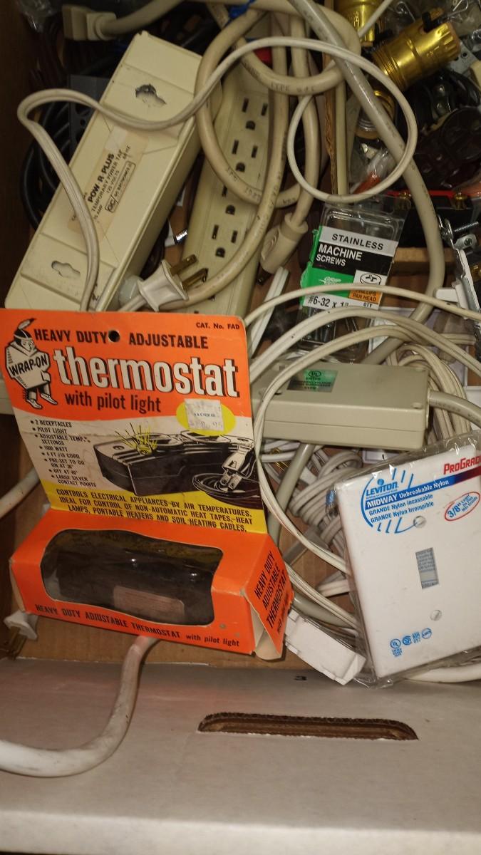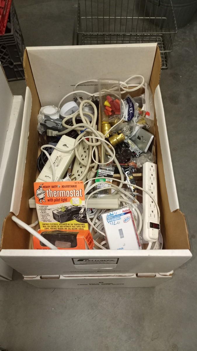LARGE BOX OF ELECTRICAL OUTLETS-WIRE-THERMOSTAT & MORE
