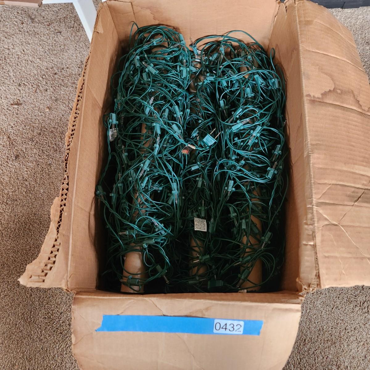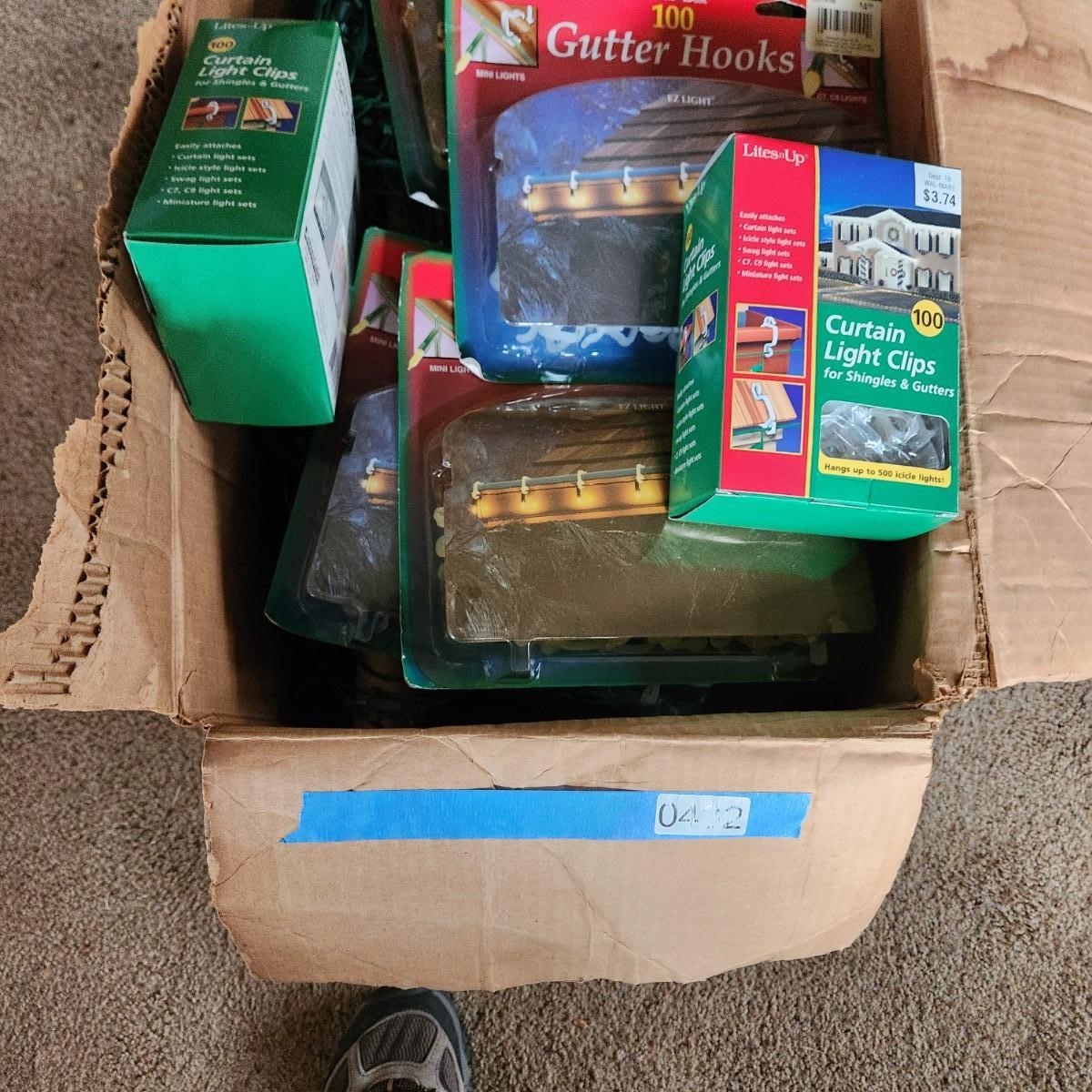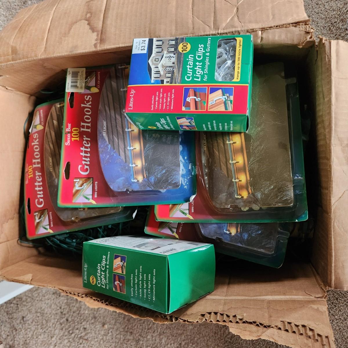Large box of String Christmas Lights Sets with Boxes of Gutter Hooks & Extension Cords