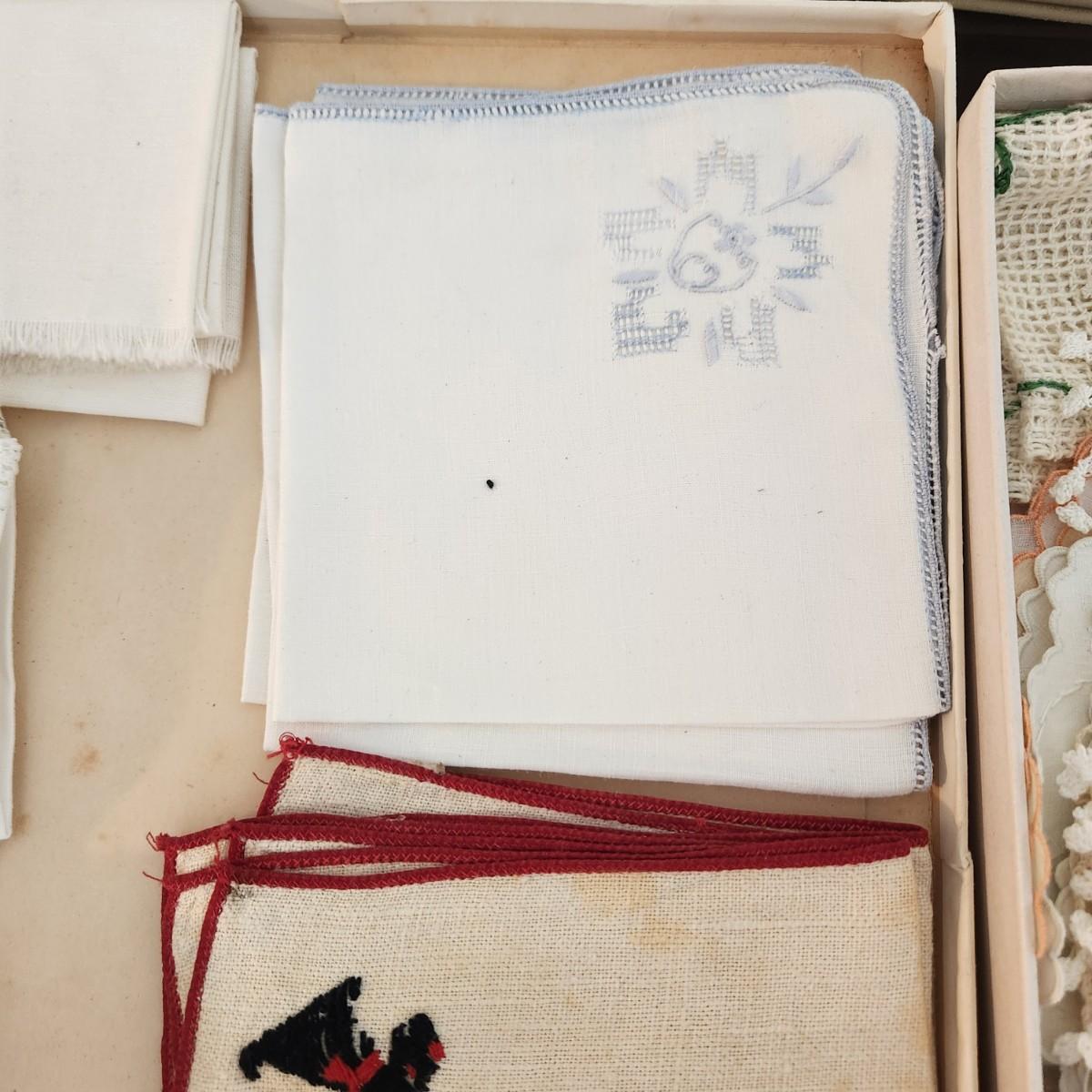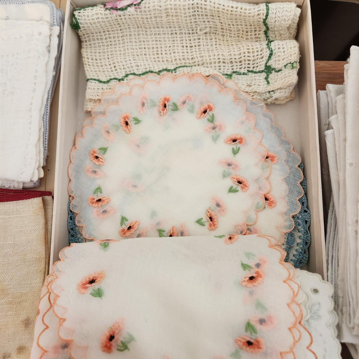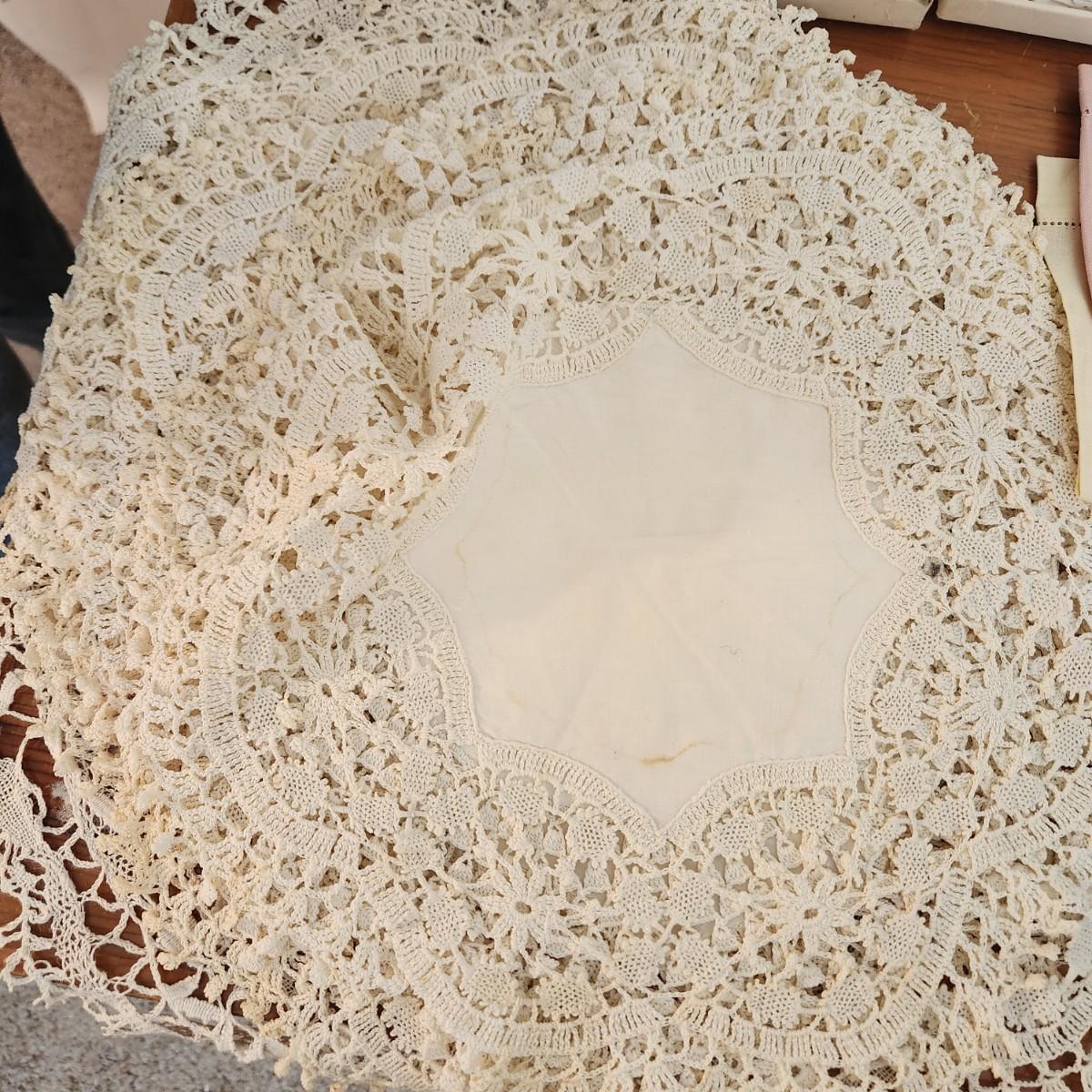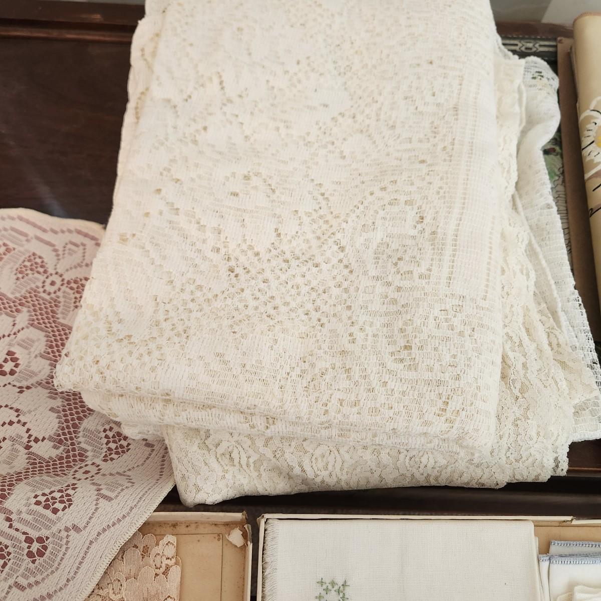 Large Box of Vintage Linens  Lace, Table Cover, Cocktail napkins