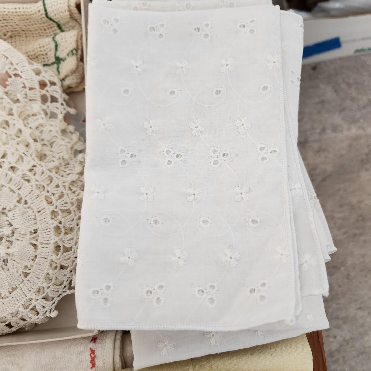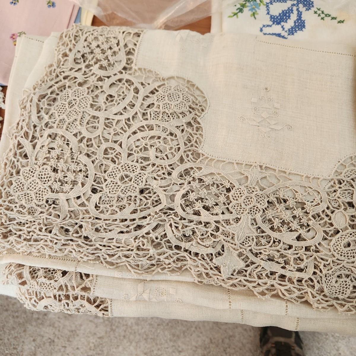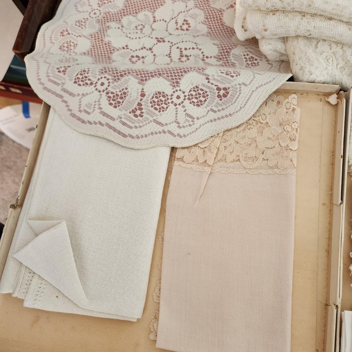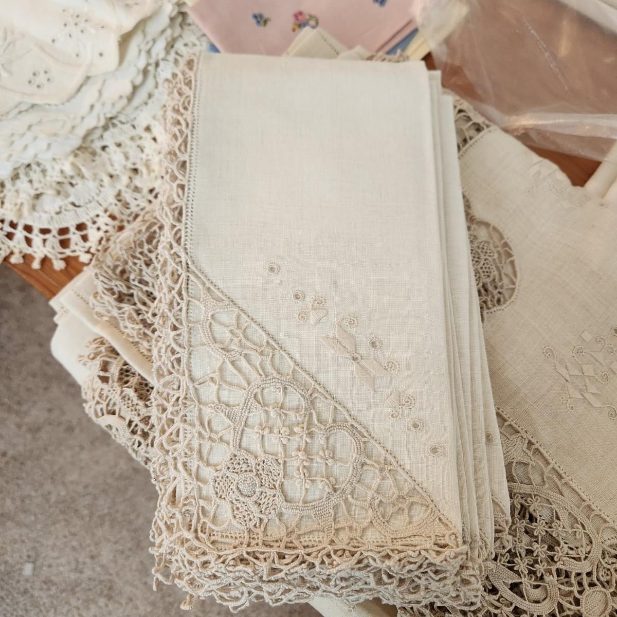 Large Box of Vintage Linens Lace, Table Cover, Cocktail napkins