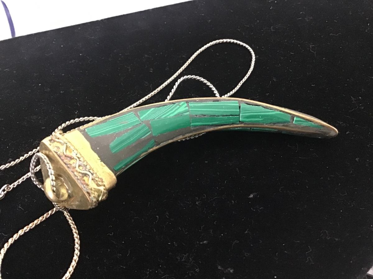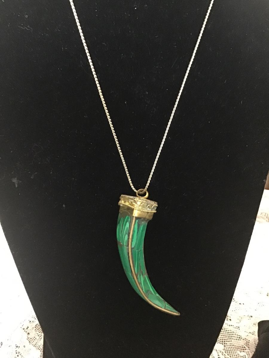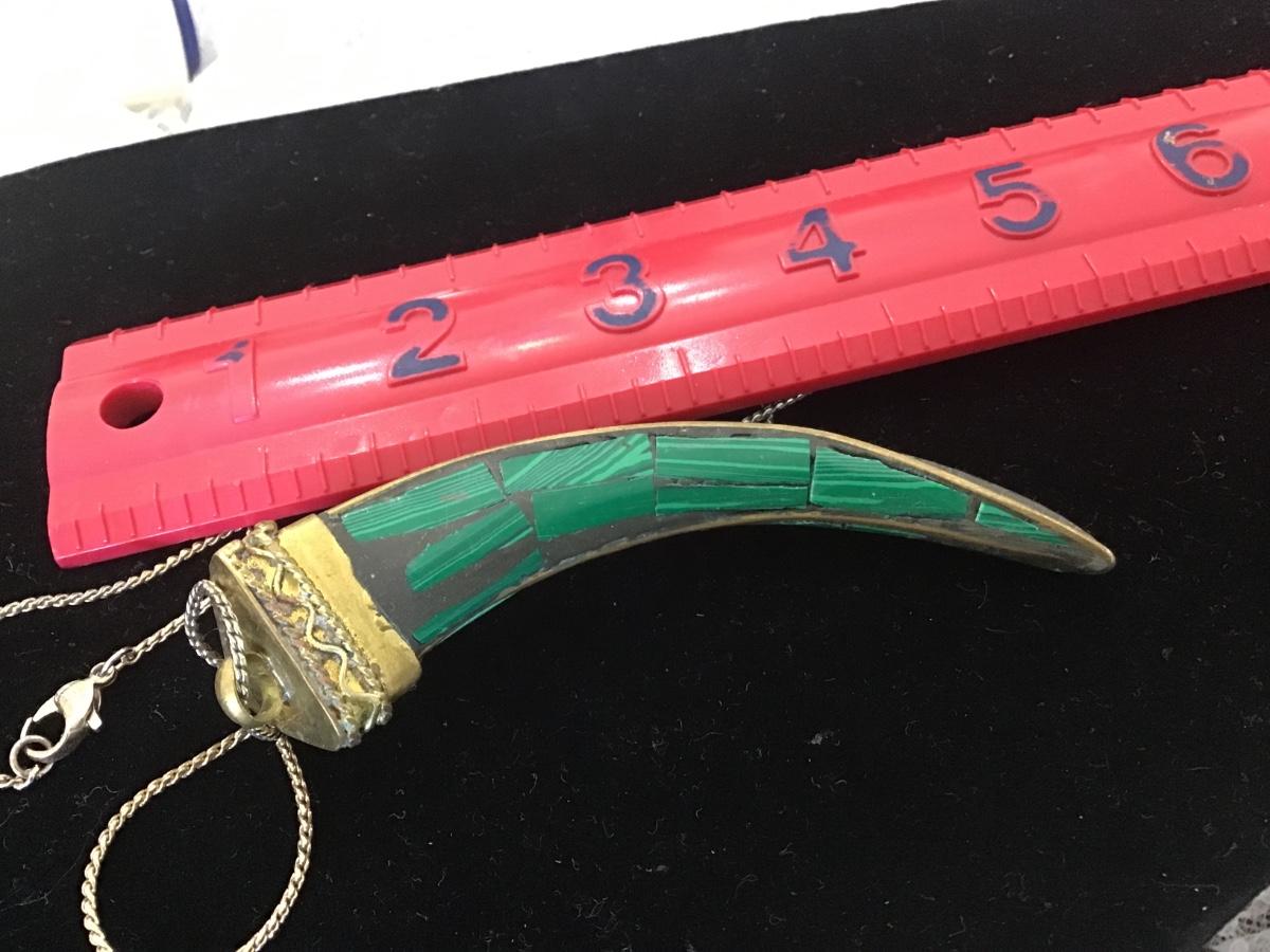 Large Brass Curved Tooth Shaped Pendant Inlaid With Malachite Slices, On A Necklace