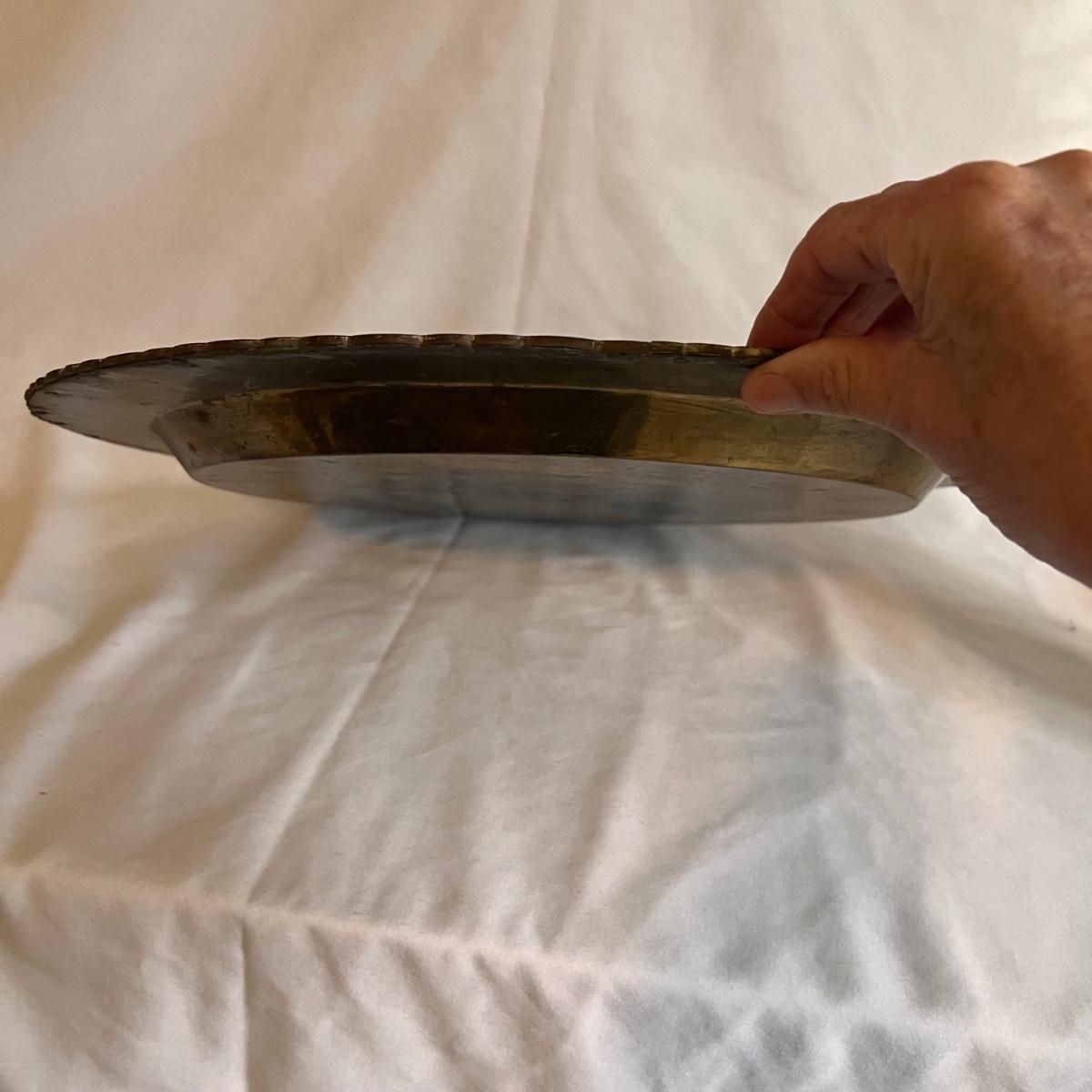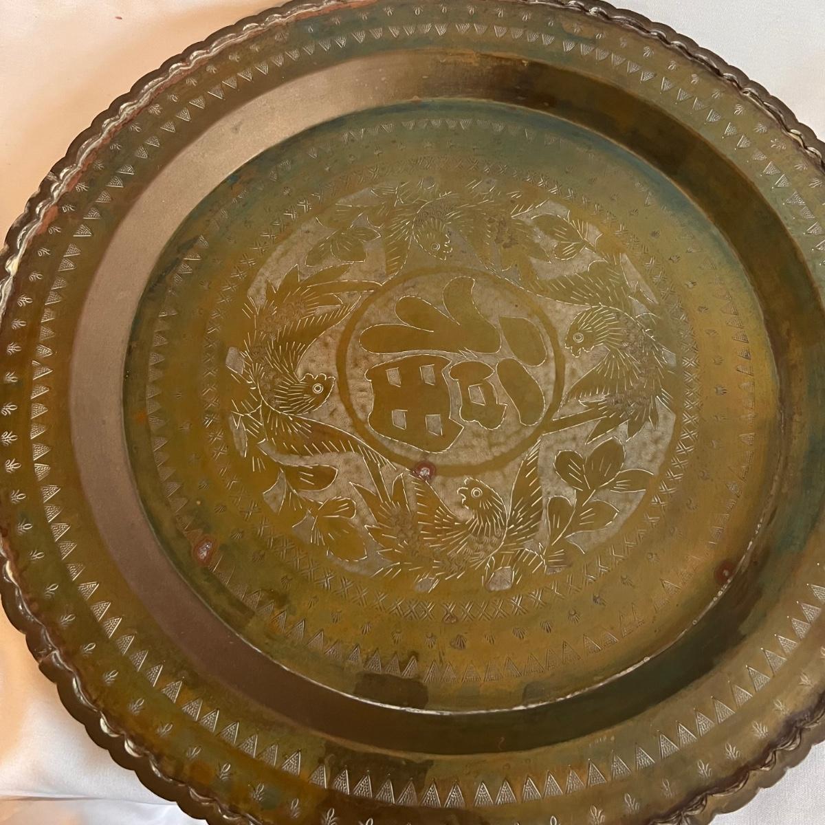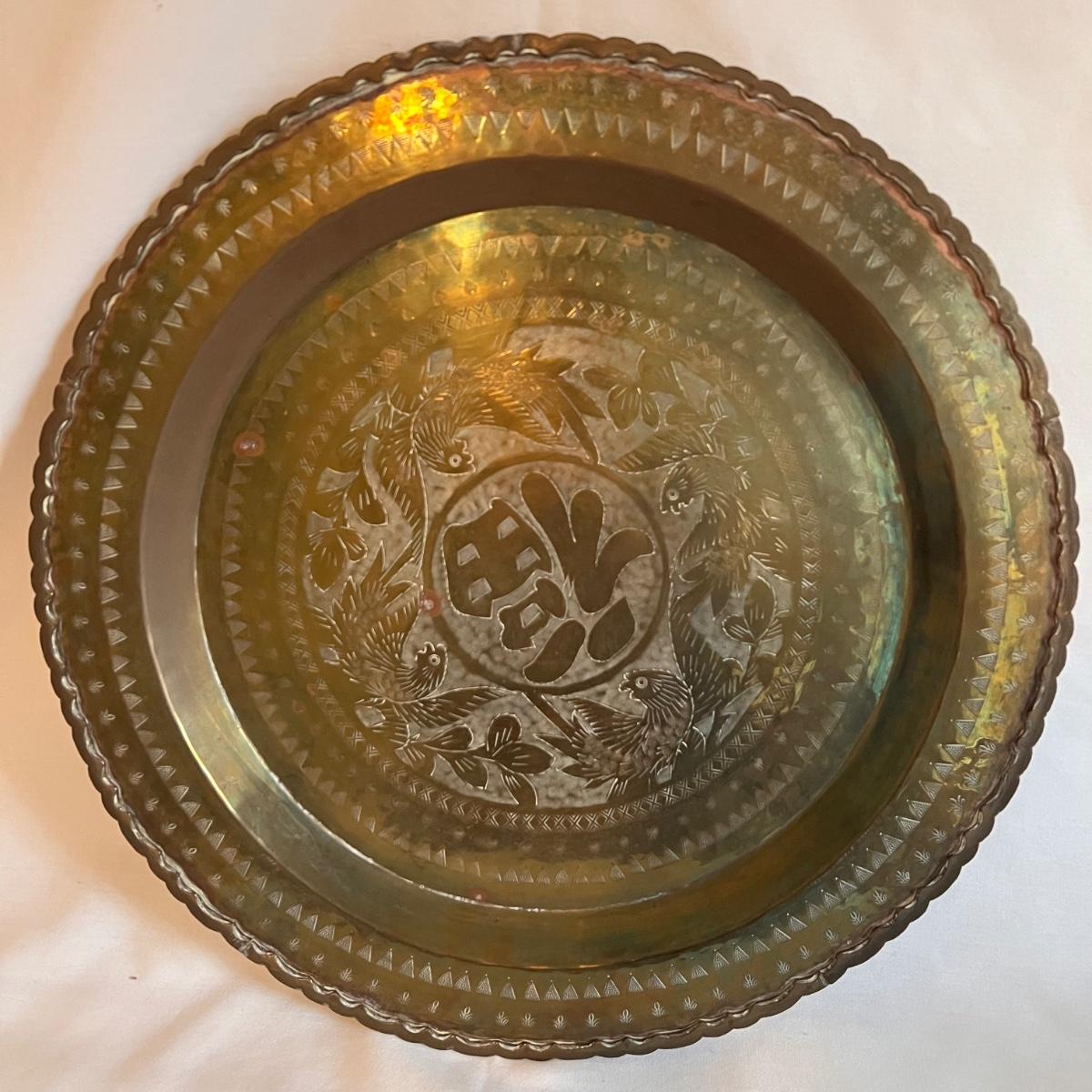 This large brass plate has hardware to hang if desired. It features what appears to be engraved birds and the plate has a scalloped rim. Three red spots of tarnish are shown in pics. Measures 18”D x 1”H.