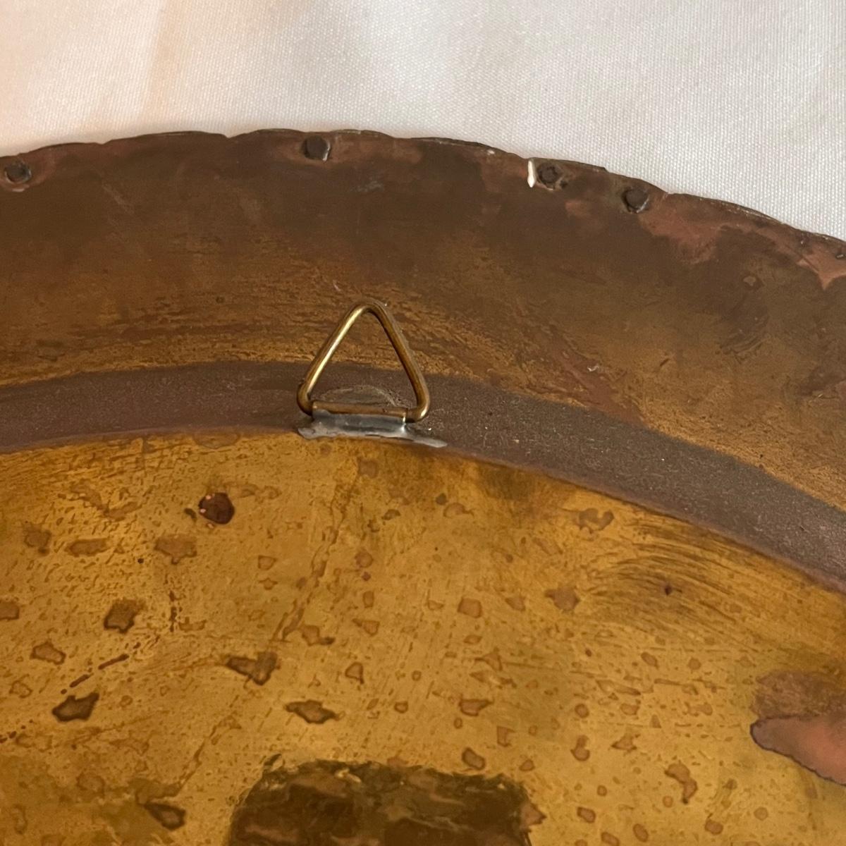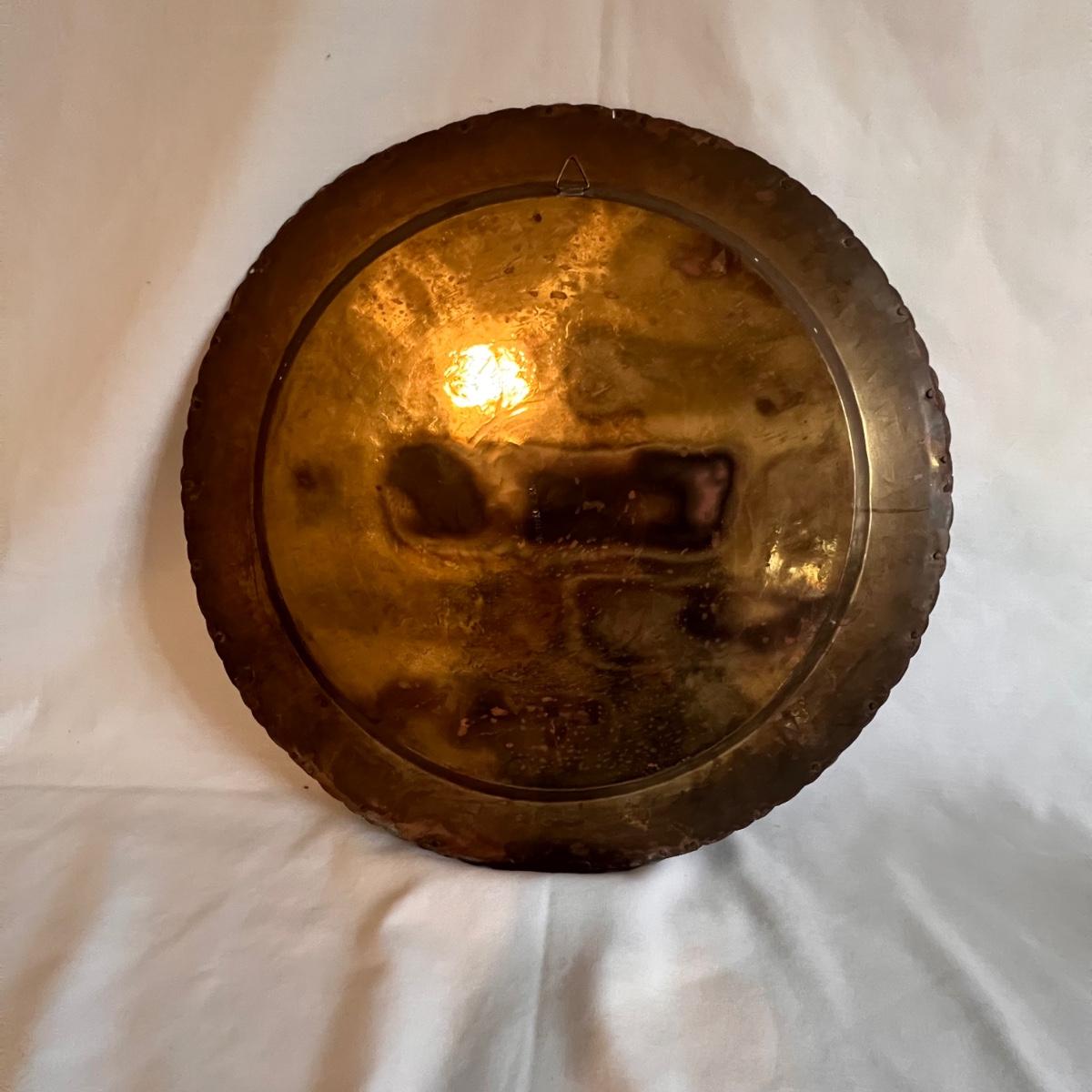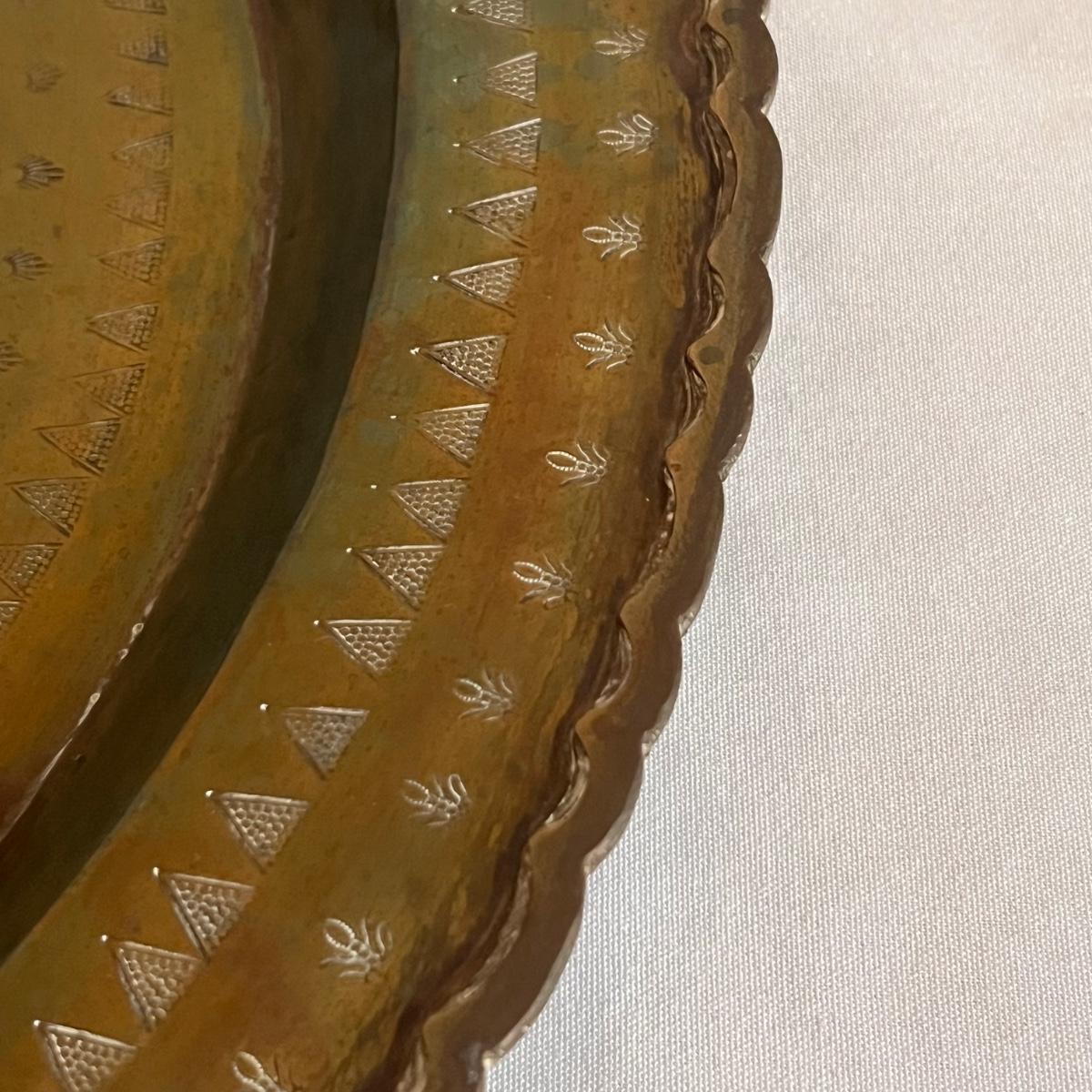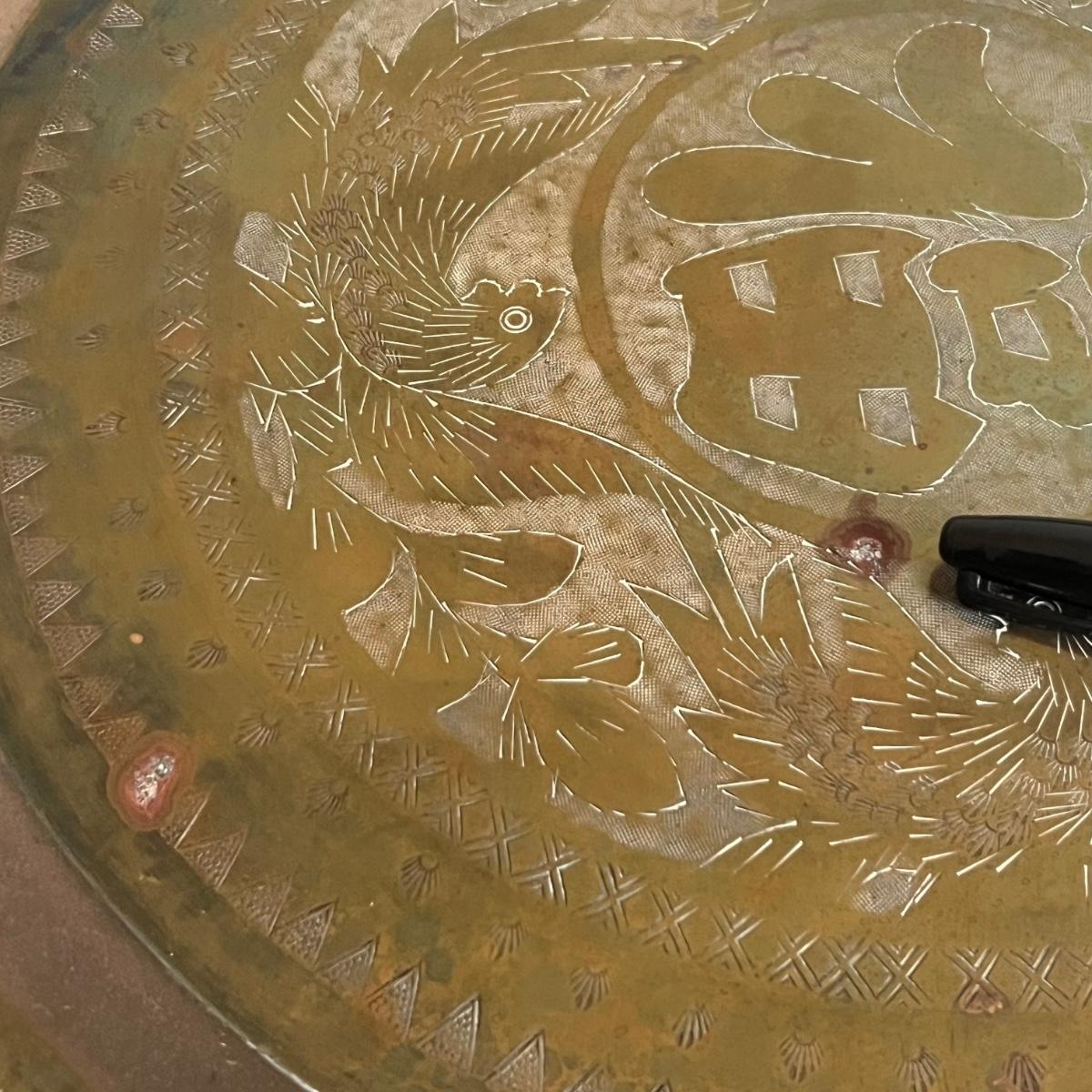 This large brass plate has hardware to hang if desired. It features what appears to be engraved birds and the plate has a scalloped rim. Three red spots of tarnish are shown in pics. Measures 18”D x 1”H.