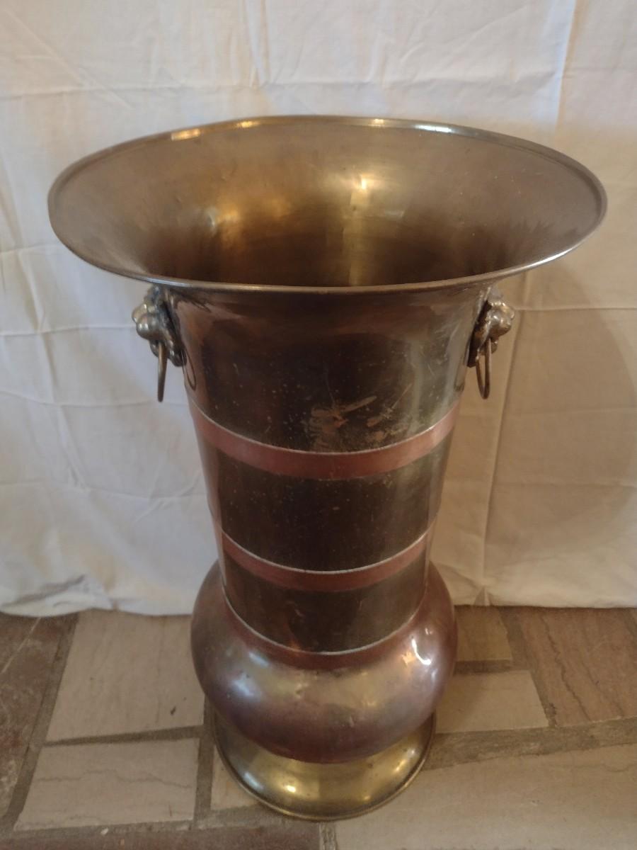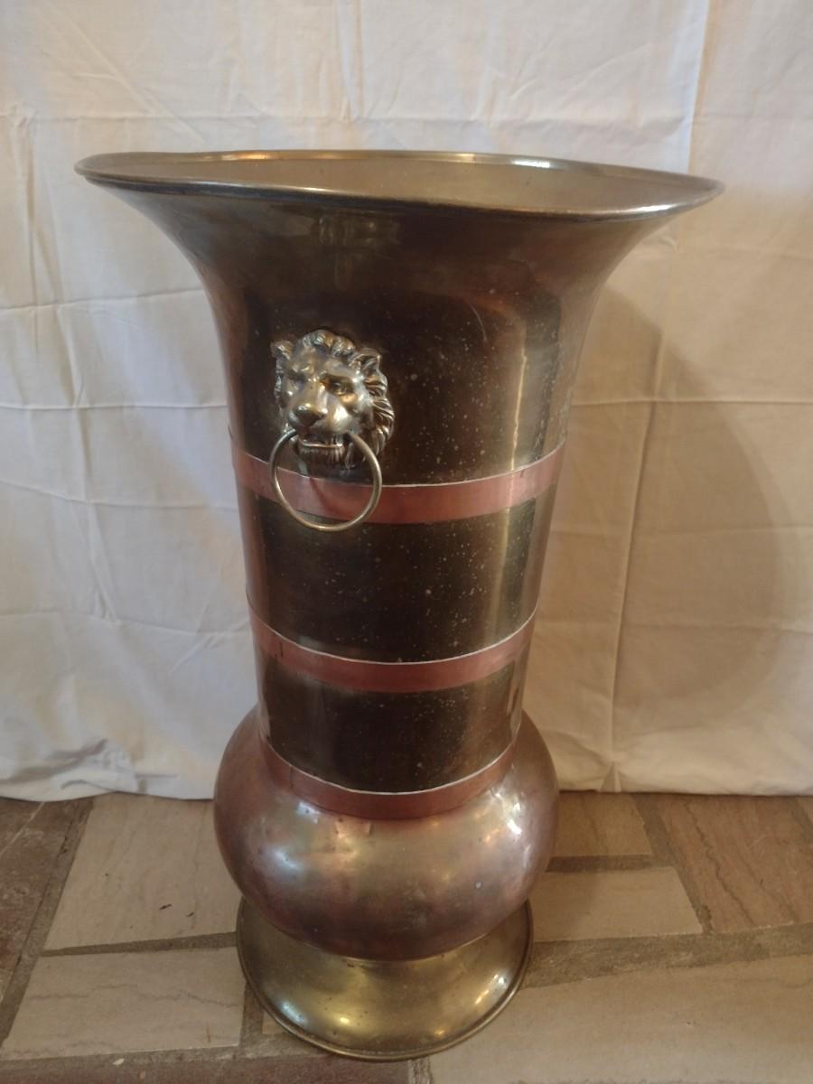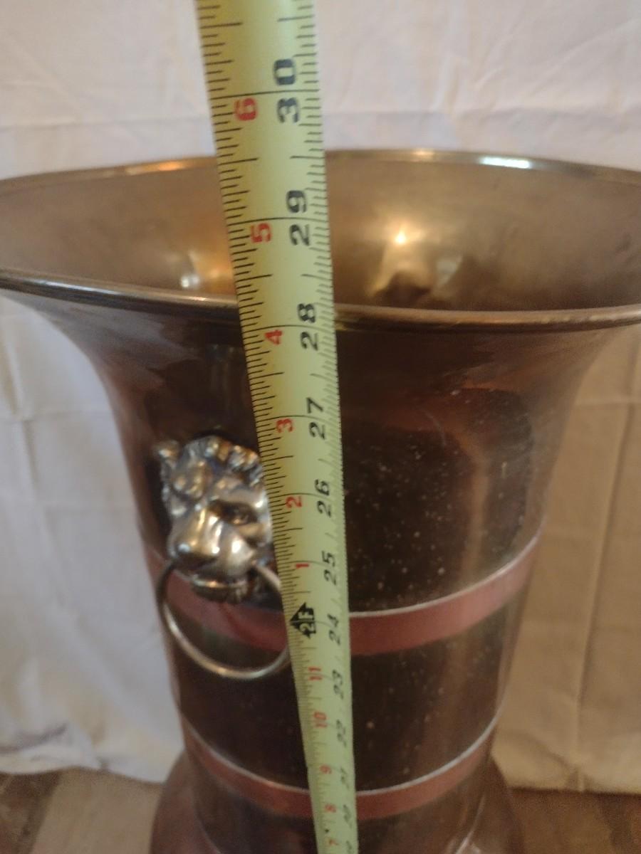 Large Brass Floor Vase with Lion Head Handles
