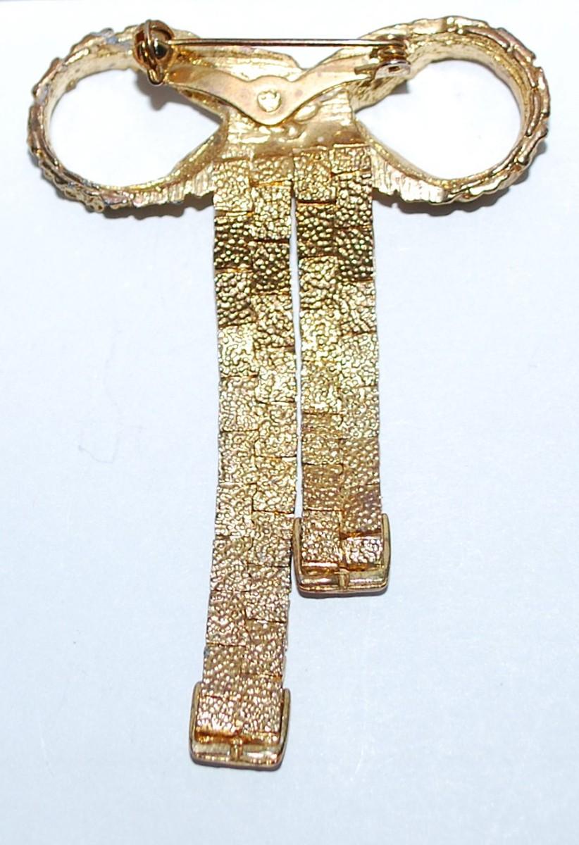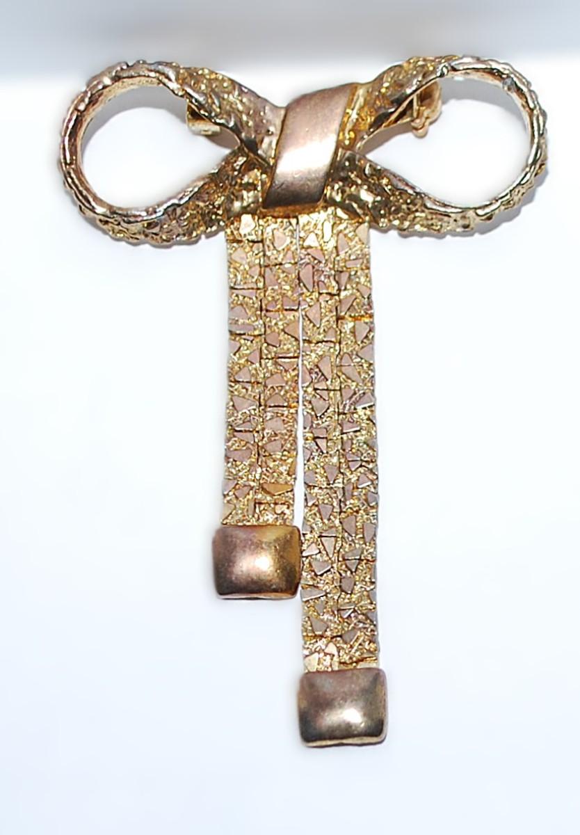 Large Brass-Style BOWTIE BROOCH (3" x 2") with Segmented Movable Dangle Ribbons on a Dark "Brass" Setting