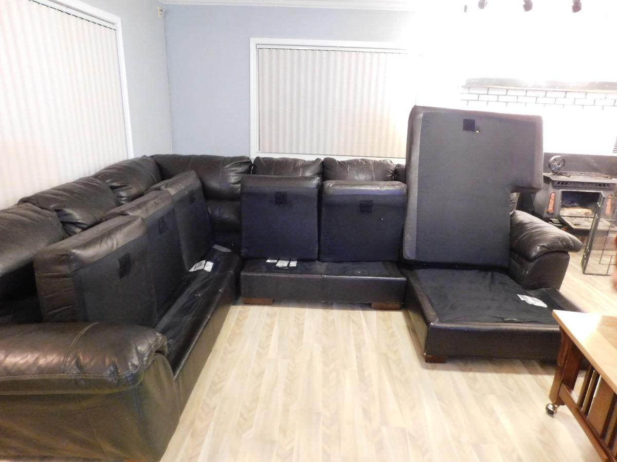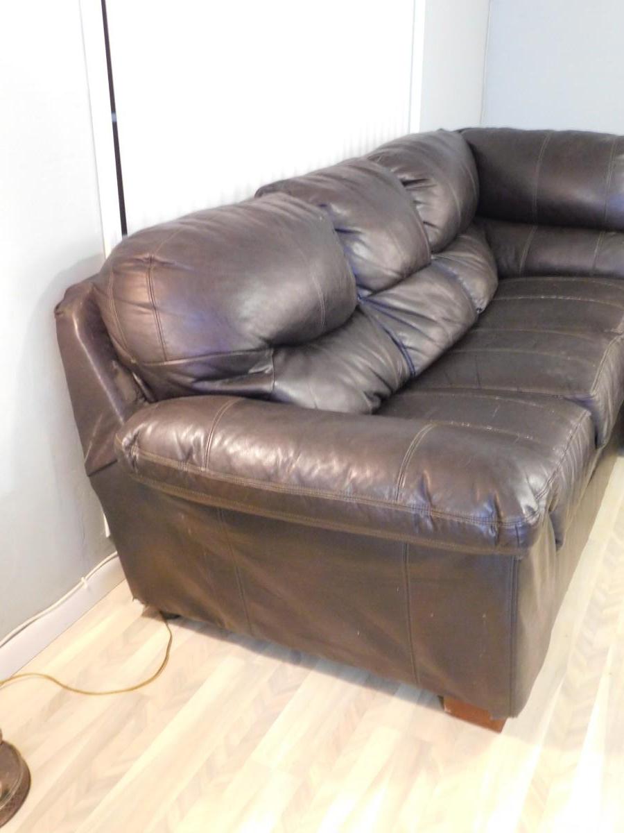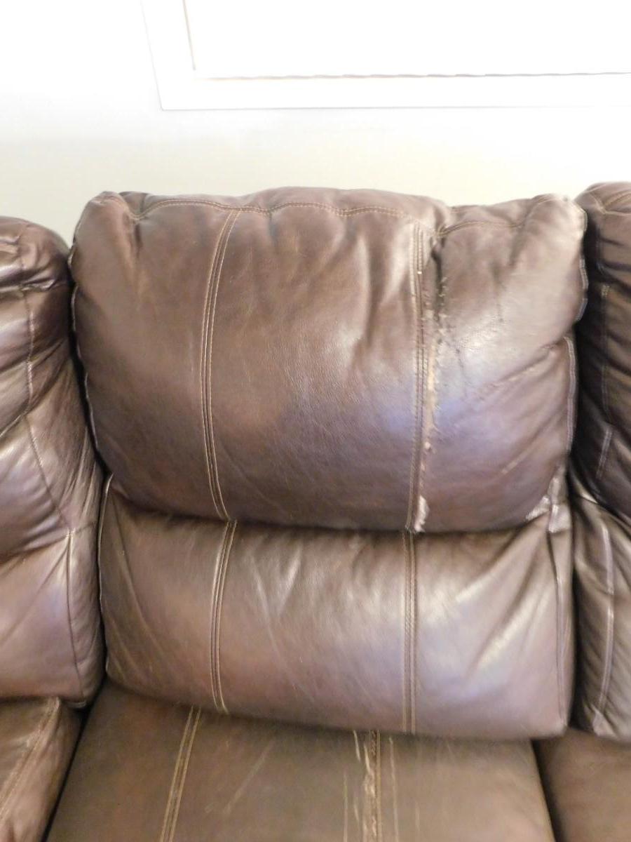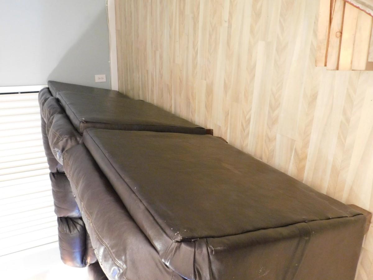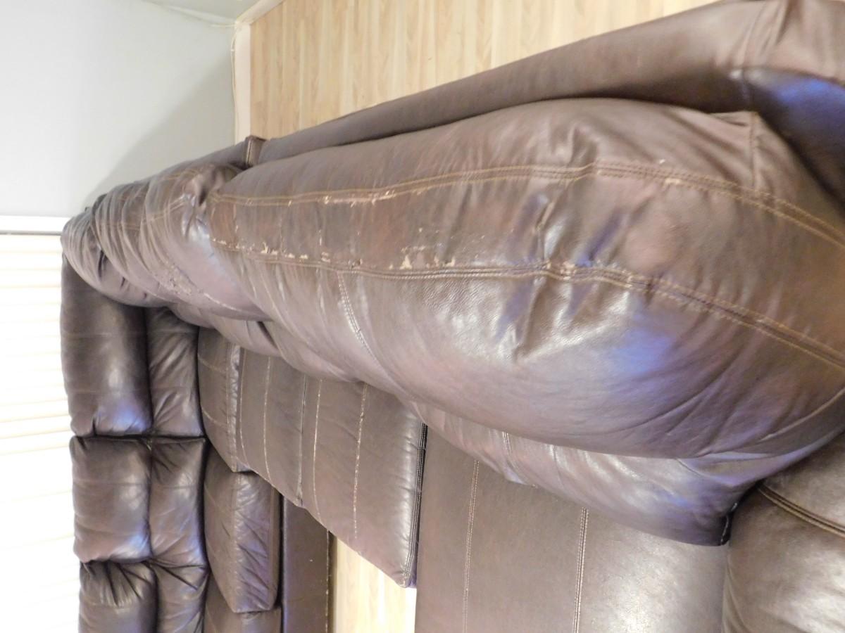 BIG COMFY COUCH, BROWN VINYL EXTERIOR. THERE IS SOME WEAR ON THE COUCH (AS PICTURED) BUT THERE IS STILL A LOT OF MILES LEFT ON THIS ONE. MEASURES ??
