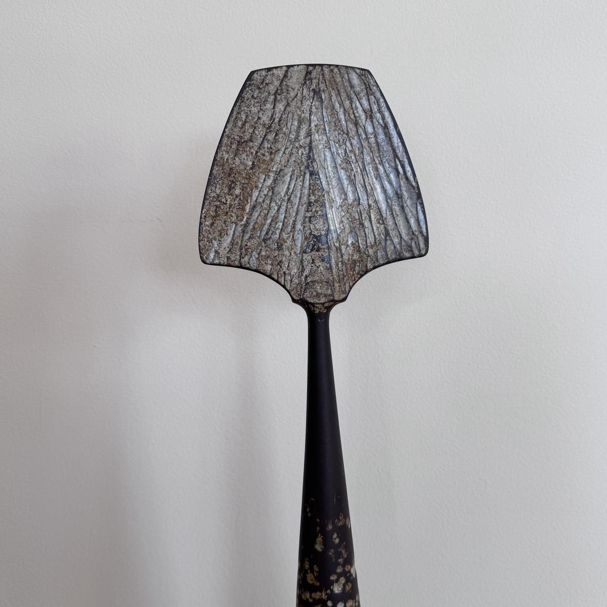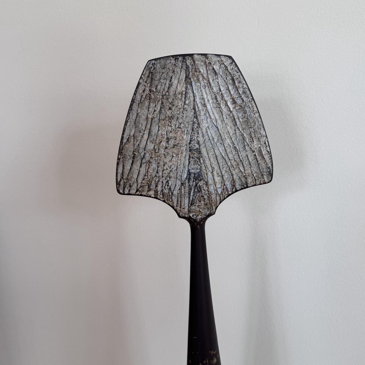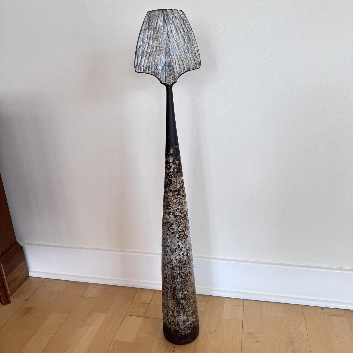 This lot includes one large brutalist-like cast iron sculpture. The sculpture has a lovely carved texture to it - see pictures included. The base of the sculpture is hollow. It measures 6.25” x 4” x 36”H. This piece is heavy!
