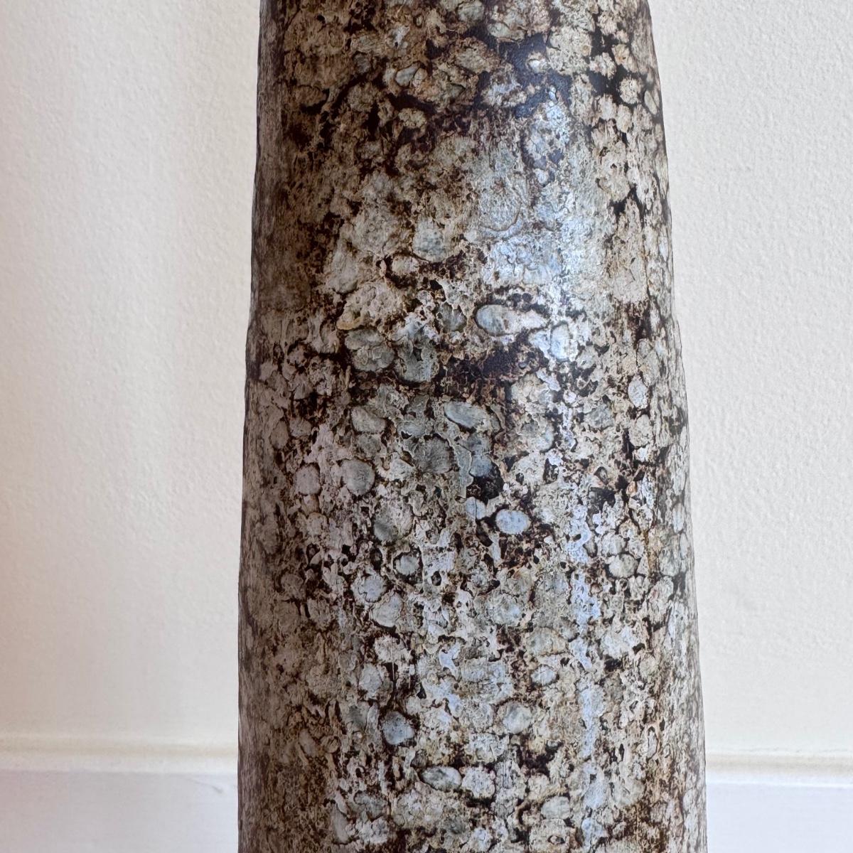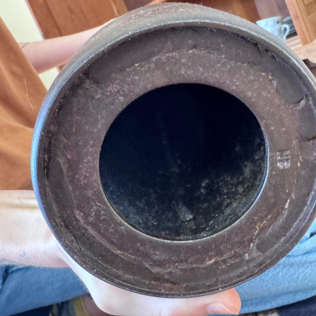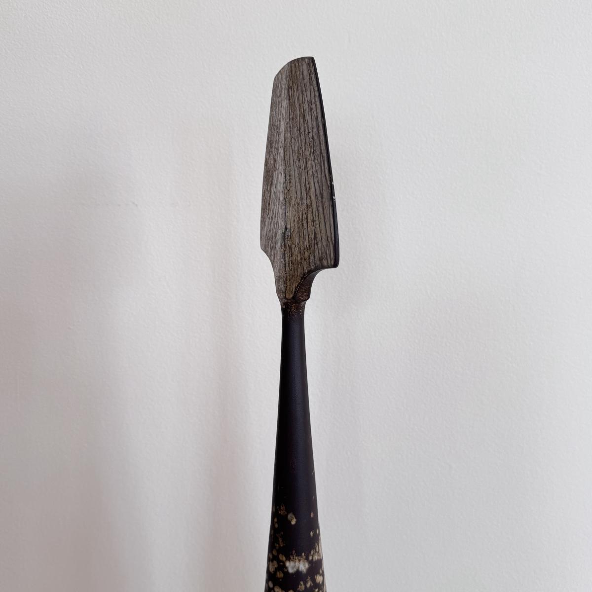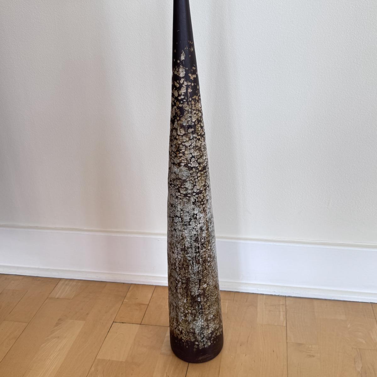 This lot includes one large brutalist-like cast iron sculpture. The sculpture has a lovely carved texture to it - see pictures included. The base of the sculpture is hollow. It measures 6.25” x 4” x 36”H. This piece is heavy!