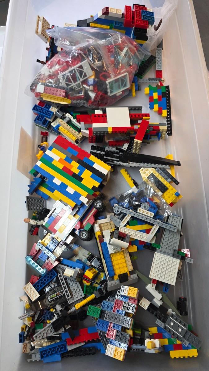 This lot features a large, fully packed 10" x 10" x 10" box of genuine LEGO pieces, including mixed loose bricks, partially assembled builds, structural panels, specialty pieces, wheels, windows, and assorted elements. The photos show the actual contents you’ll receive — a true builder’s treasure trove.